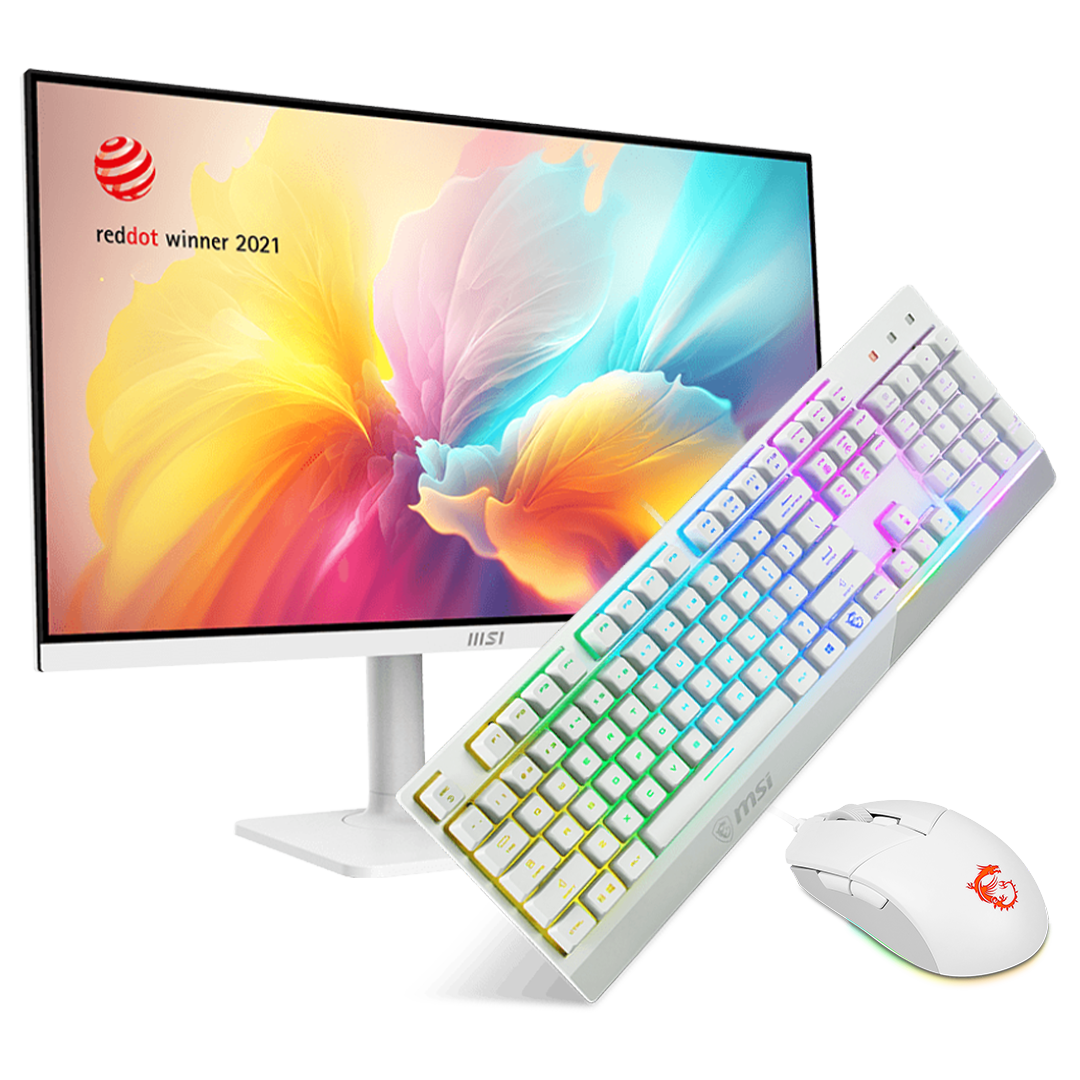 A crisp 27-inch IPS display paired with a water-repellent keyboard and a precise 5000 DPI mouse. Built for everyday work and after-hours sessions.