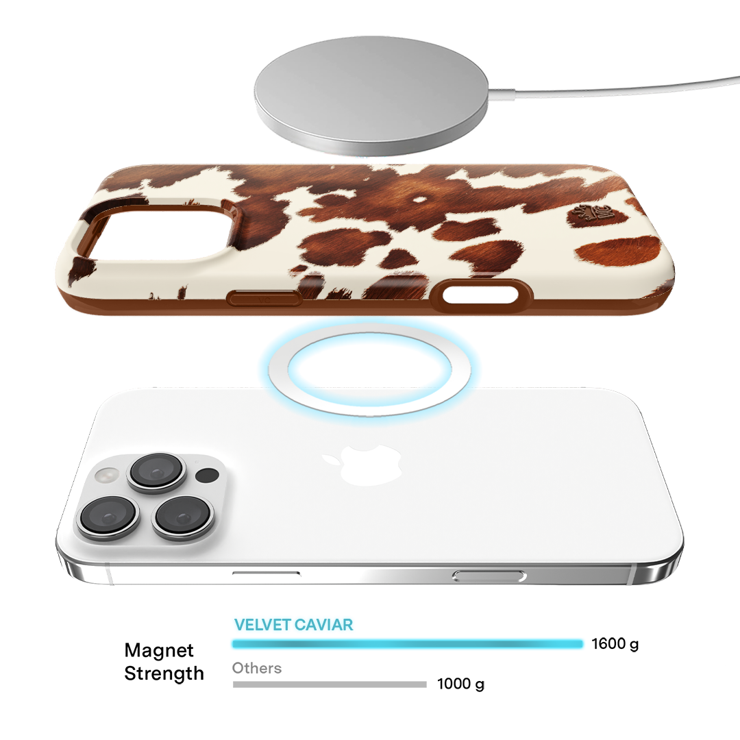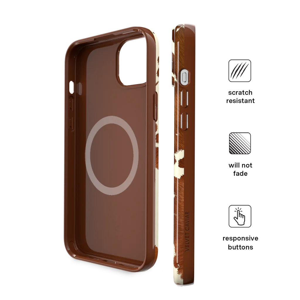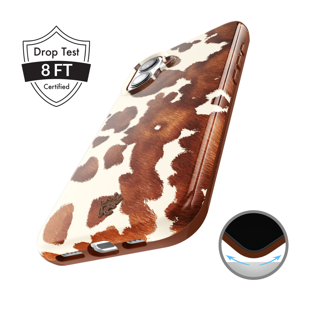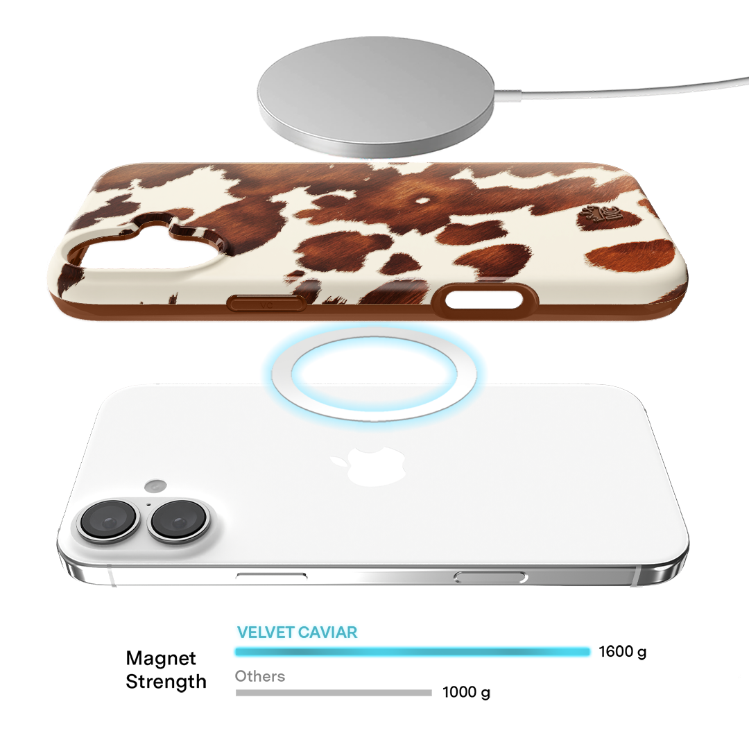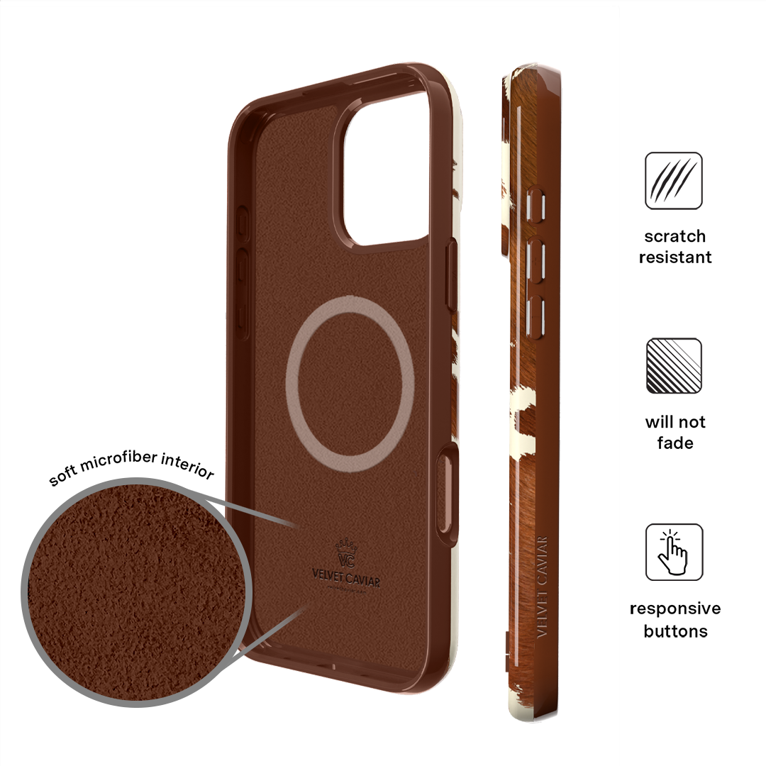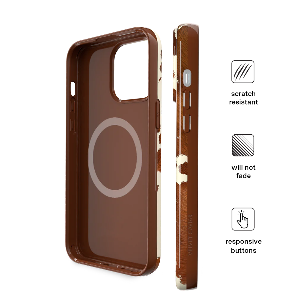 Cowboy Core! Embrace western rodeo style with this MagSafe case featuring a realistic cow print with glossy warm brown spots on a matte eggshell base.