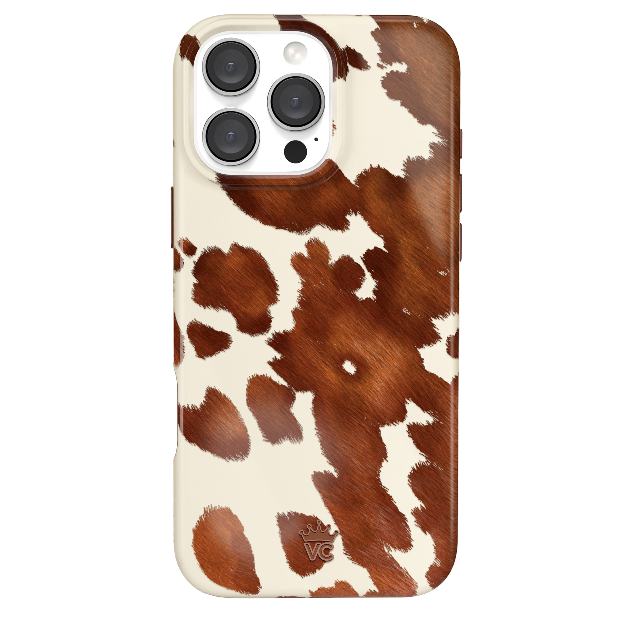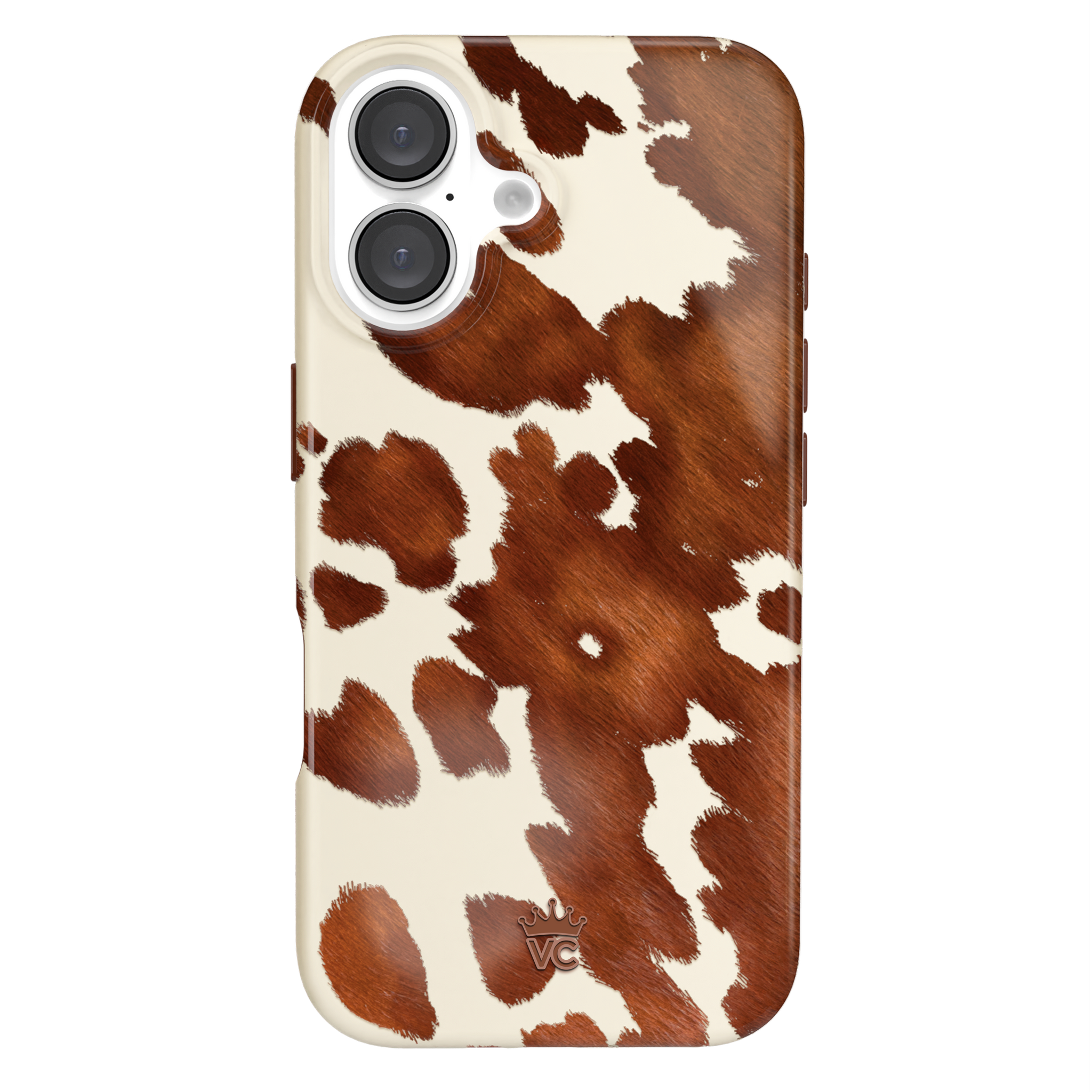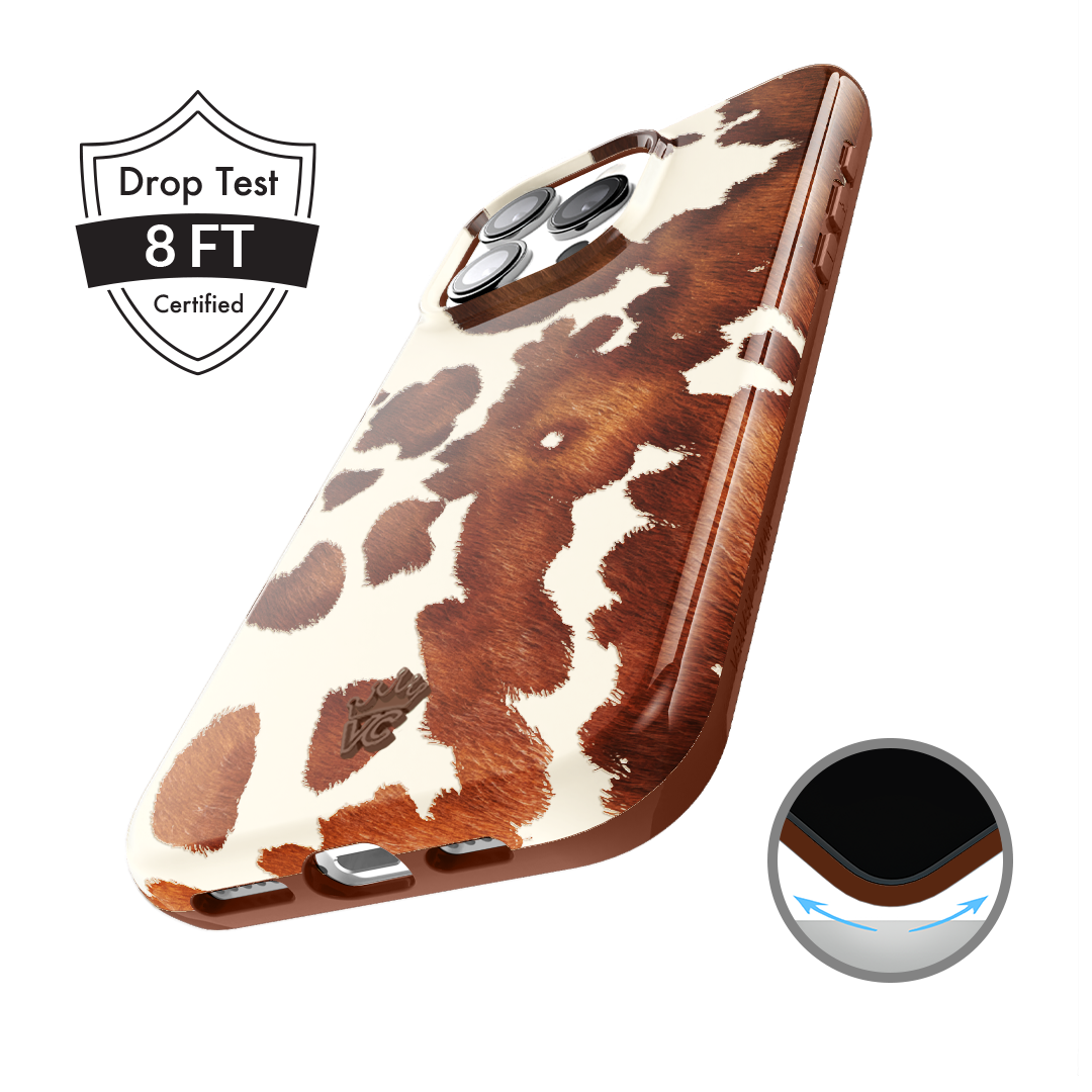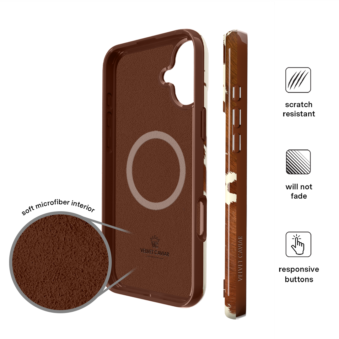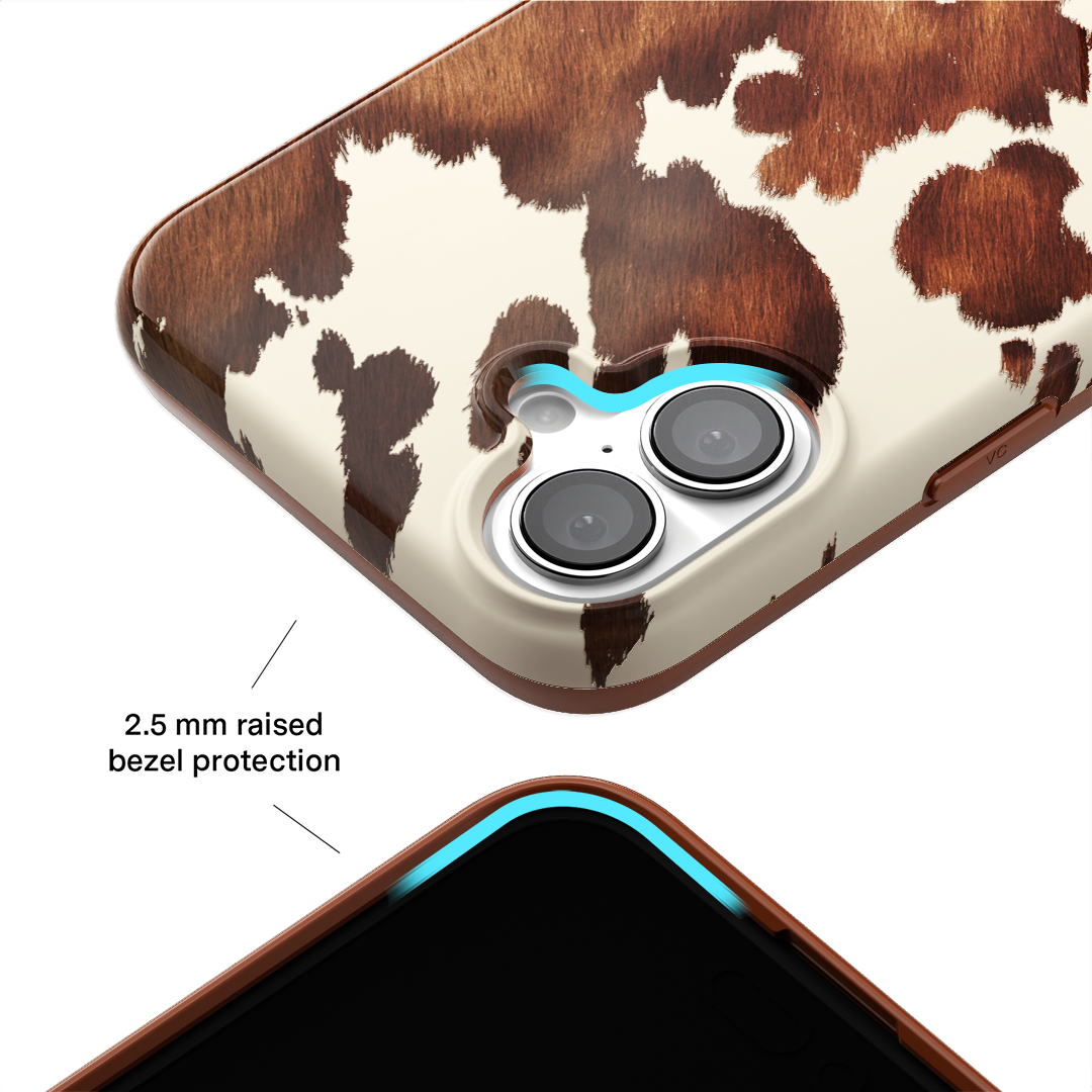 Cowboy Core! Embrace western rodeo style with this MagSafe case featuring a realistic cow print with glossy warm brown spots on a matte eggshell base.