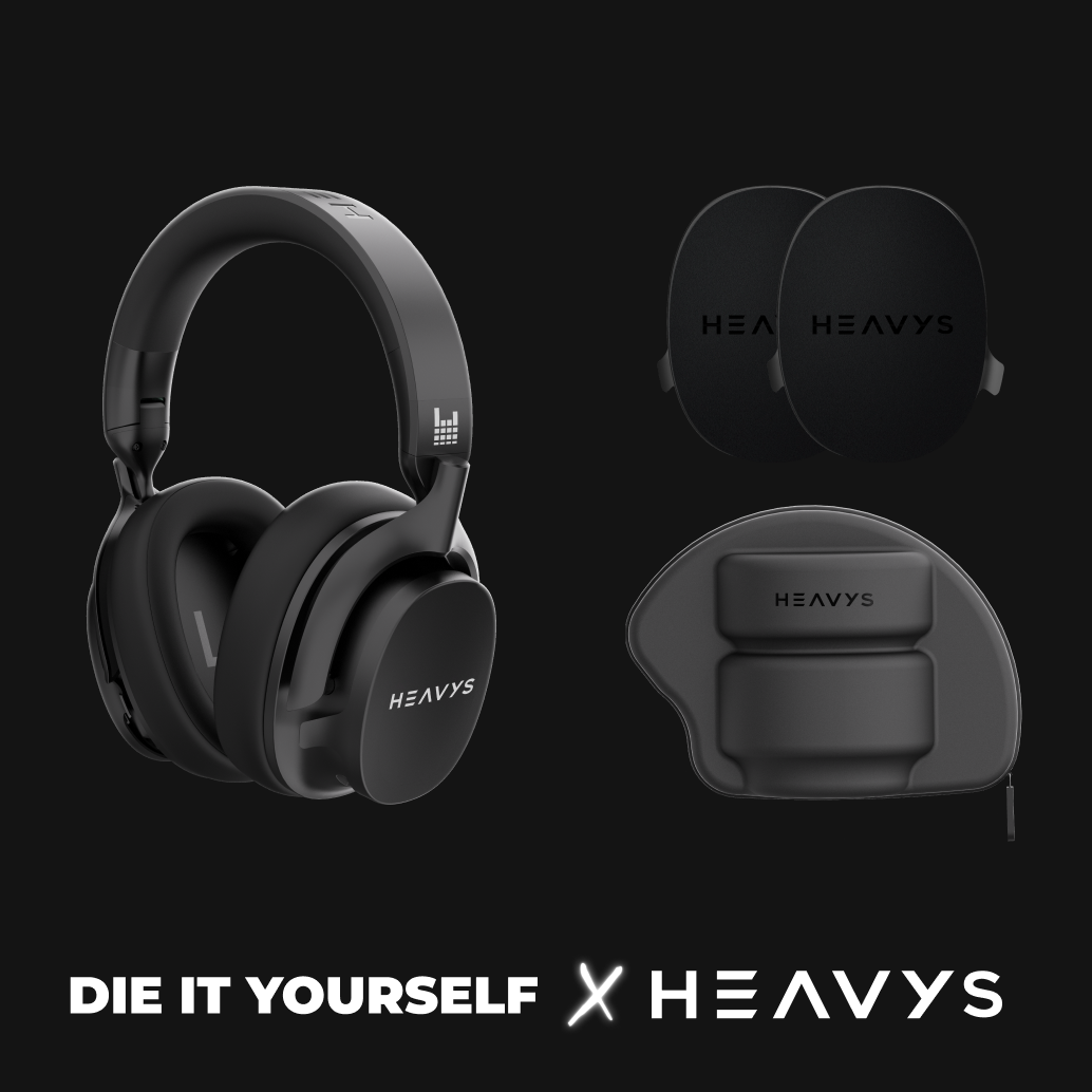 Heavys Headphones bundle complete with Headphones. 2 Original Heavys Shells (white logo). 2 Solid Black DIY Shells with Black Heavys Logo. Protective Travel Case. USB-C and Audio AUX cables.