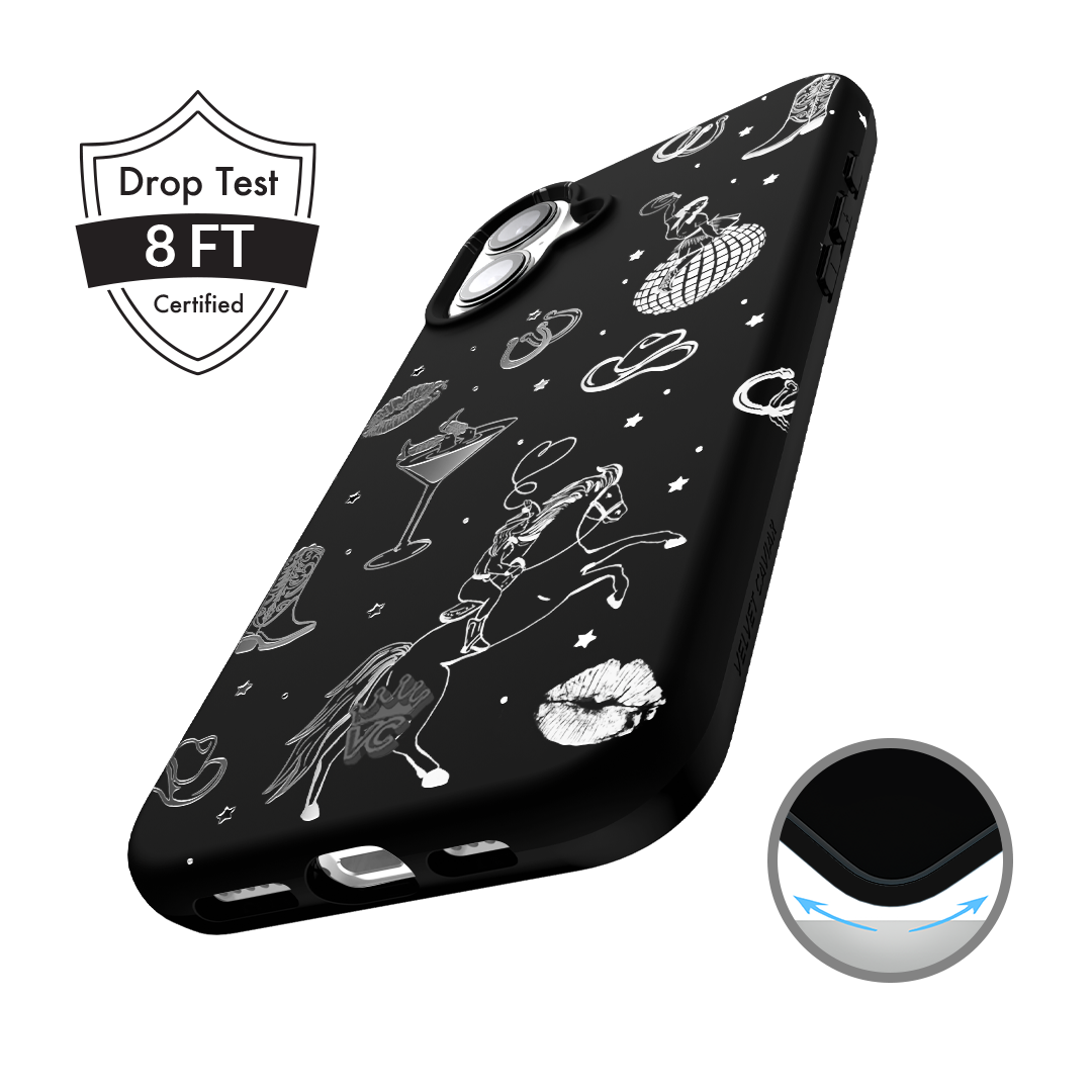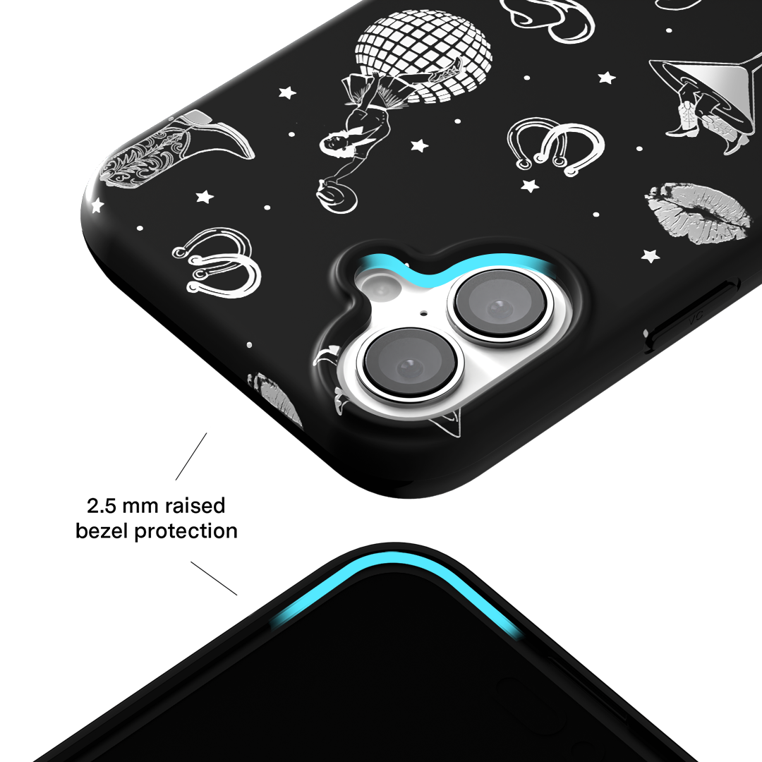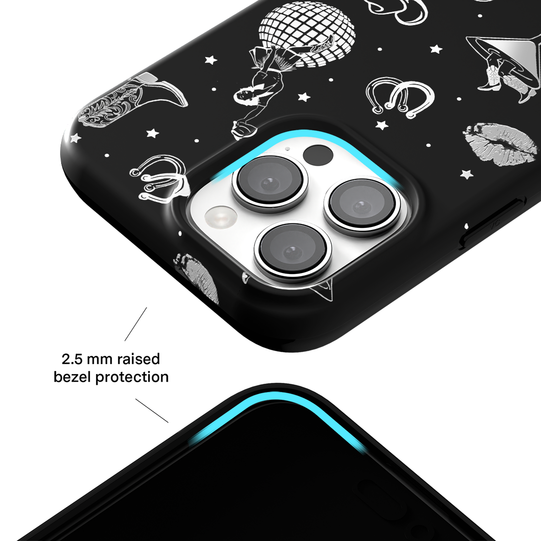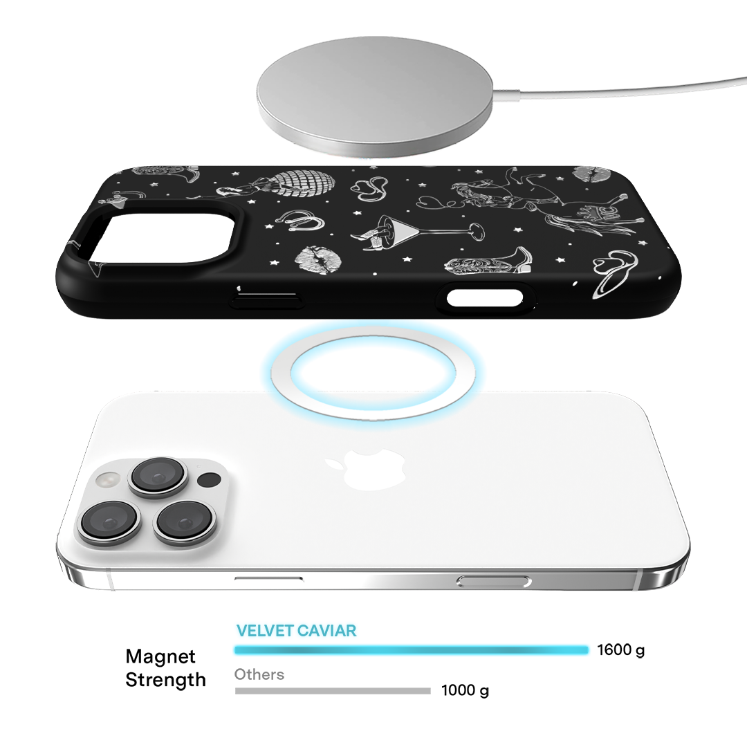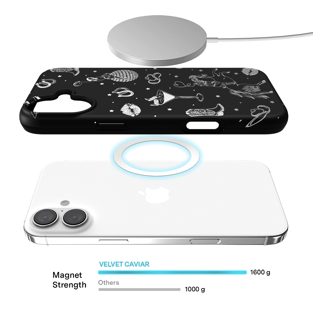 Queen of the night! This Limited Edition MagSafe Case features a chrome cowboy hat. disco ball. boots. and martini glass all on a matte black base.