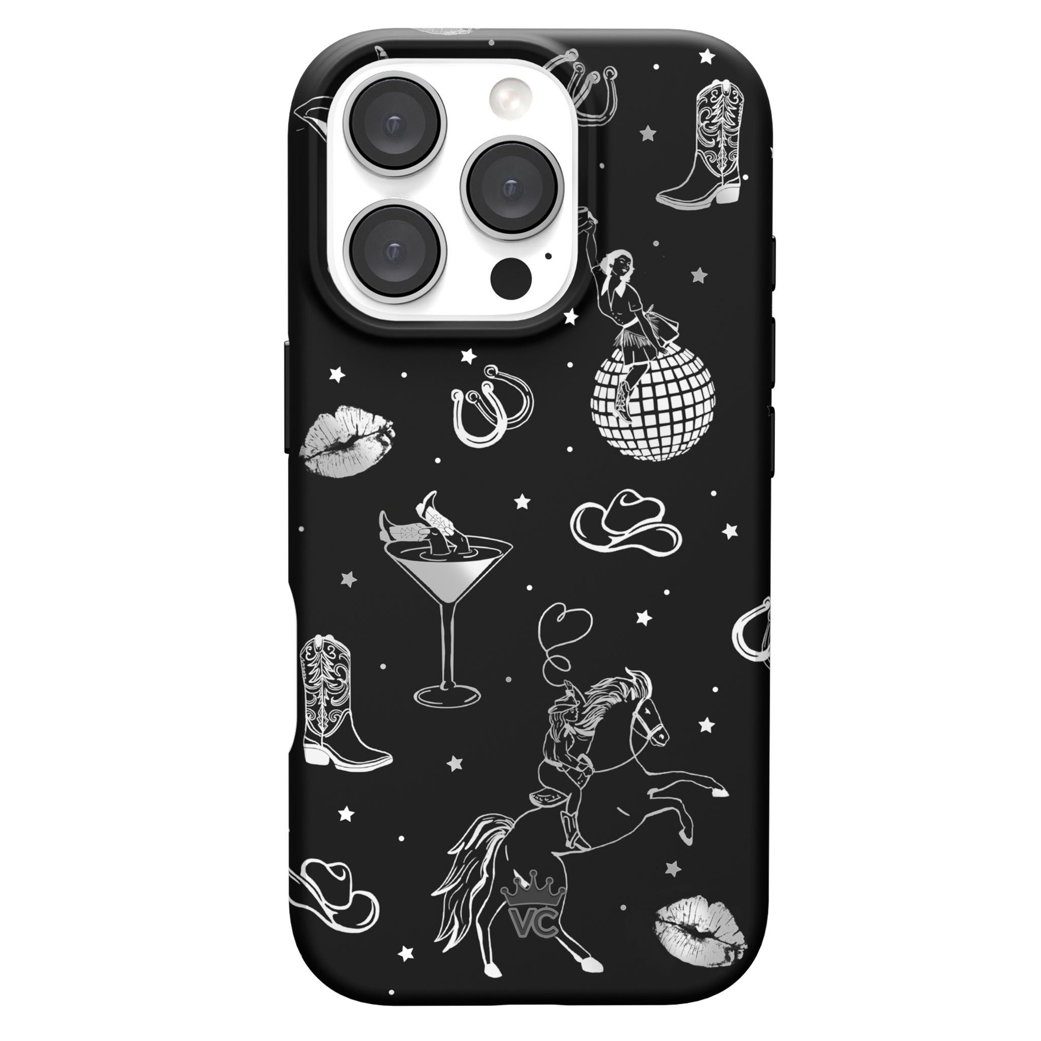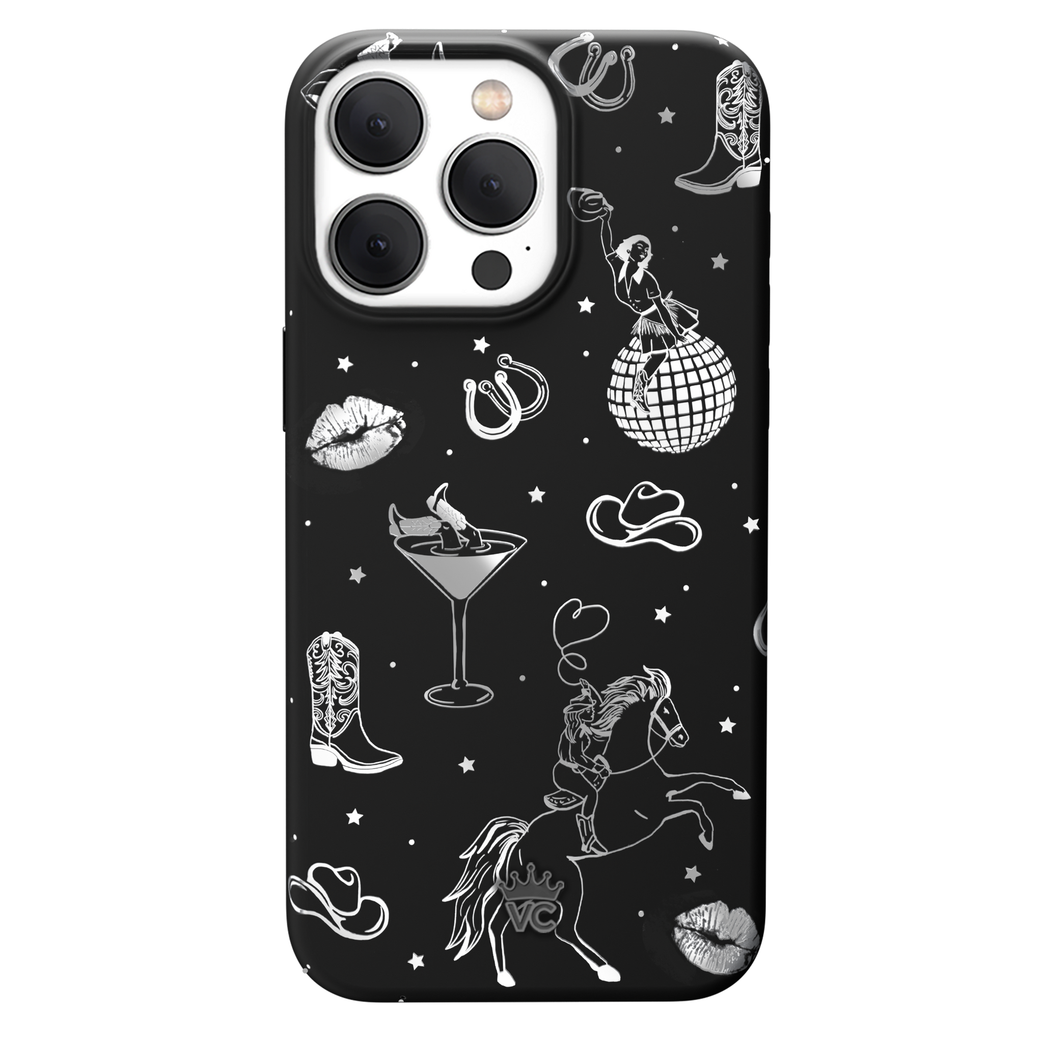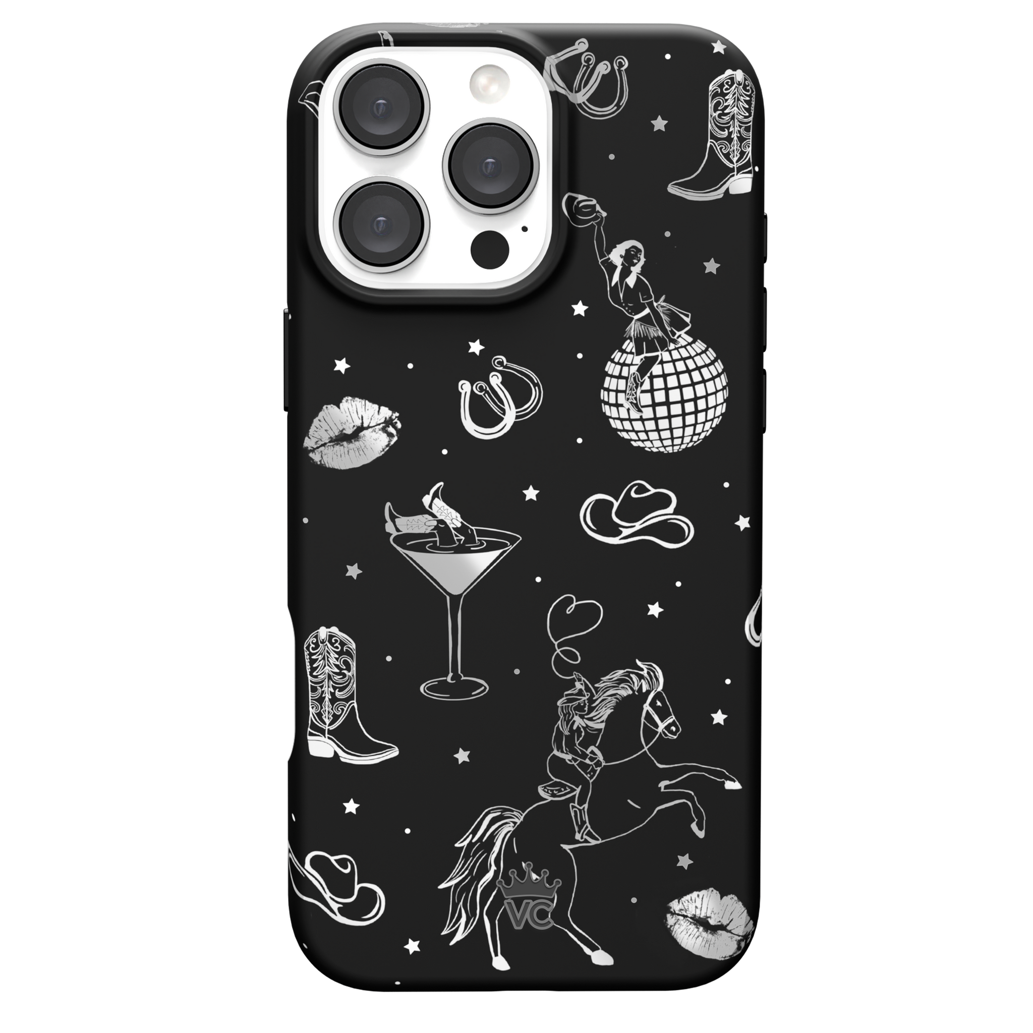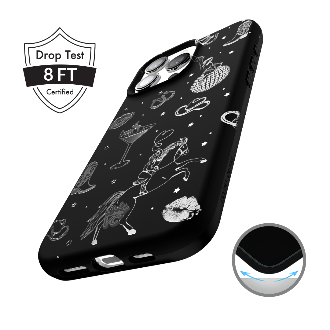 Queen of the night! This Limited Edition MagSafe Case features a chrome cowboy hat. disco ball. boots. and martini glass all on a matte black base.