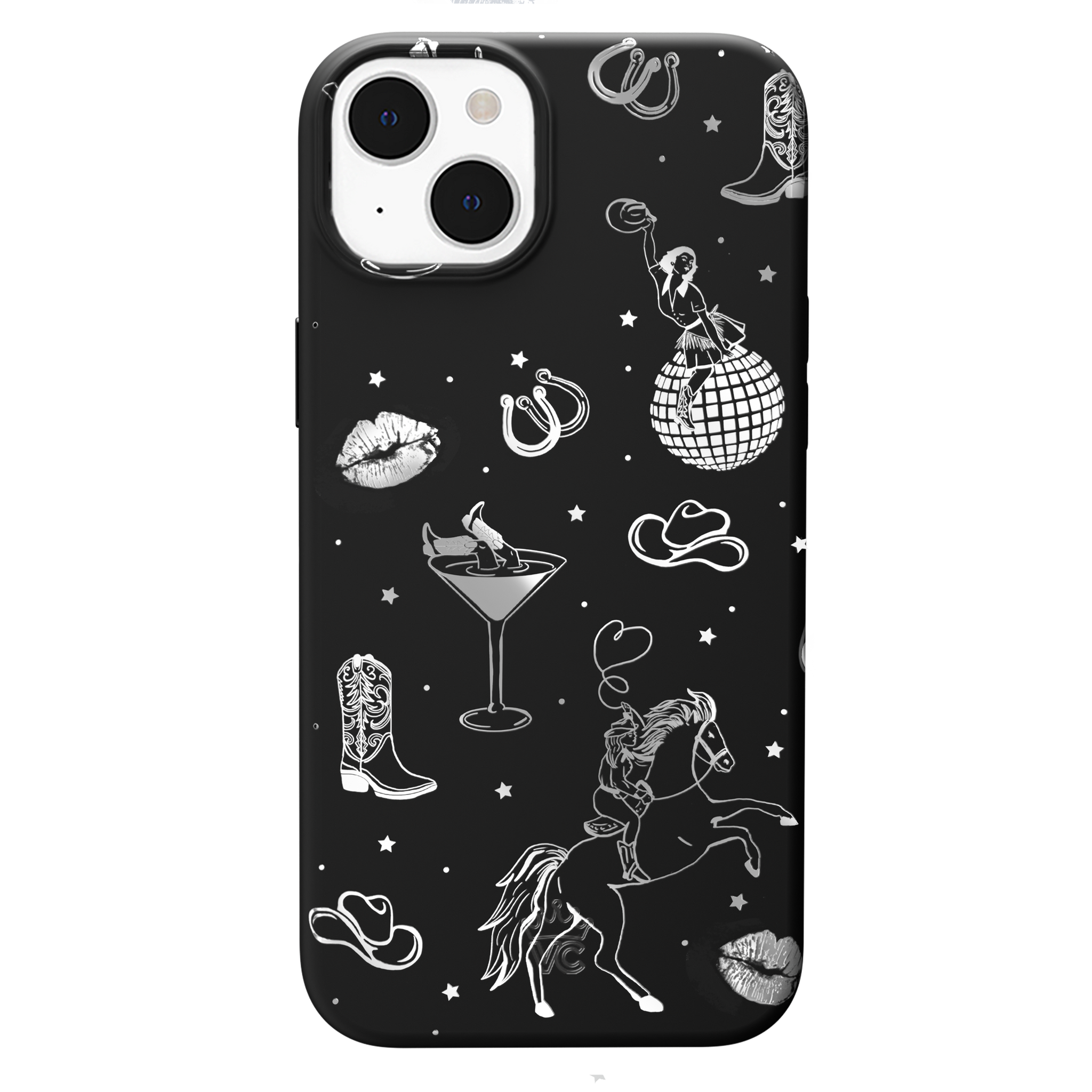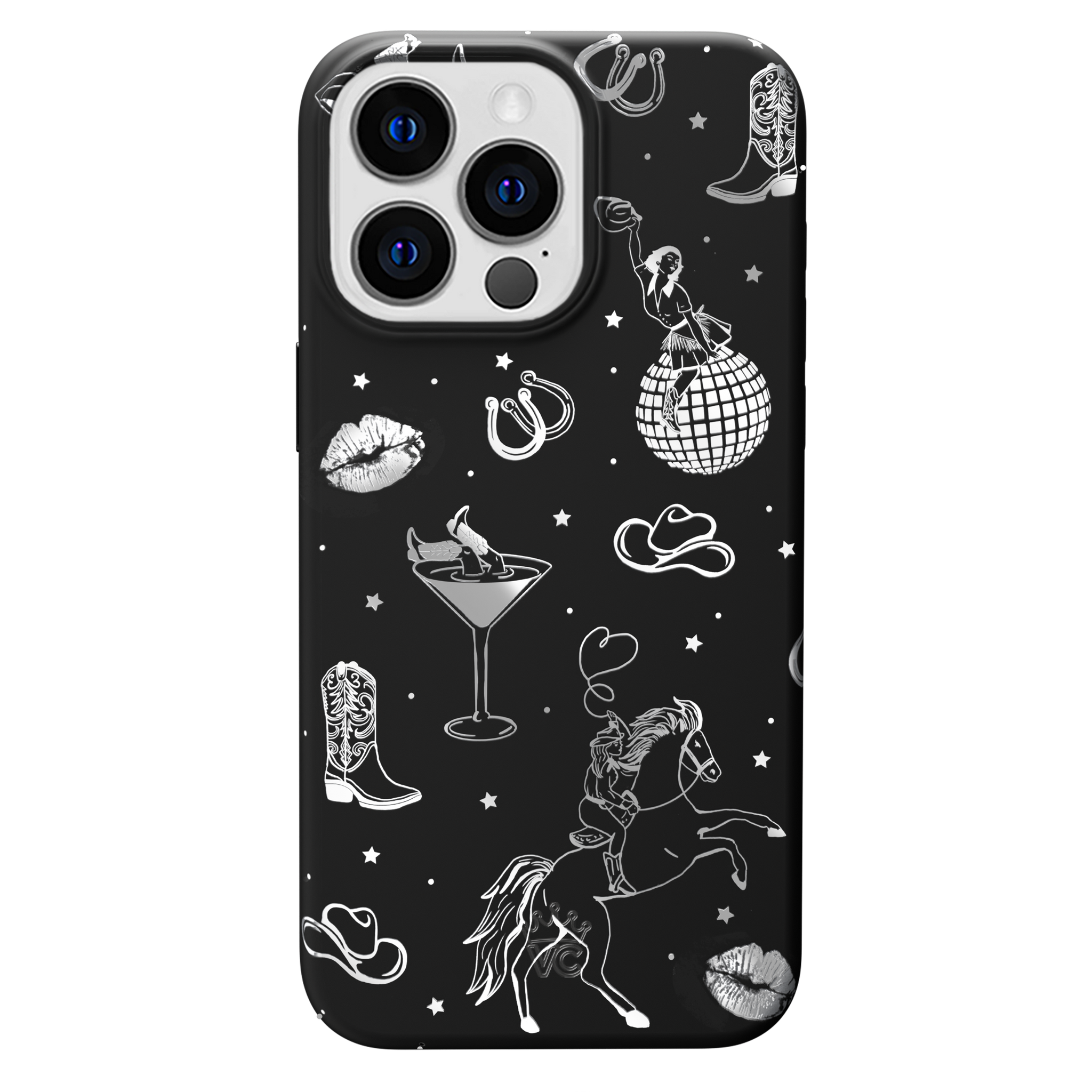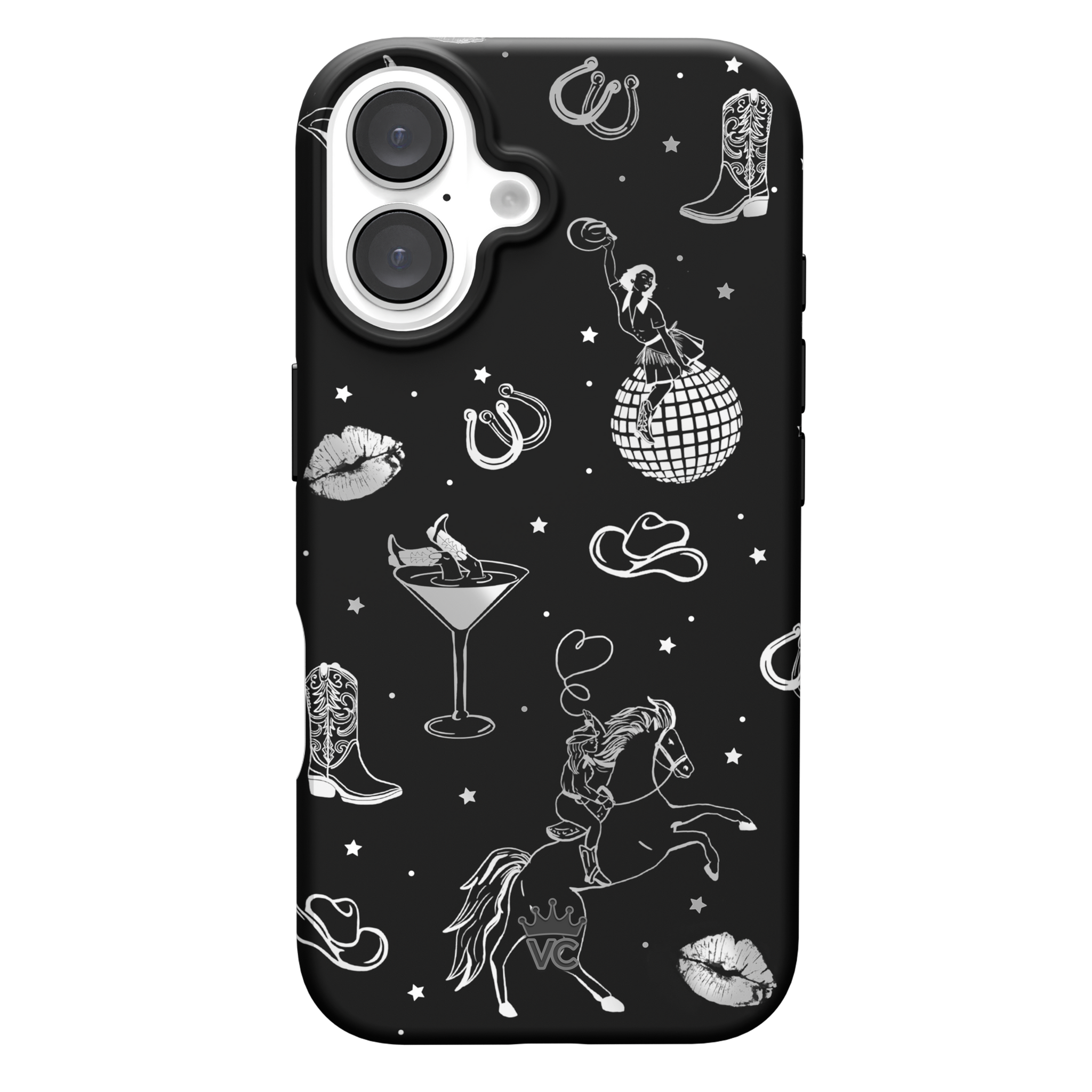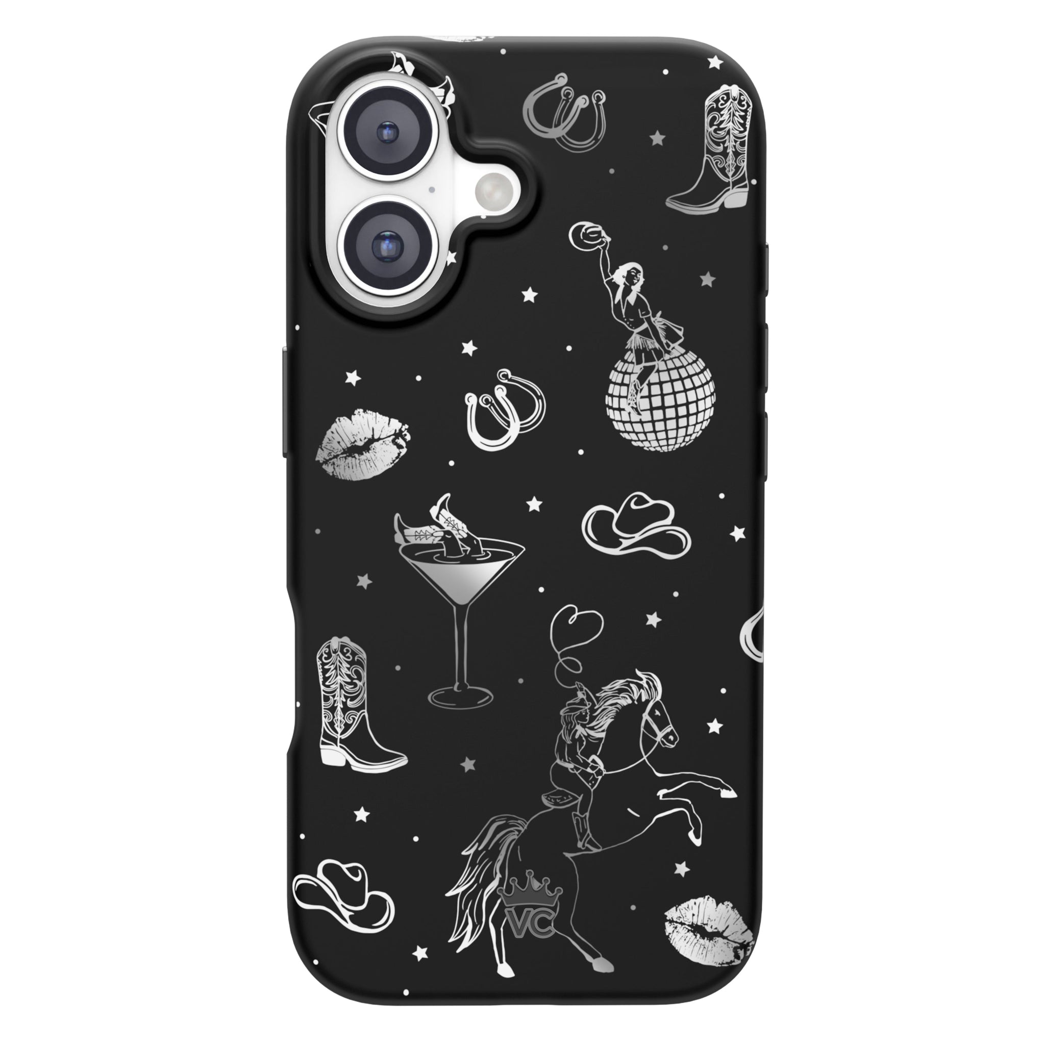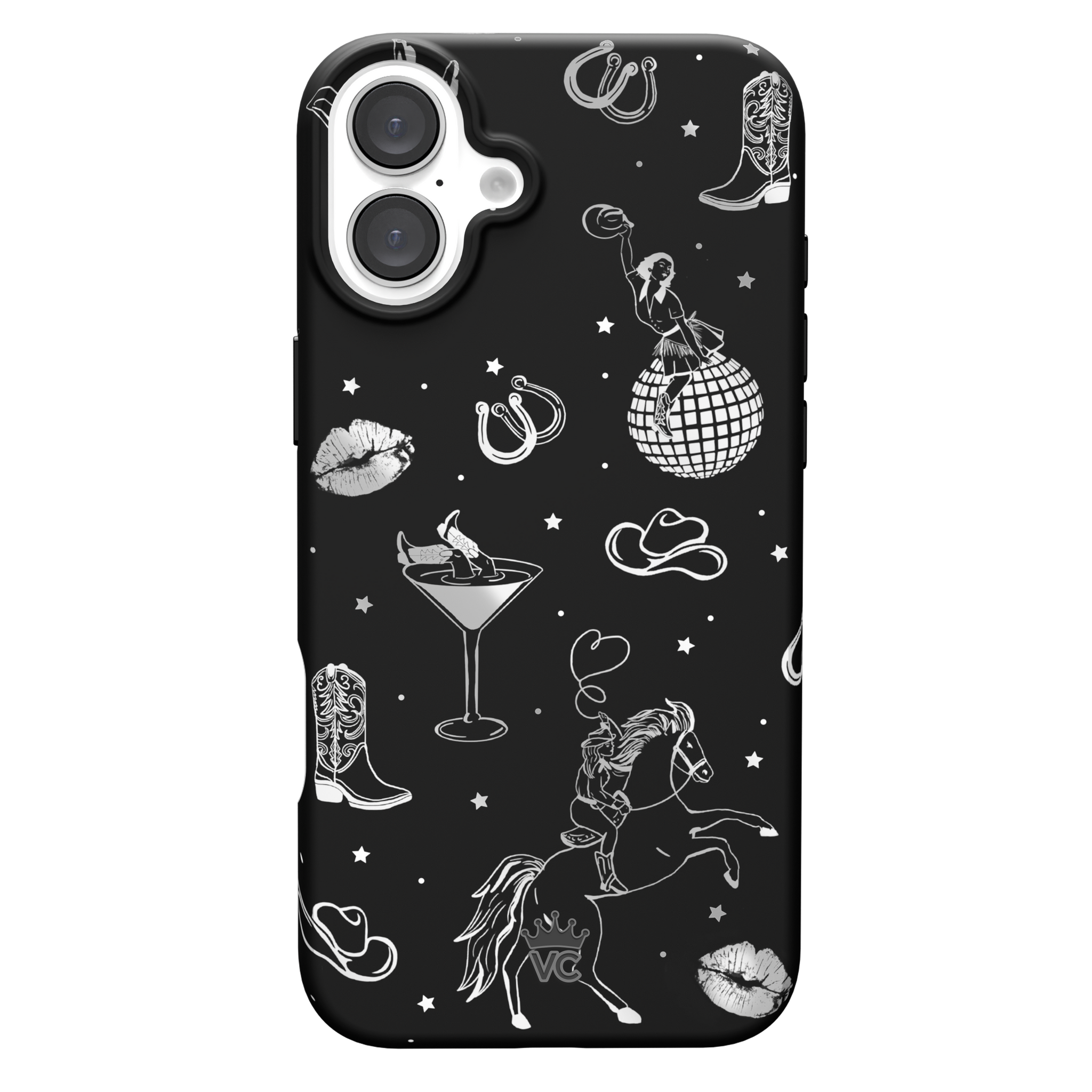 Queen of the night! This Limited Edition MagSafe Case features a chrome cowboy hat. disco ball. boots. and martini glass all on a matte black base.