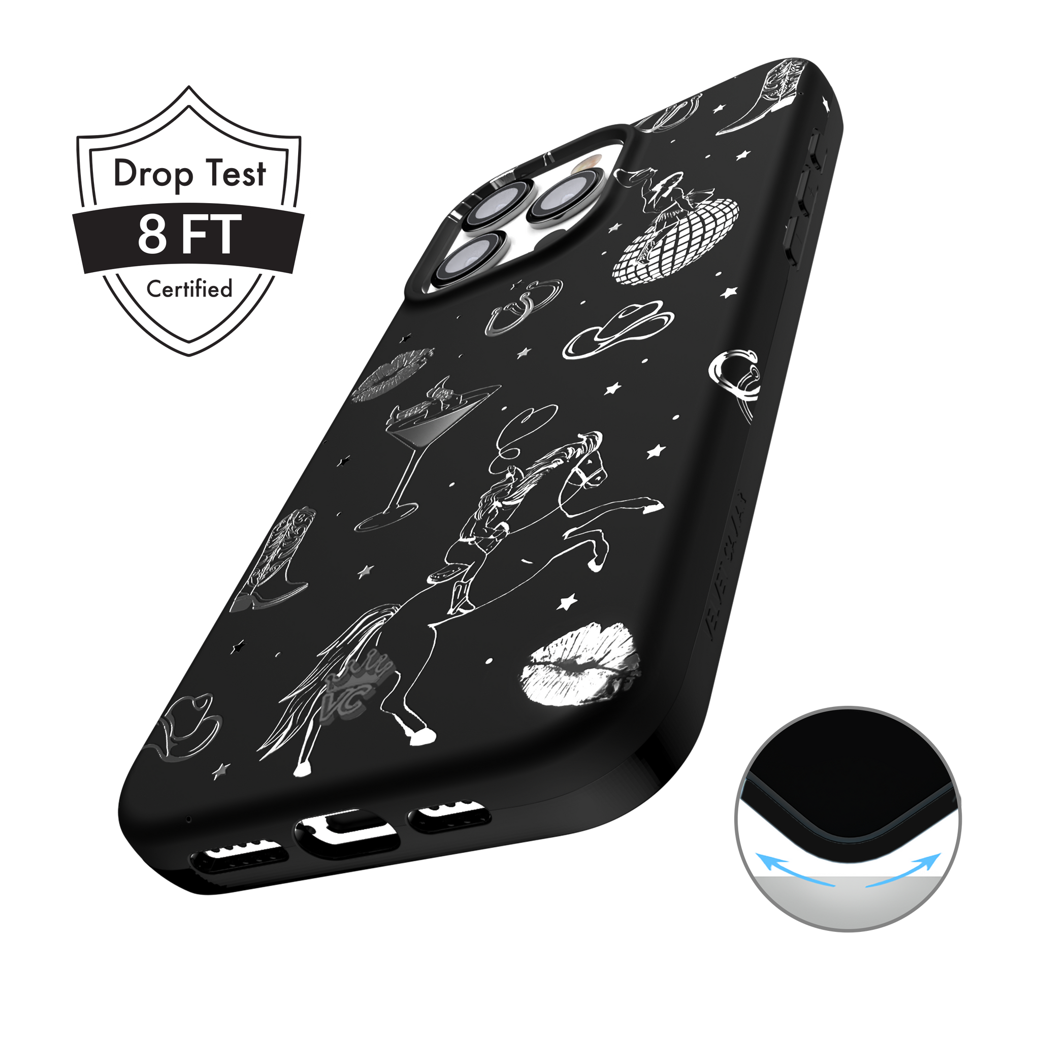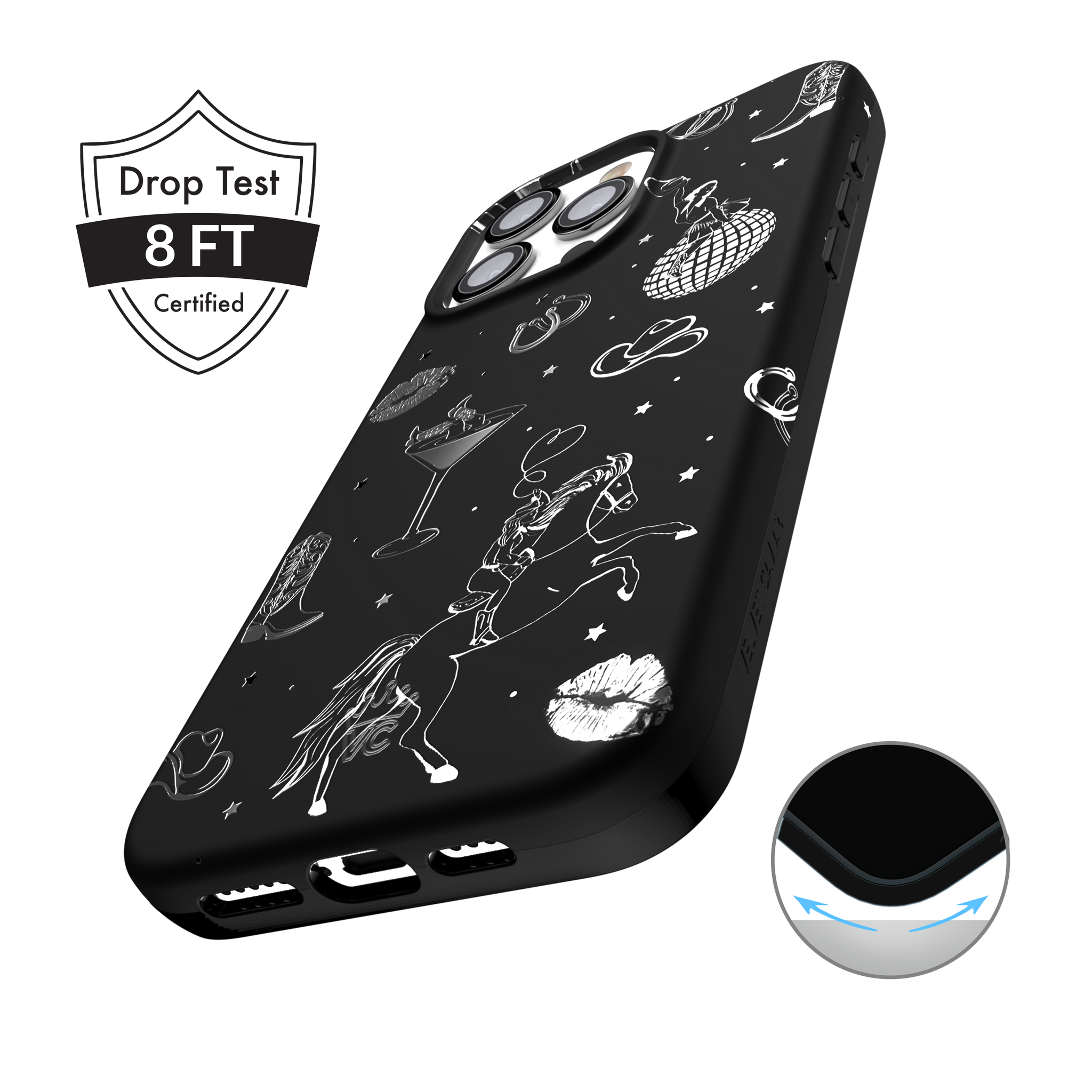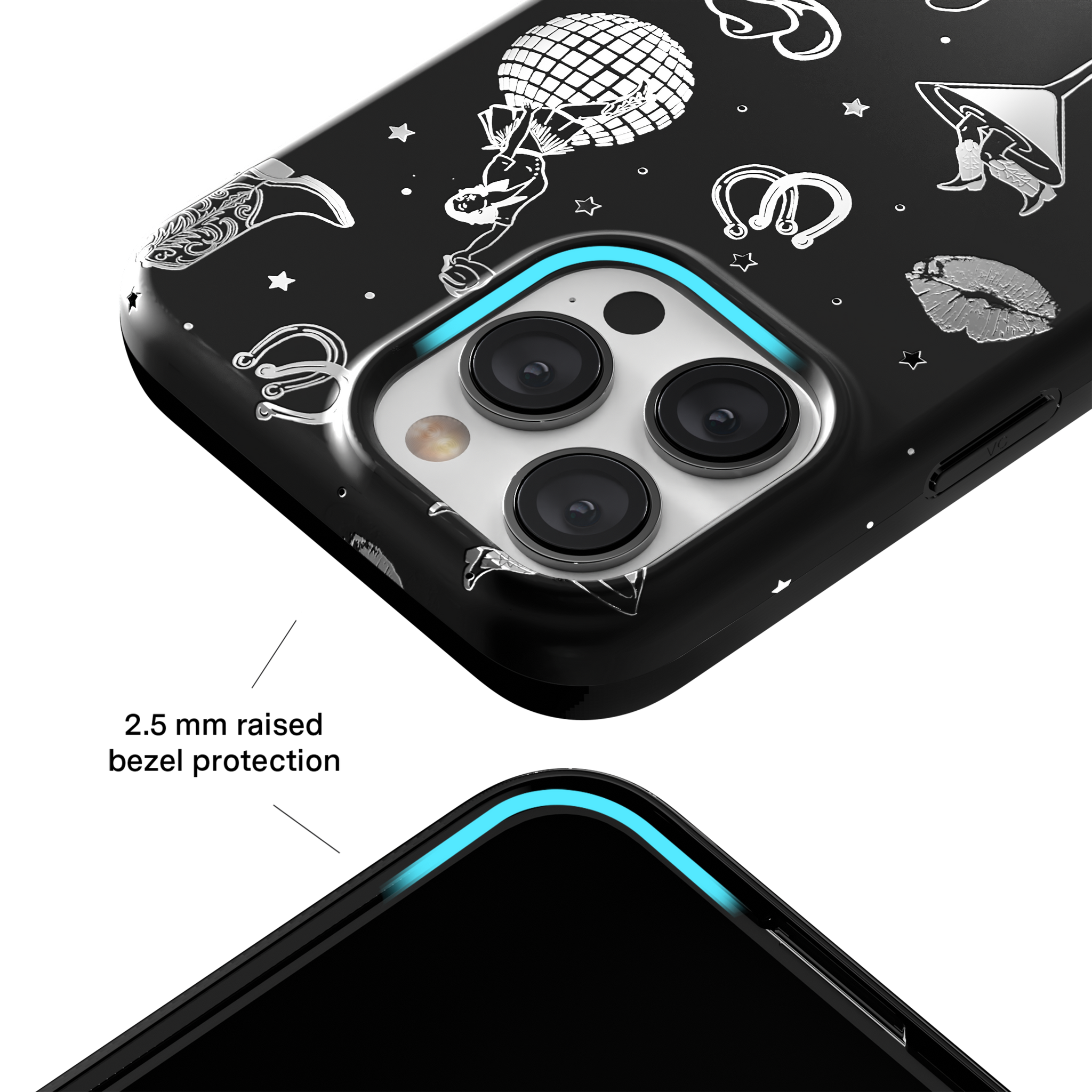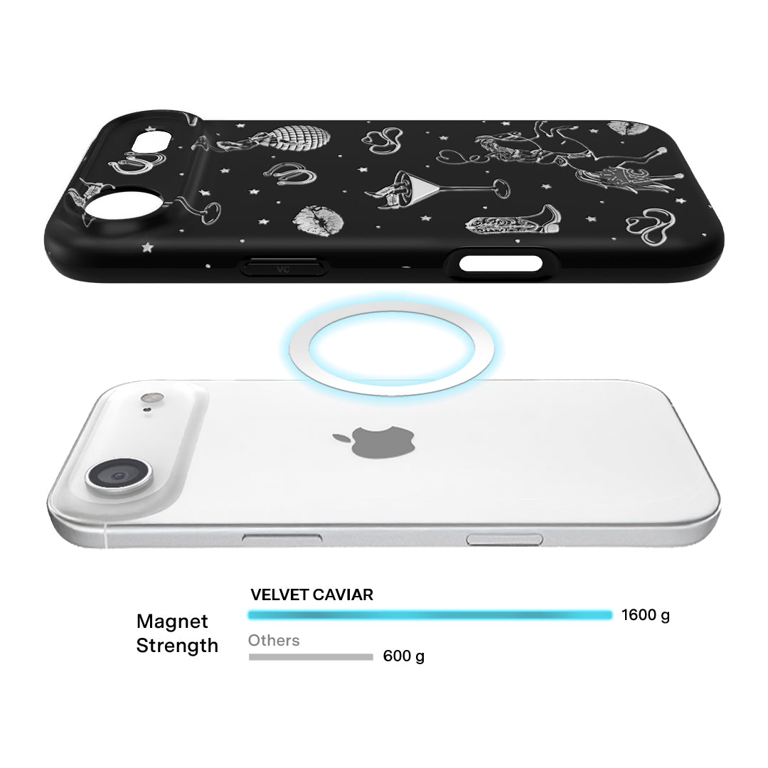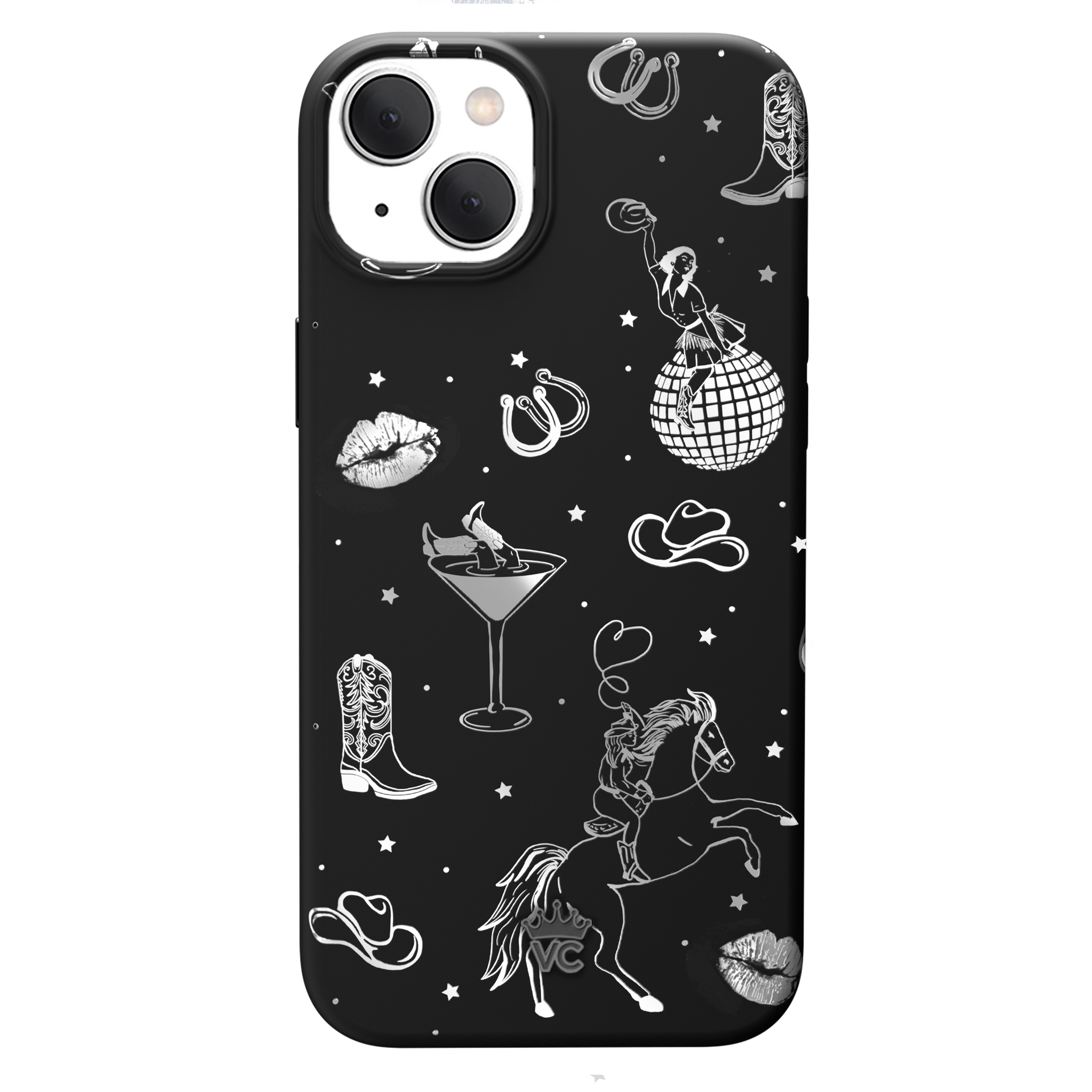 Queen of the night! This Limited Edition MagSafe Case features a chrome cowboy hat. disco ball. boots. and martini glass all on a matte black base.