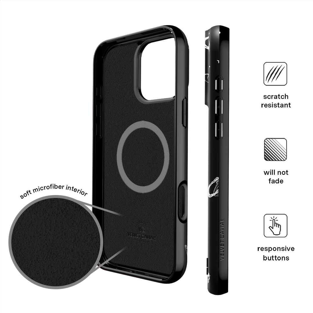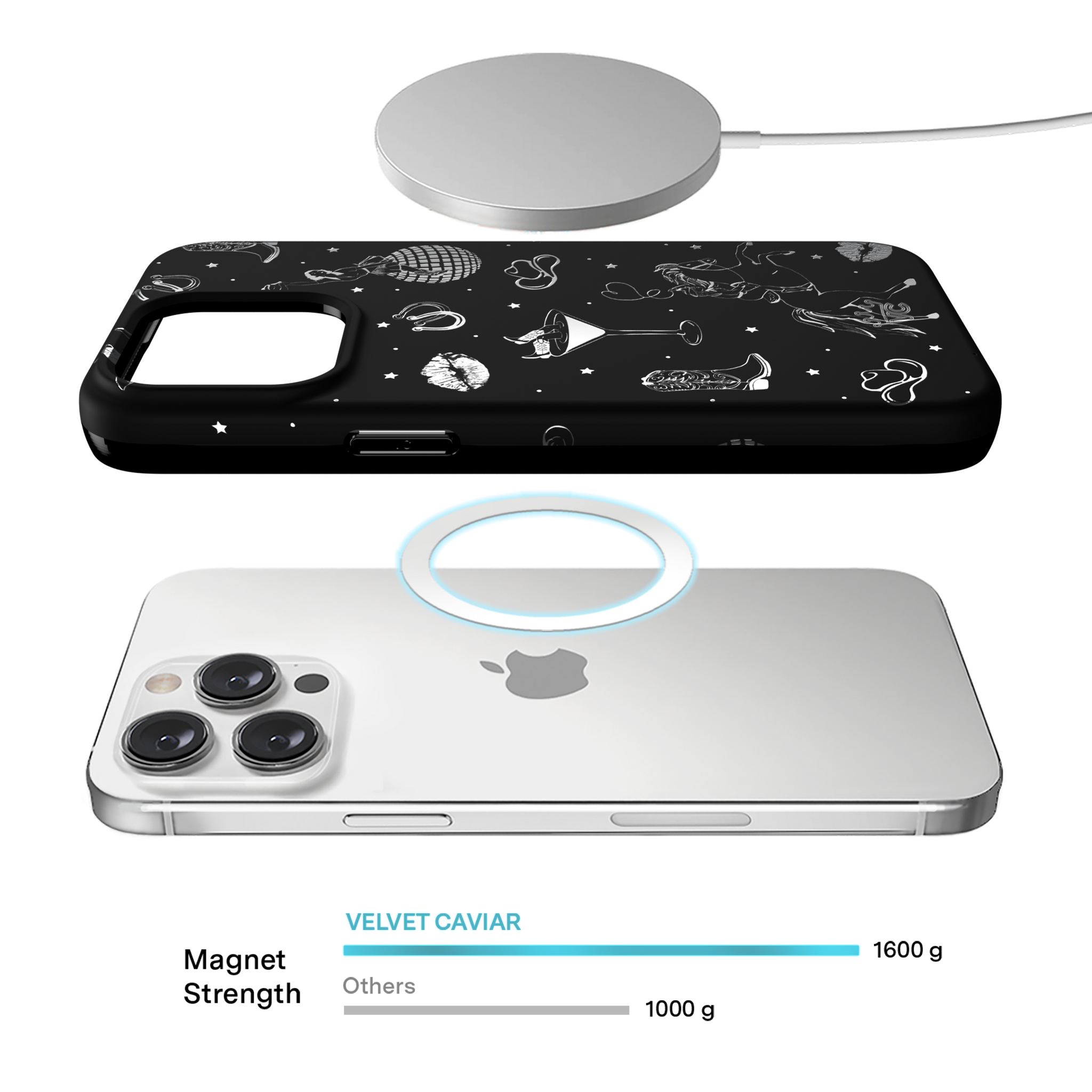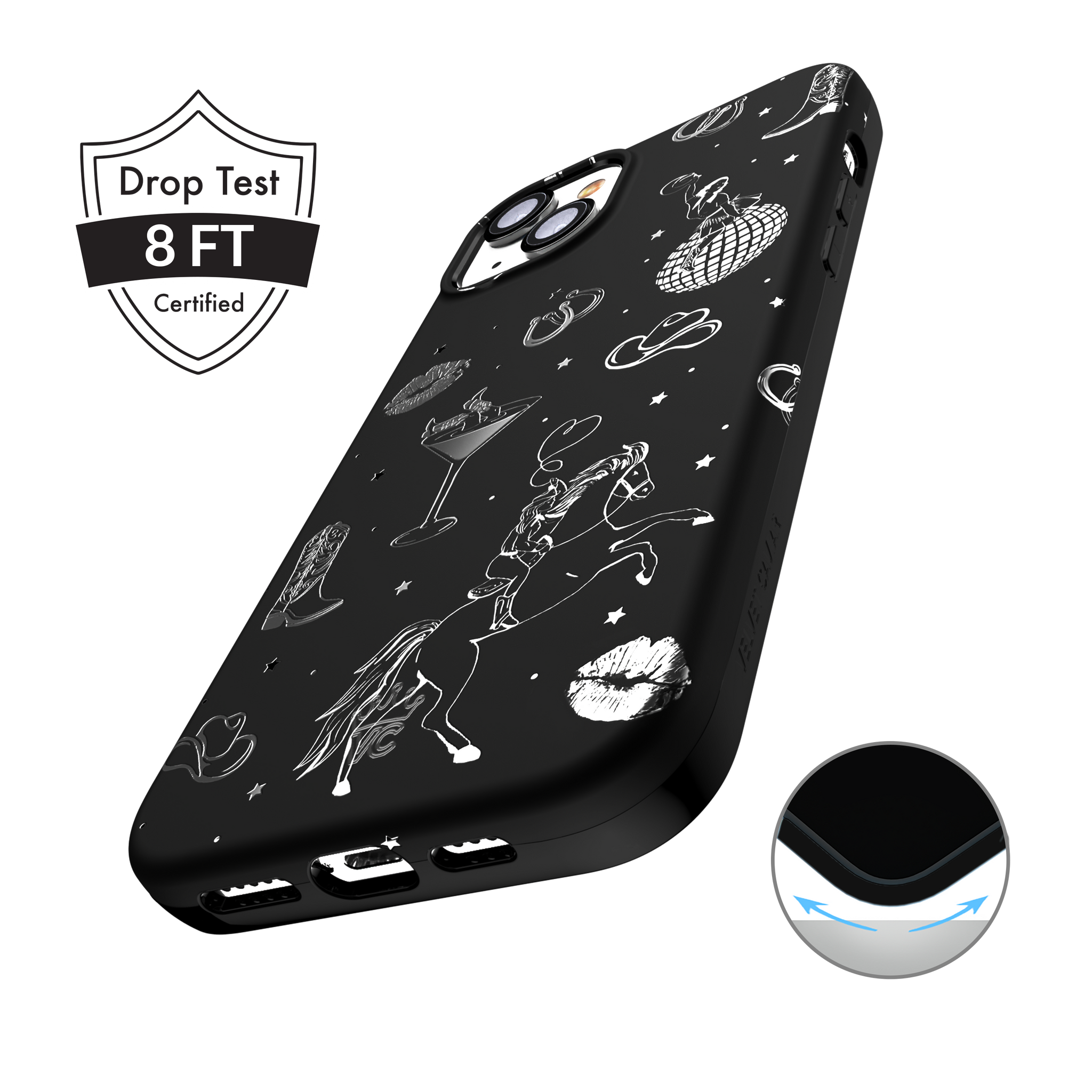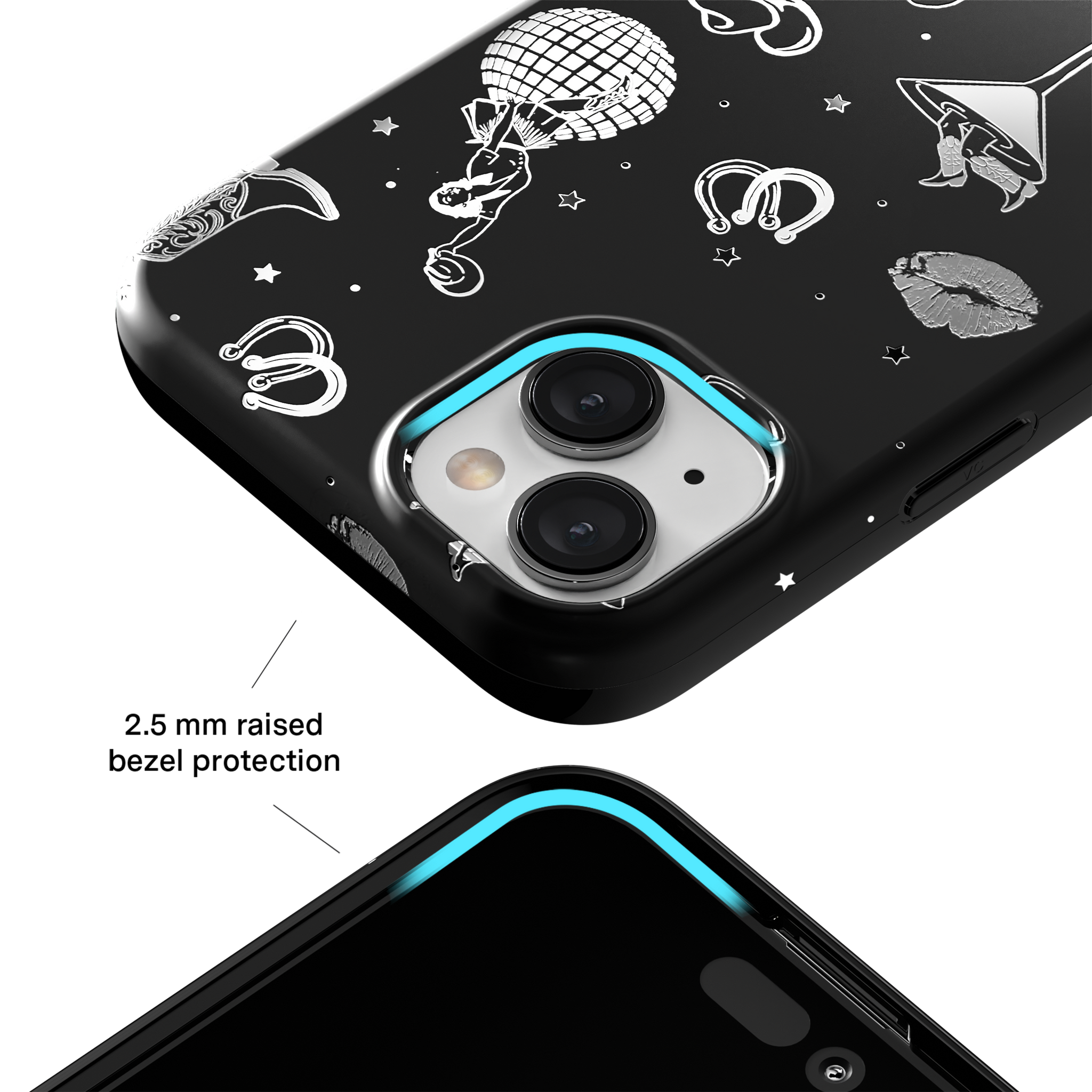 Queen of the night! This Limited Edition MagSafe Case features a chrome cowboy hat. disco ball. boots. and martini glass all on a matte black base.