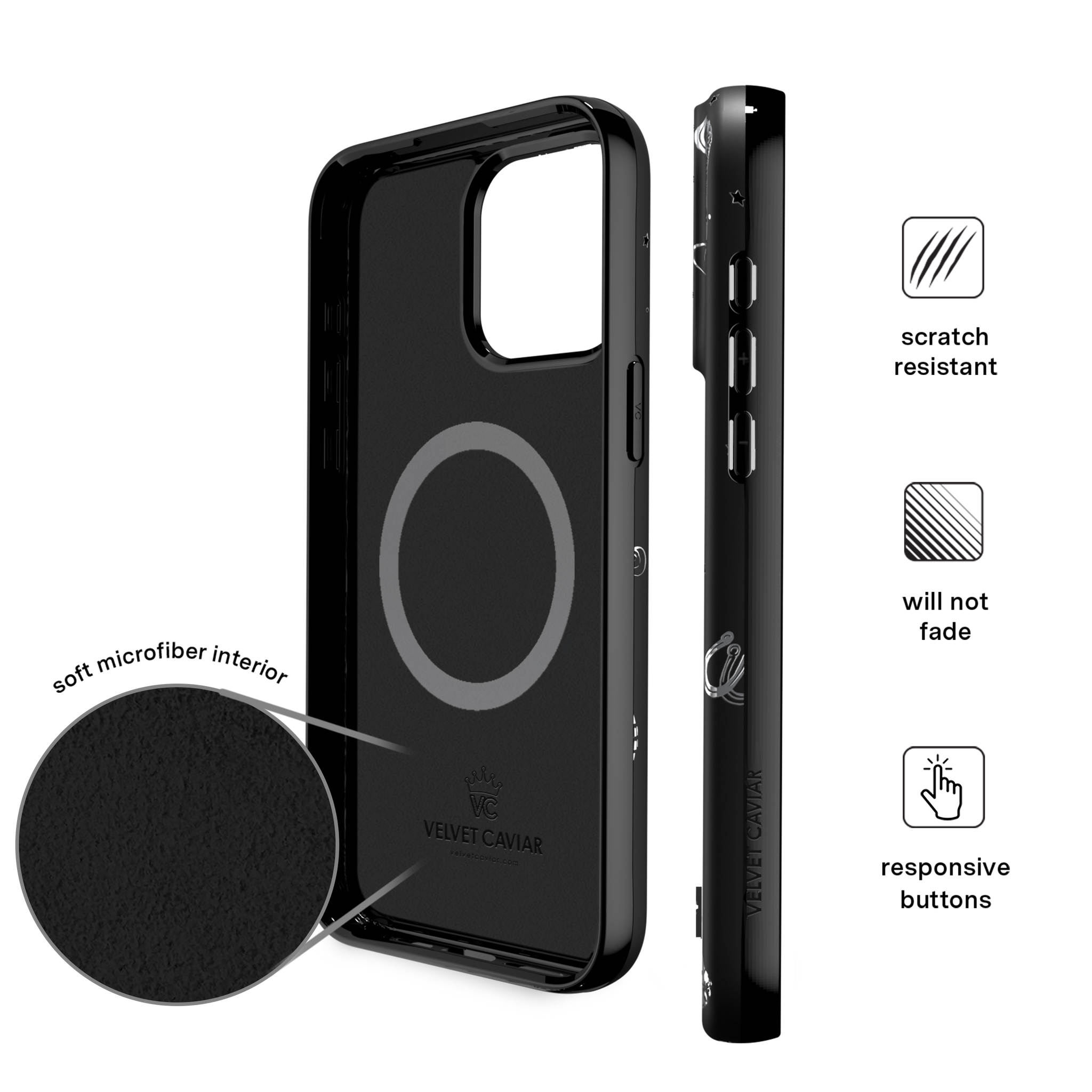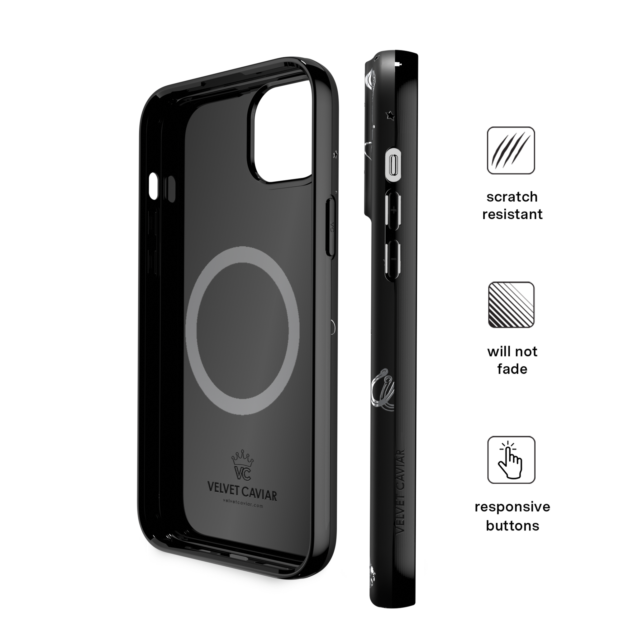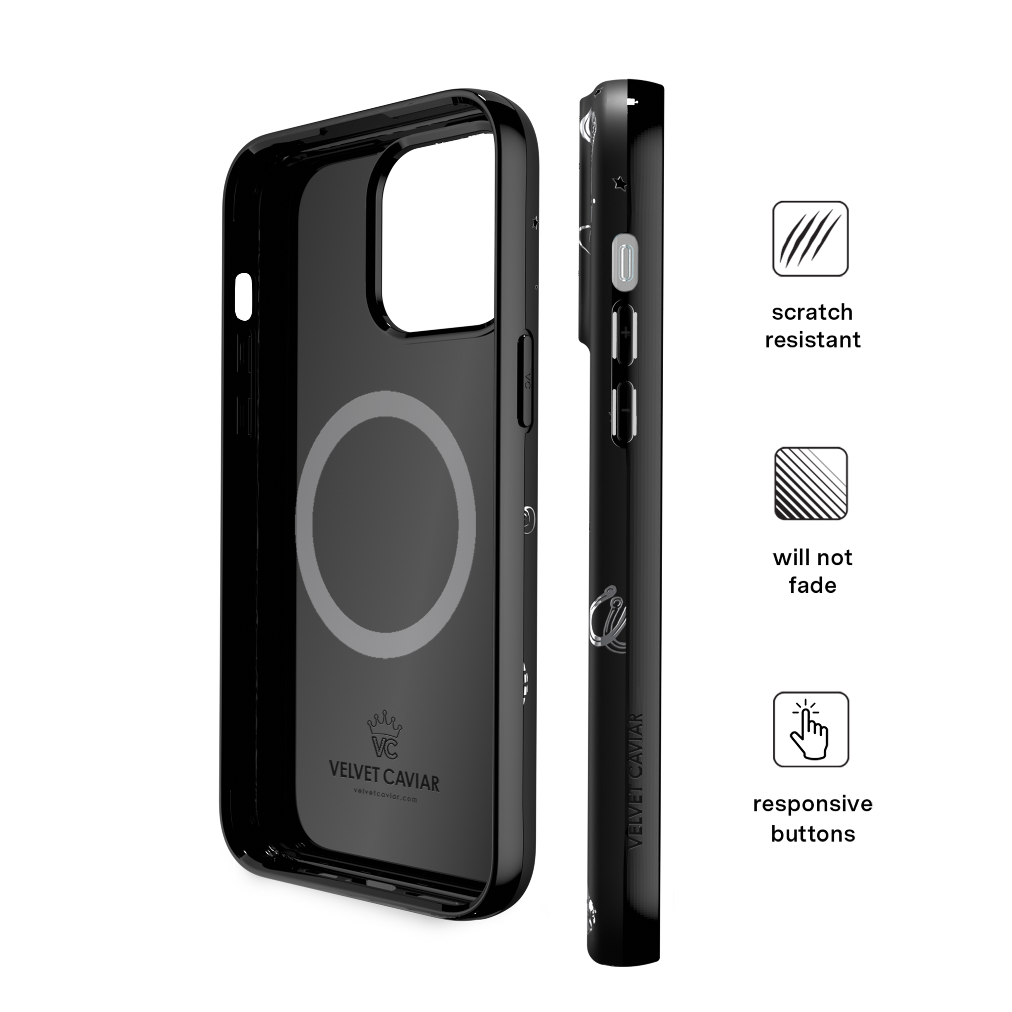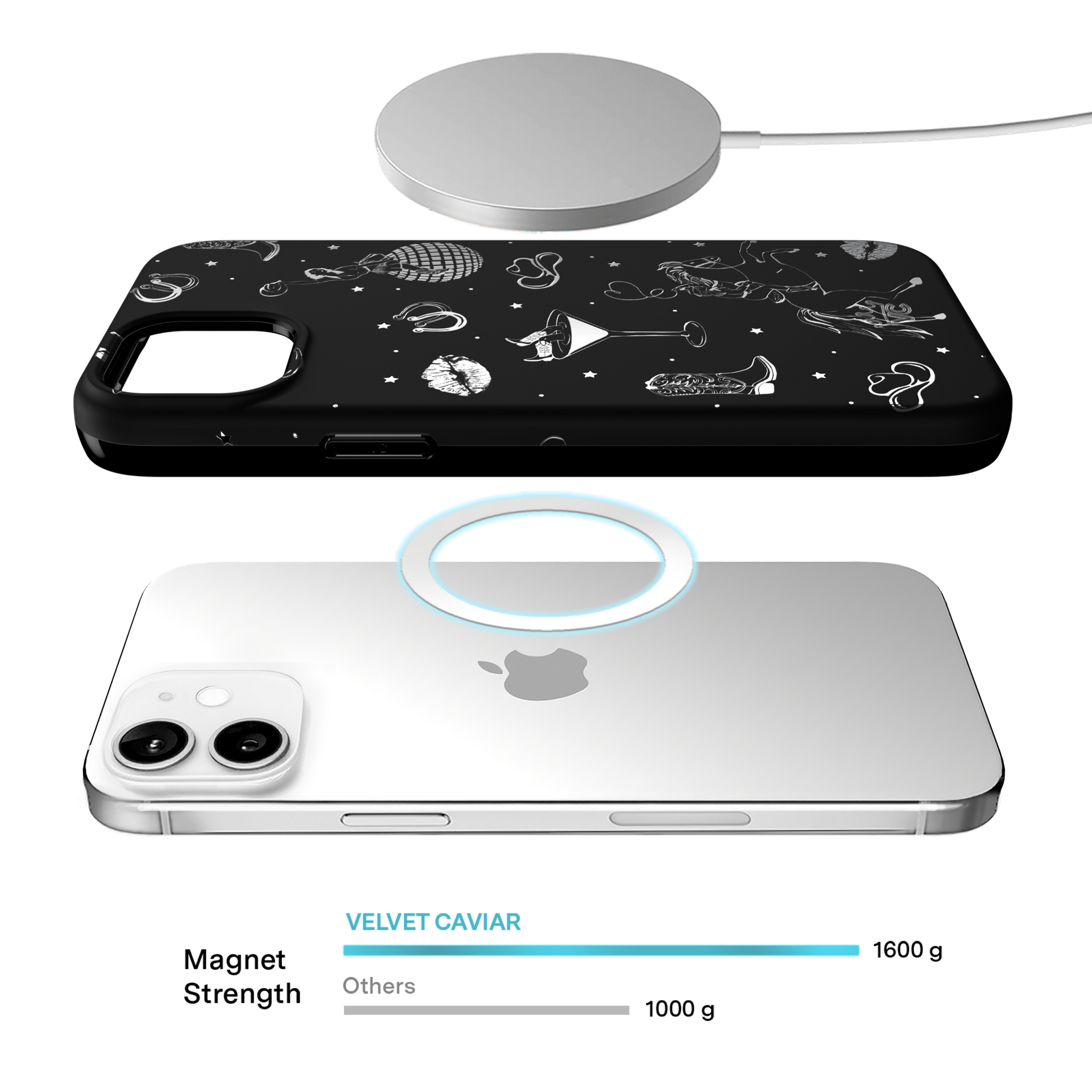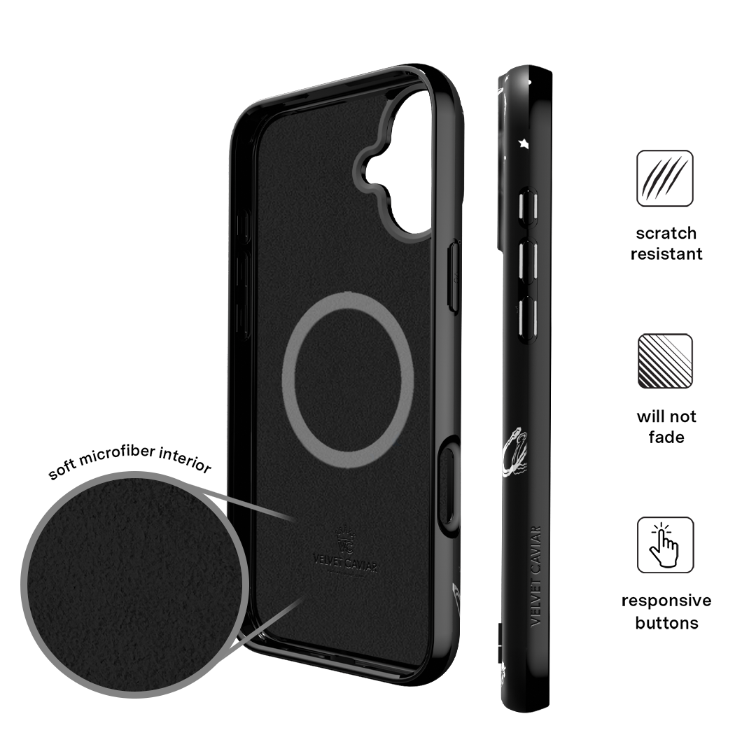 Queen of the night! This Limited Edition MagSafe Case features a chrome cowboy hat. disco ball. boots. and martini glass all on a matte black base.