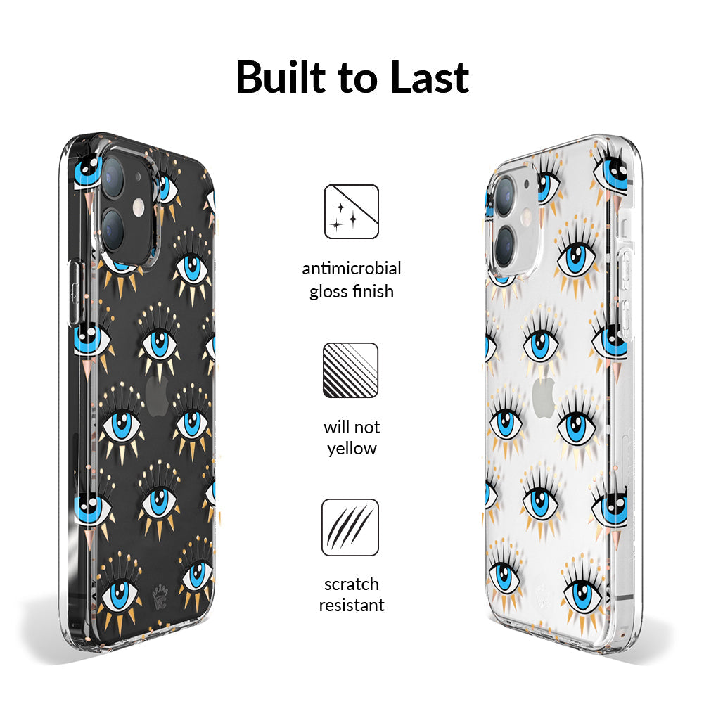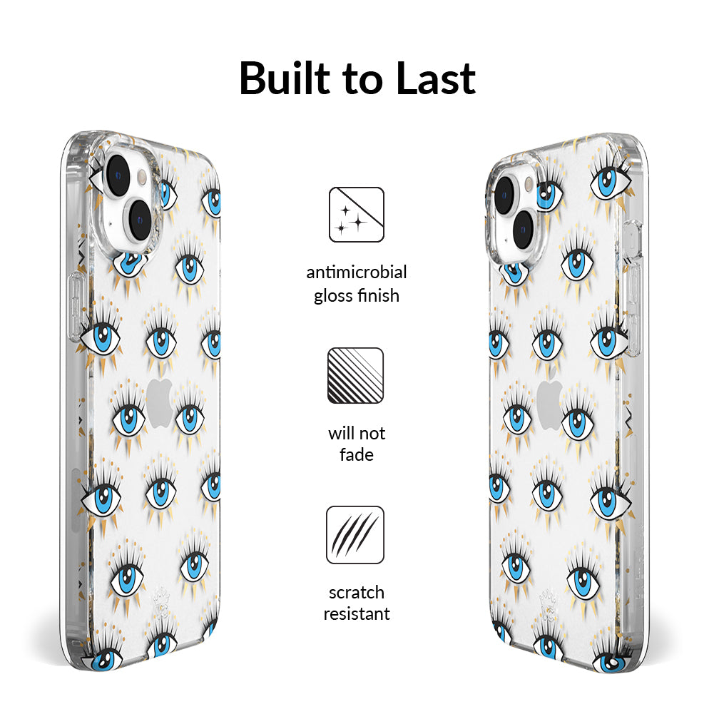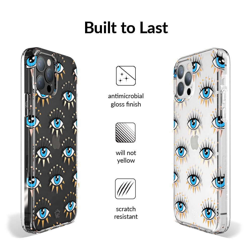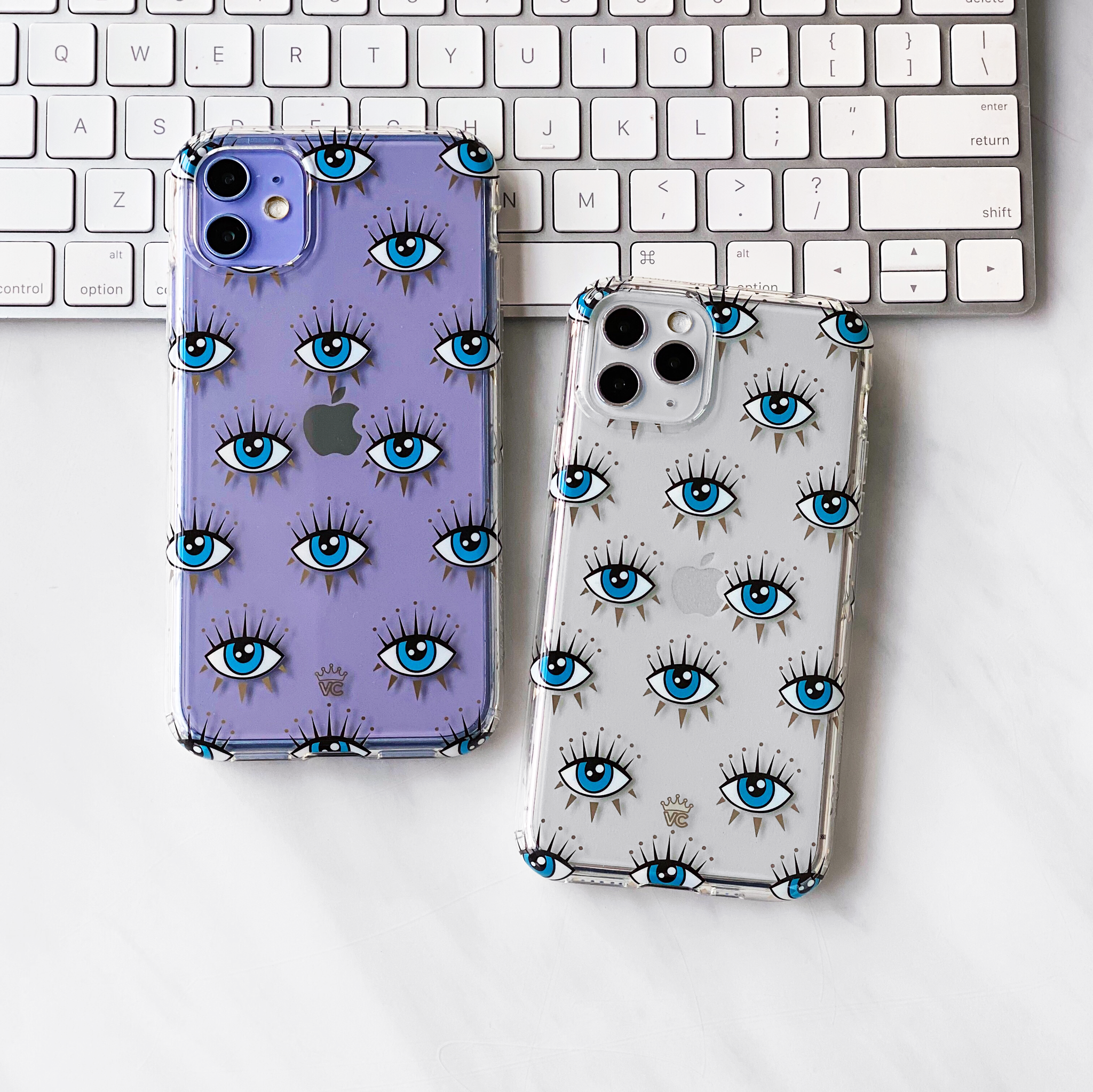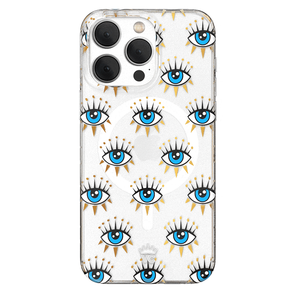 This protective clear case is covered in hand-drawn eye pattern with shiny chrome effects to block out all the negative vibes!