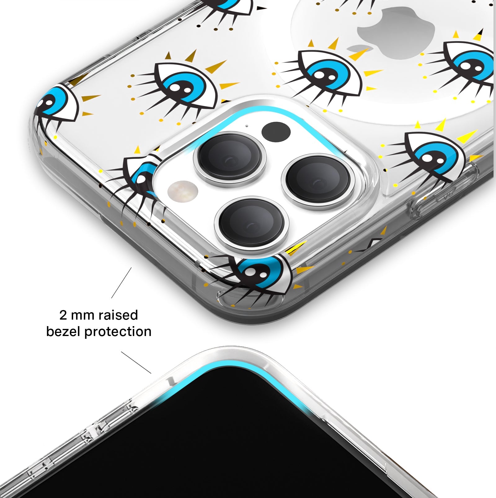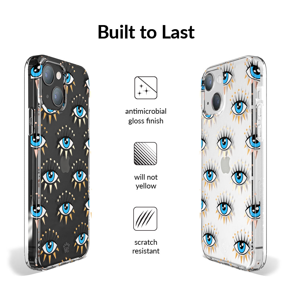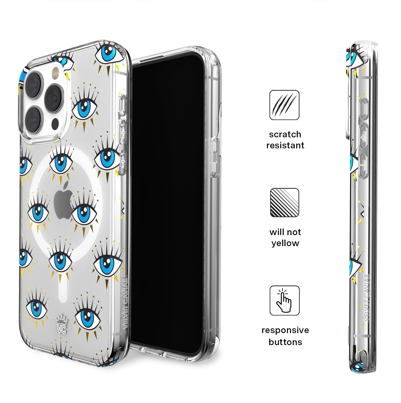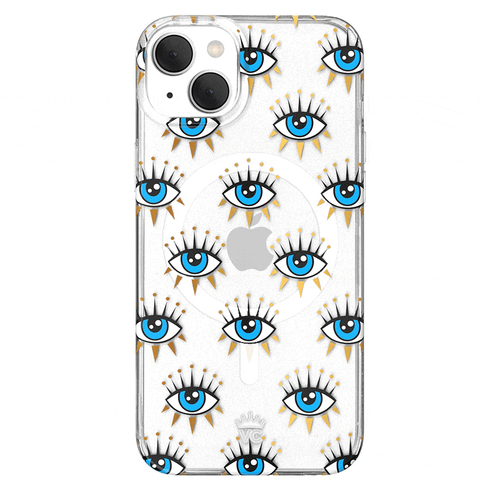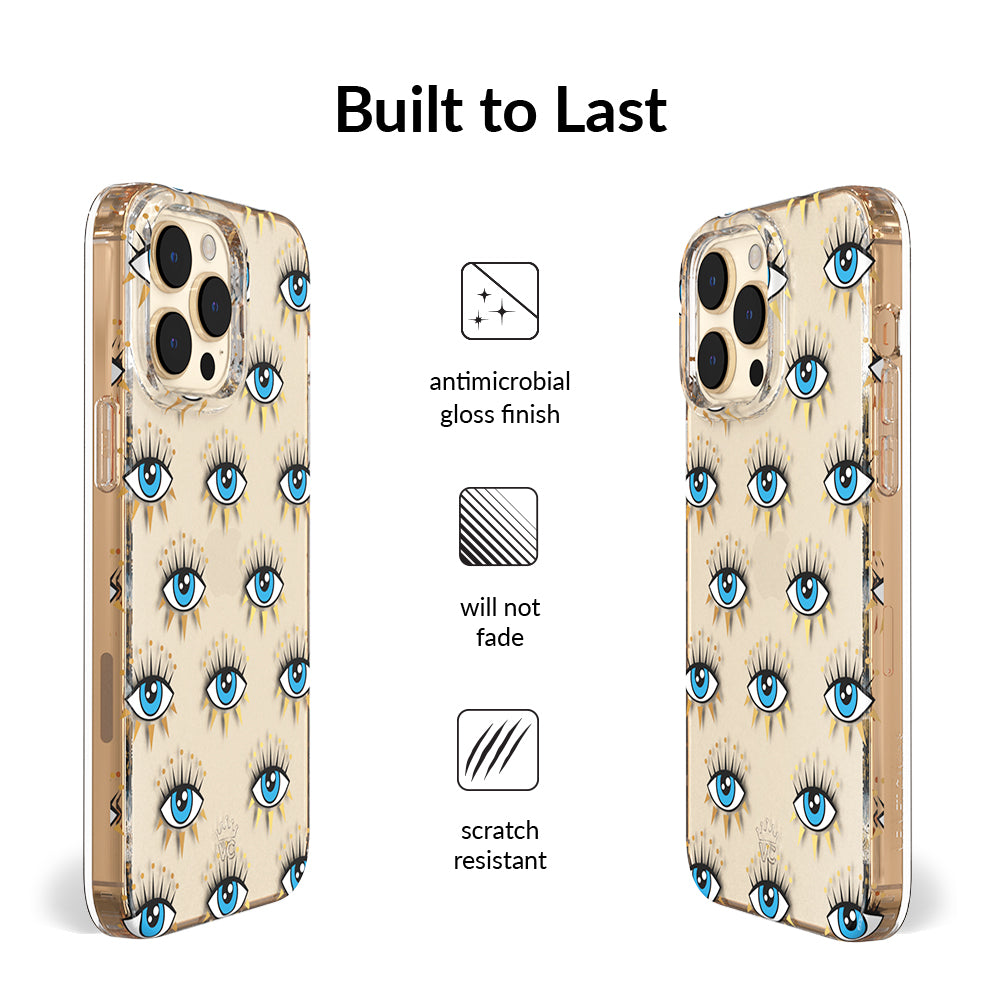 This protective clear case is covered in hand-drawn eye pattern with shiny chrome effects to block out all the negative vibes!