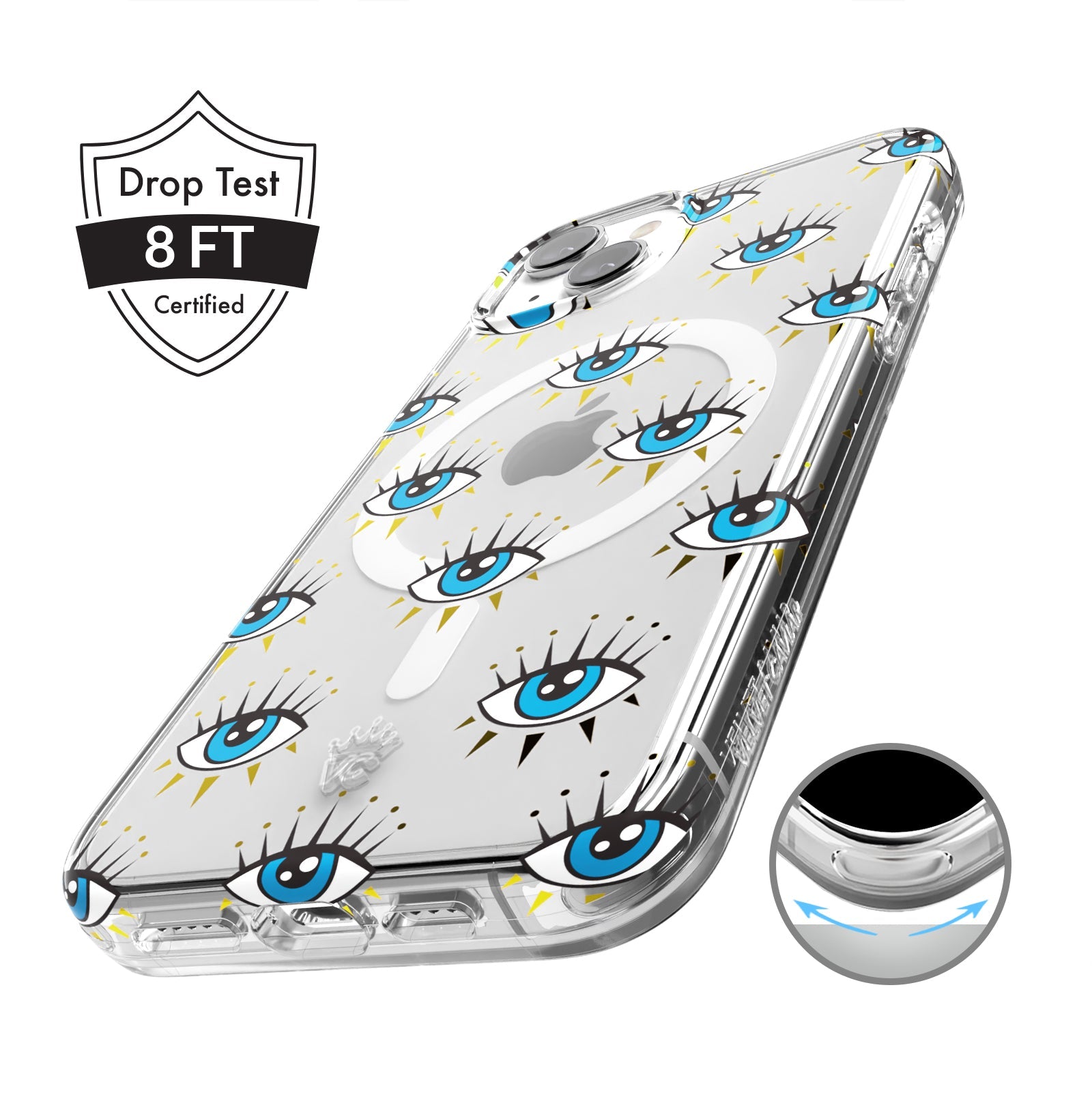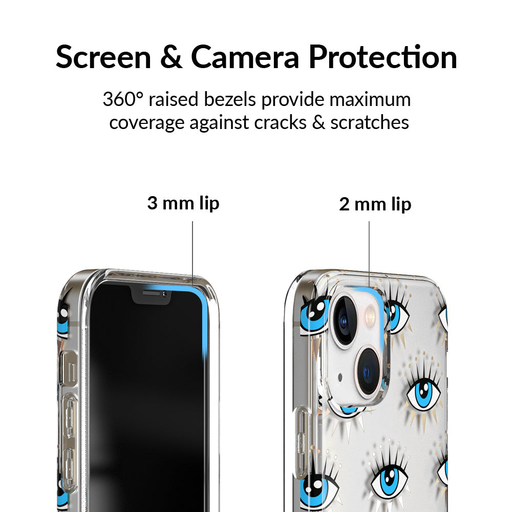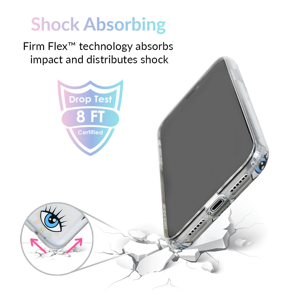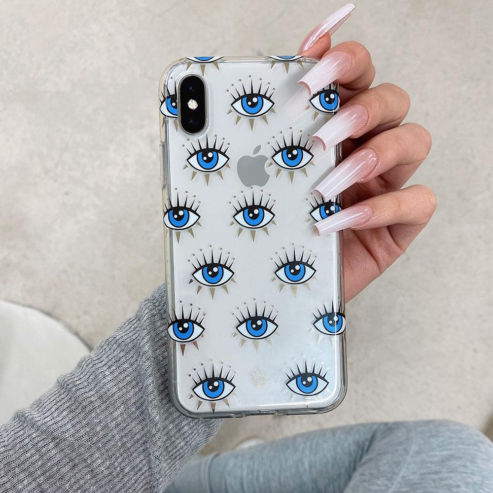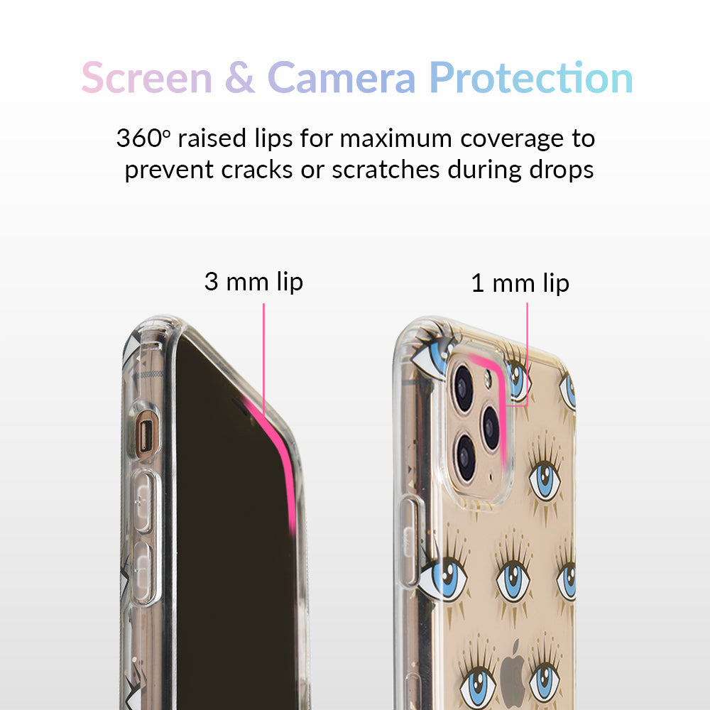 This protective clear case is covered in hand-drawn eye pattern with shiny chrome effects to block out all the negative vibes!