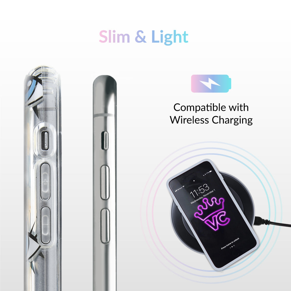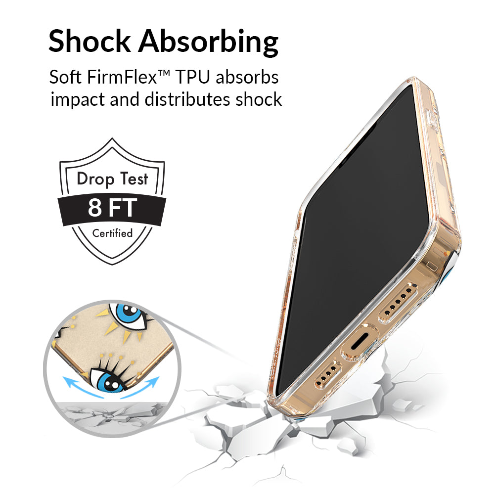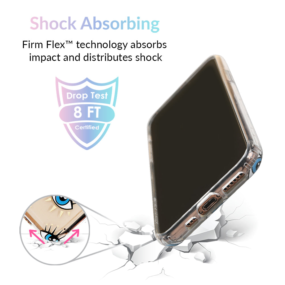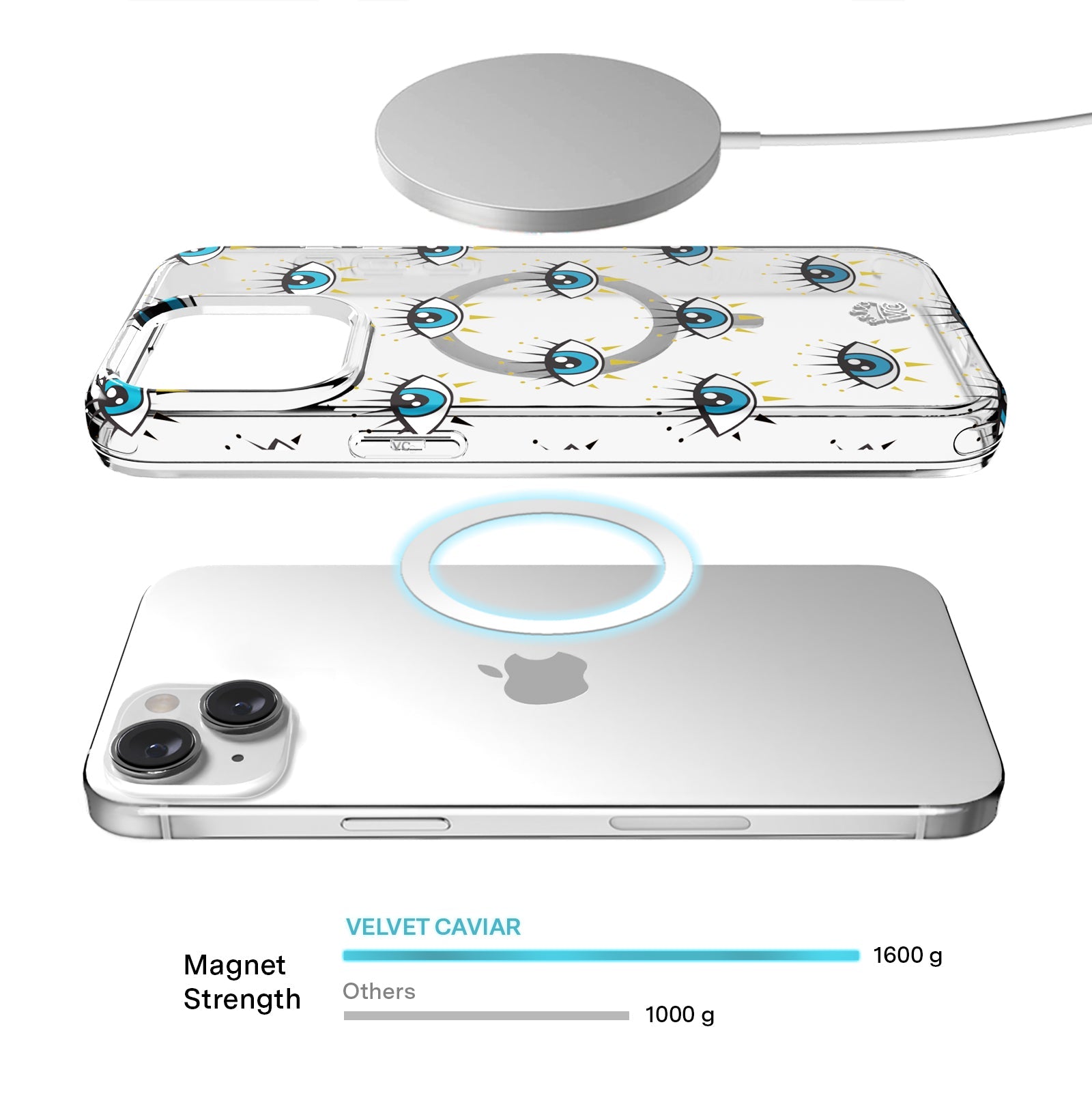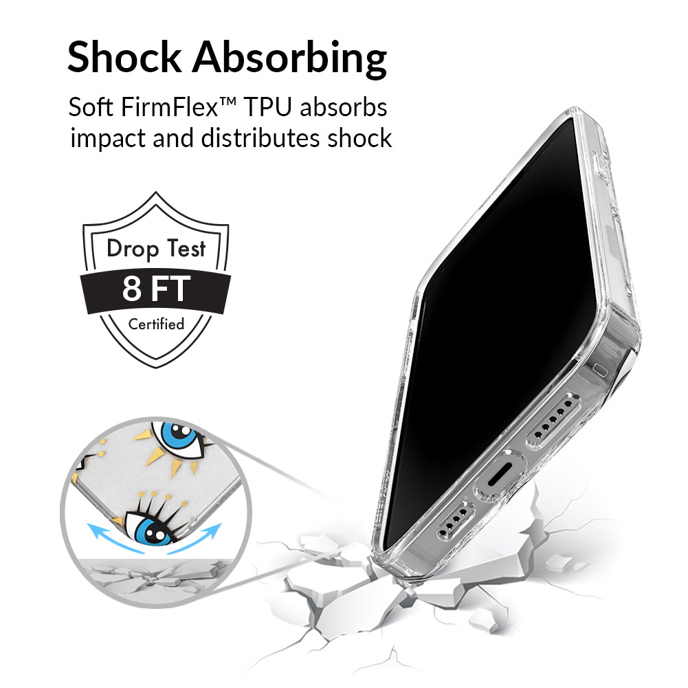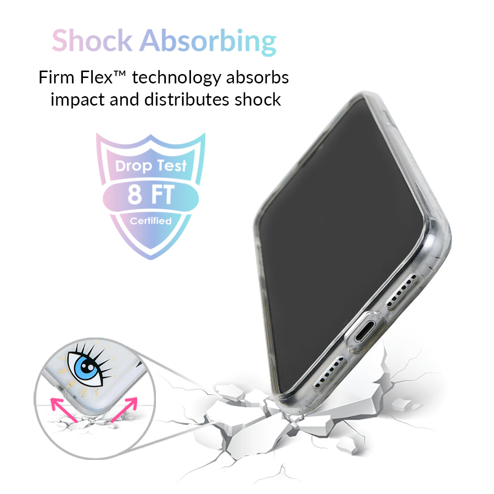 This protective clear case is covered in hand-drawn eye pattern with shiny chrome effects to block out all the negative vibes!