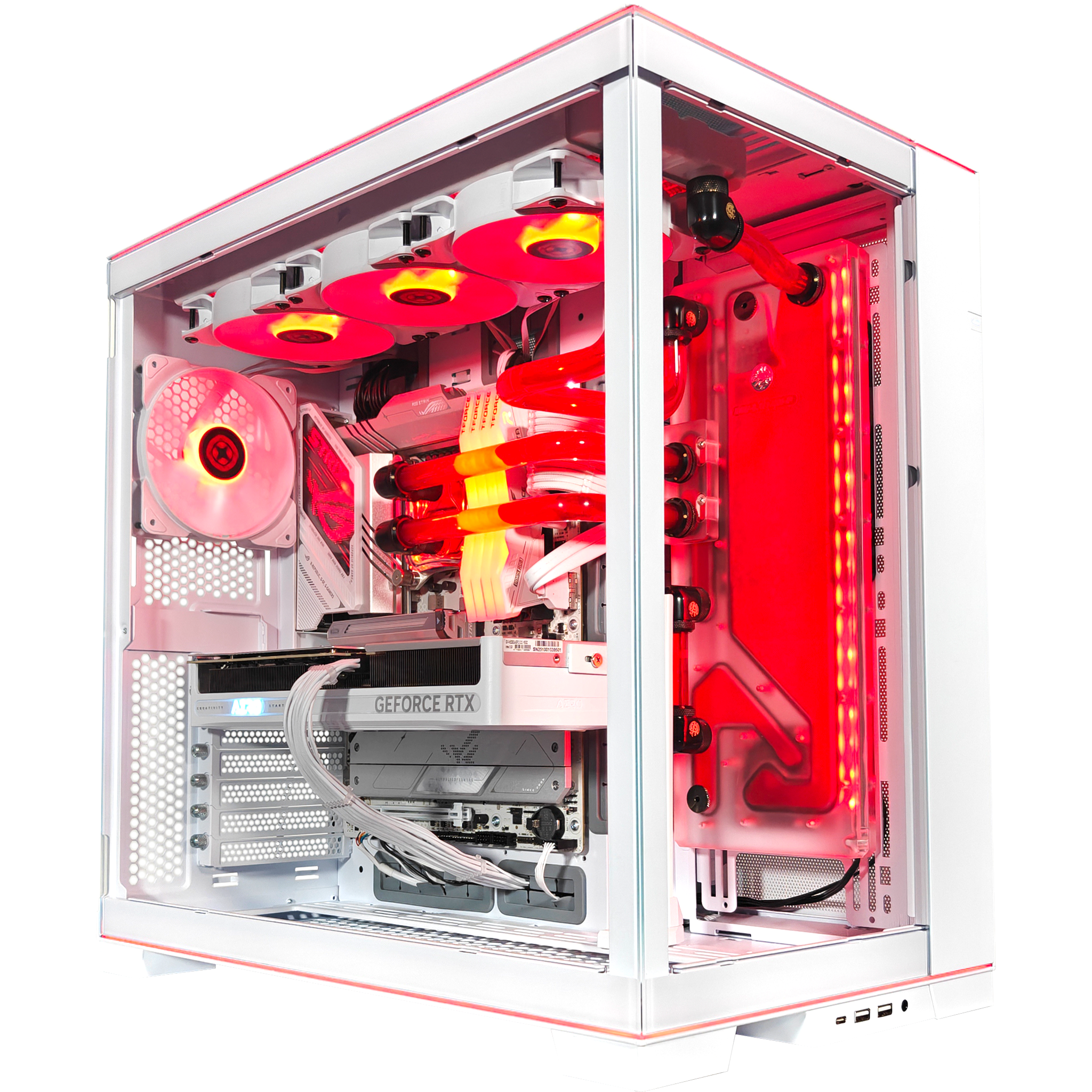 The O11D EVO is a masterpiece of PC design. blending stunning aesthetics with top-tier functionality. Featuring dual 1.5mm thick L-shaped ARGB strips with 14 dynamic lighting effects. a reversible chassis. and a removable front pillar for an unobstructed view. this case is built for those who want their setup to shine. Inside. it's powered by an Intel® Core™ Ultra 9 285K and NVIDIA® GeForce RTX™ 5080 16GB WHITE EDITION. paired with 64GB DDR5 5200MHz memory for high-speed multitasking and next-gen gaming. The ASUS ROG STRIX Z890-A GAMING WIFI motherboard delivers Thunderbolt™ 4. USB 10Gbps. and Wi-Fi 7. while 4TB of Gen 4 NVMe SSD storage ensures lightning-fast load times. Cooling is handled by a LIAN LI EK-Mana Hardline CPU Liquid Cooler. keeping performance at its peak. Thoughtful cable management. optional vertical and upright GPU mounts. and a spacious interior make customization effortless. Housed in the Lian Li O11 Dynamic EVO RGB White. this build isn't just powerful—it's a statement piece. backed by a Lifetime Parts & Labor Limited Warranty with a Future Trade-In & Lifetime Upgrade Policy.
