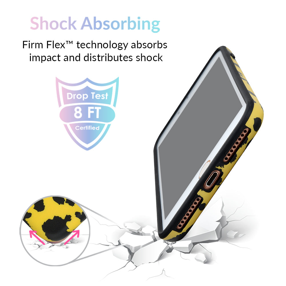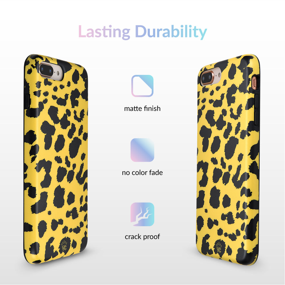 Made in the concrete jungle of NY. this protective case features a bright golden yellow background with black cheetah print spots.