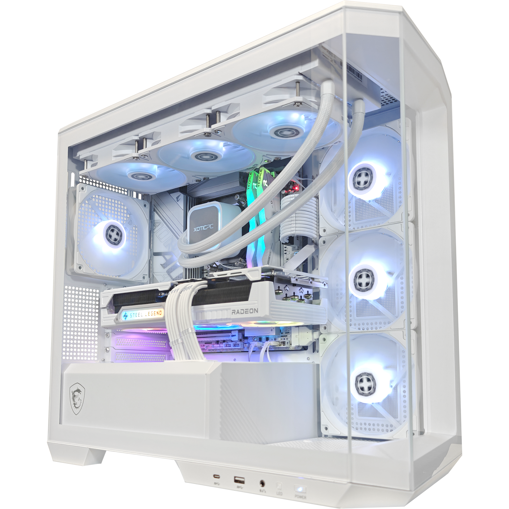 Keeping this rig cool is a 360mm AIO water cooler. supported by four pre-installed ARGB fans. including three reverse-blade side fans for maximum airflow and lighting brilliance. The integrated 1-to-4 ARGB-PWM control board lets you fine-tune the aesthetics and performance to match your vibe. Powering it all is the MSI MPG 750W GOLD PSU. delivering rock-solid reliability.