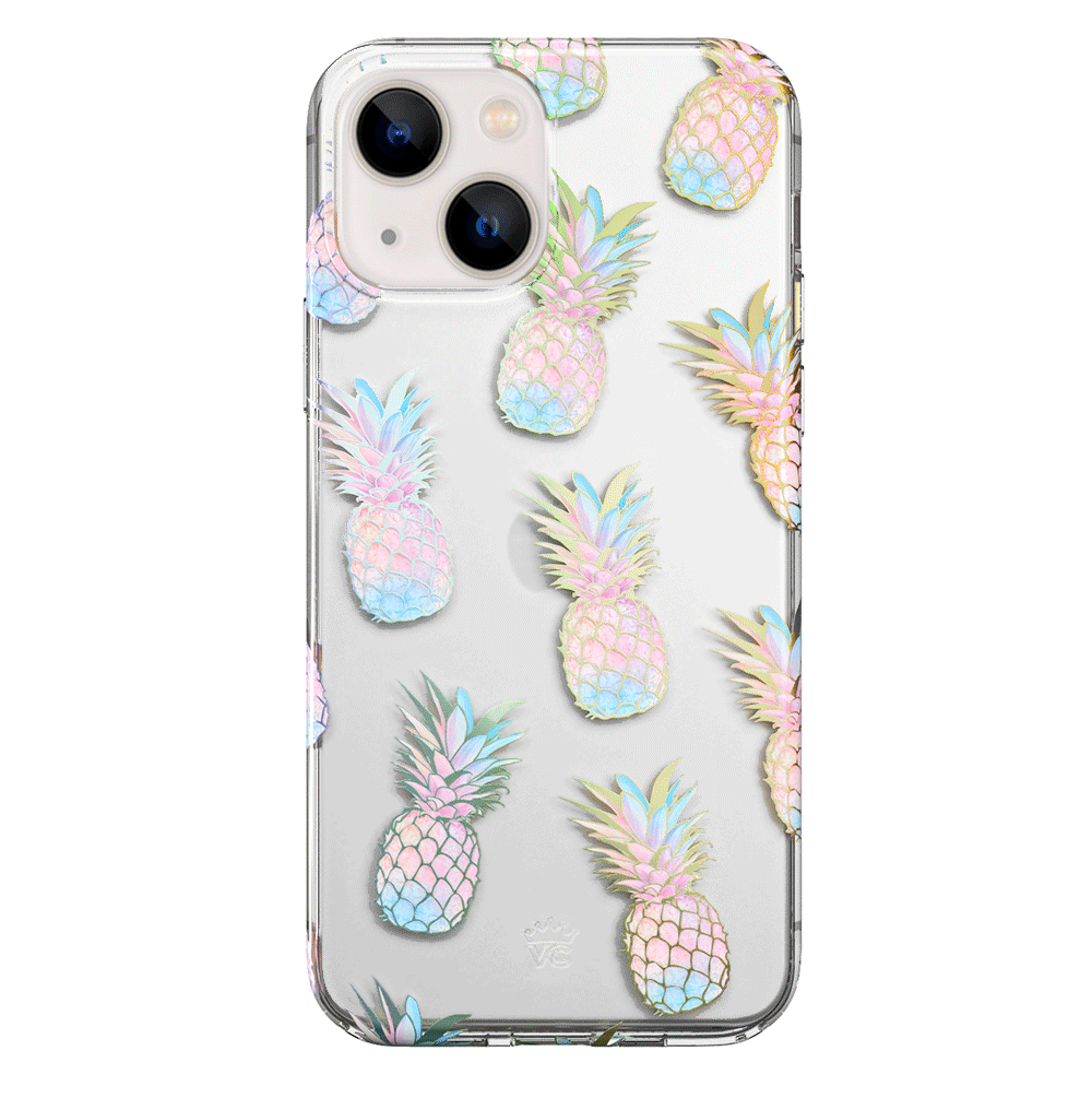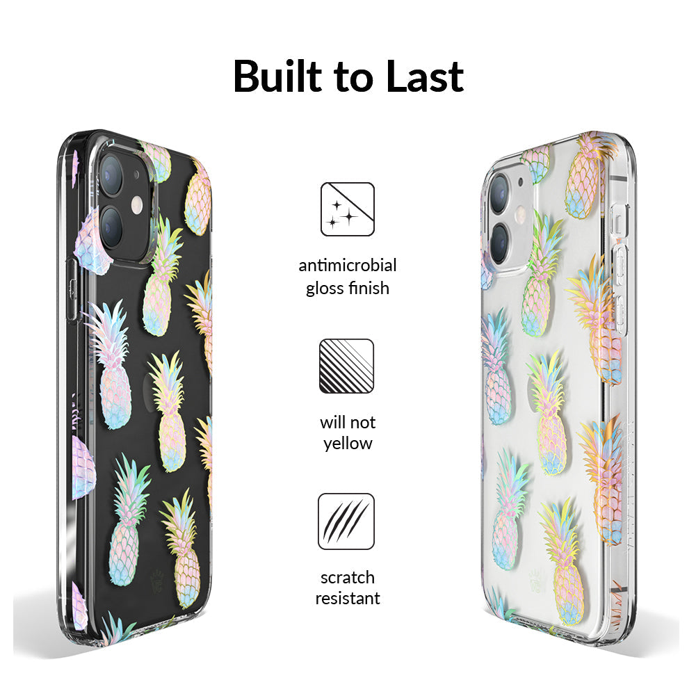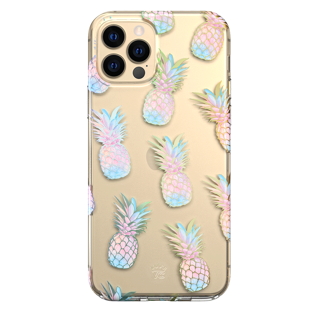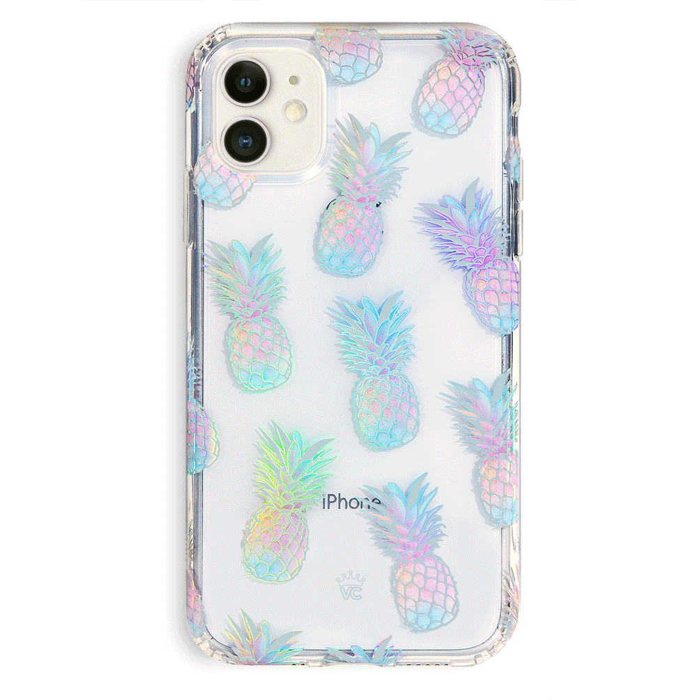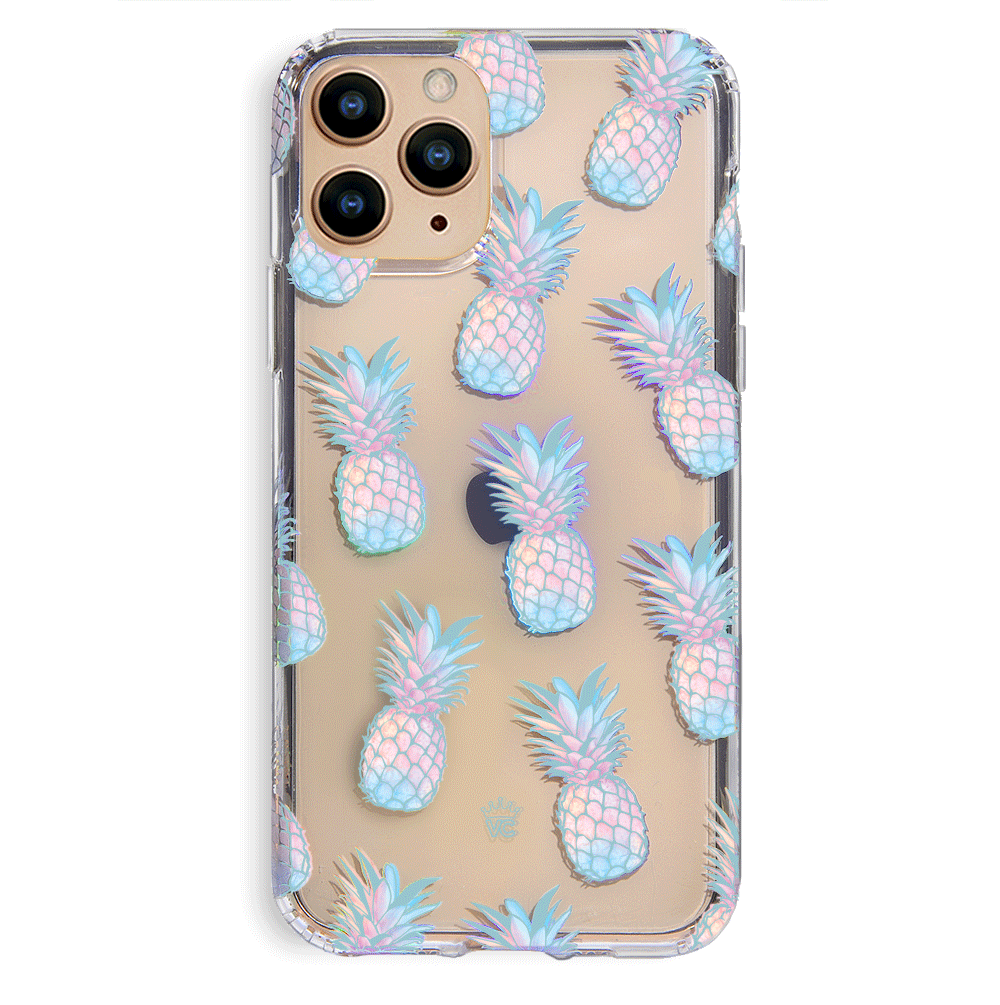 Taste the summer with our Pineapple Holo! This protective clear case has cute hand-drawn holographic pineapples with a matching clear front bumper.