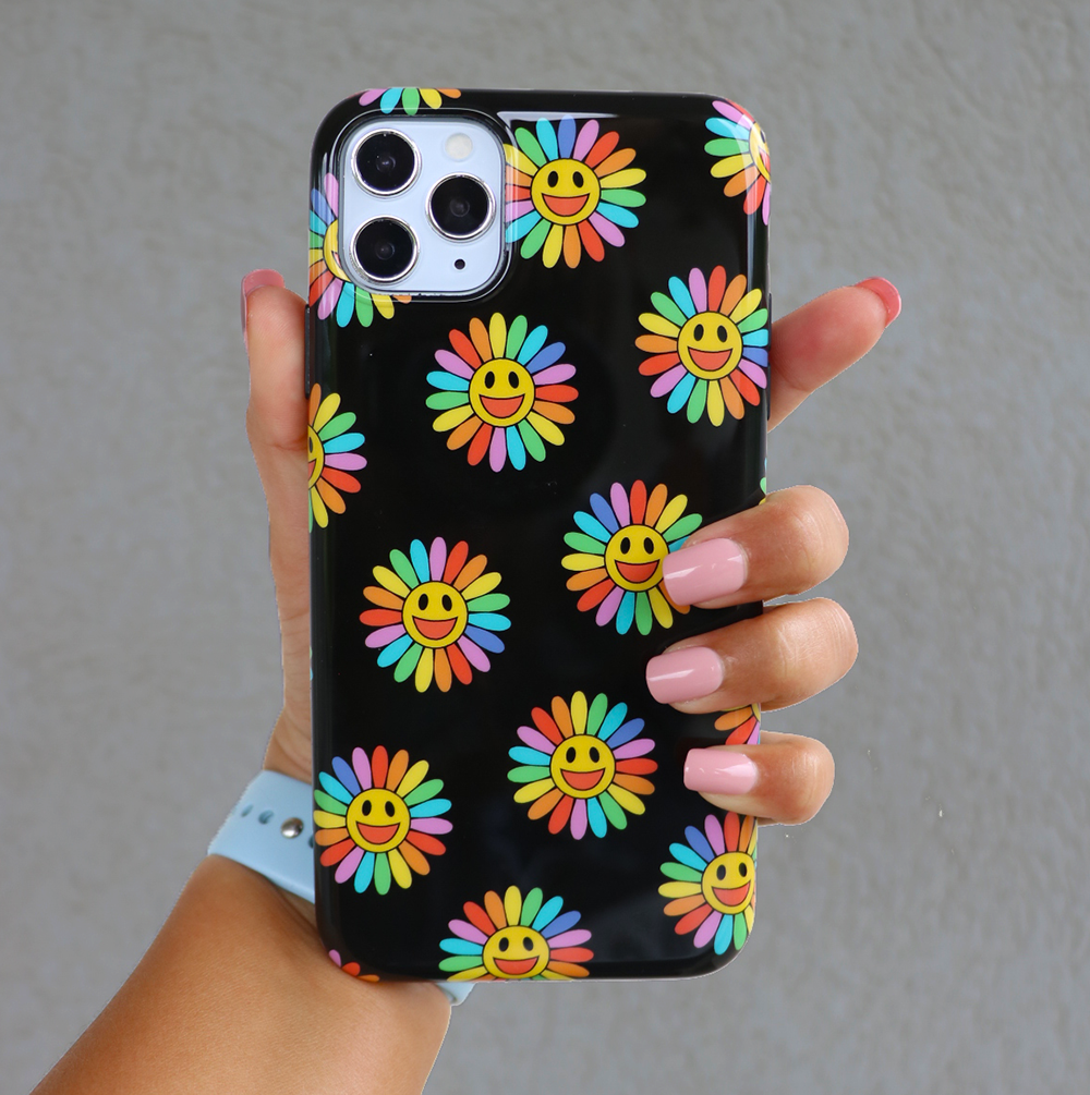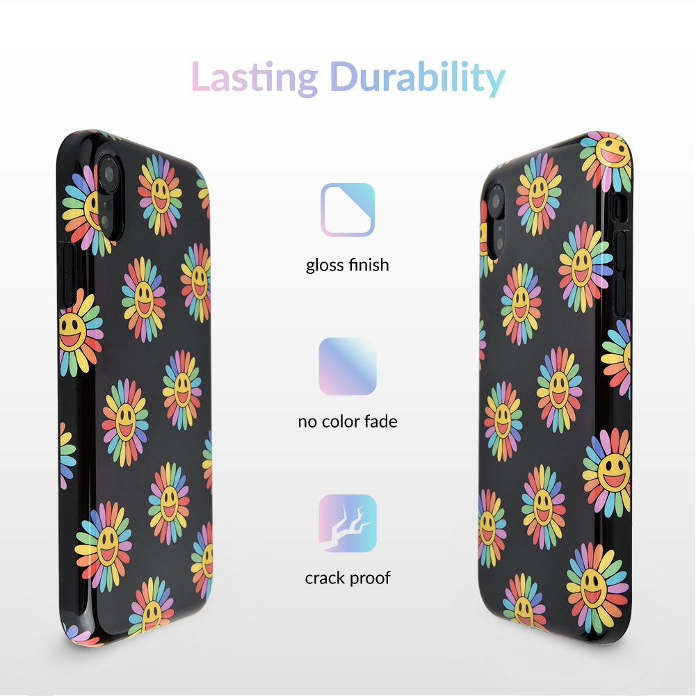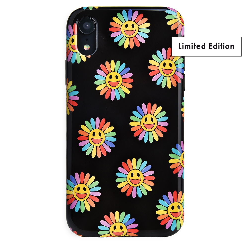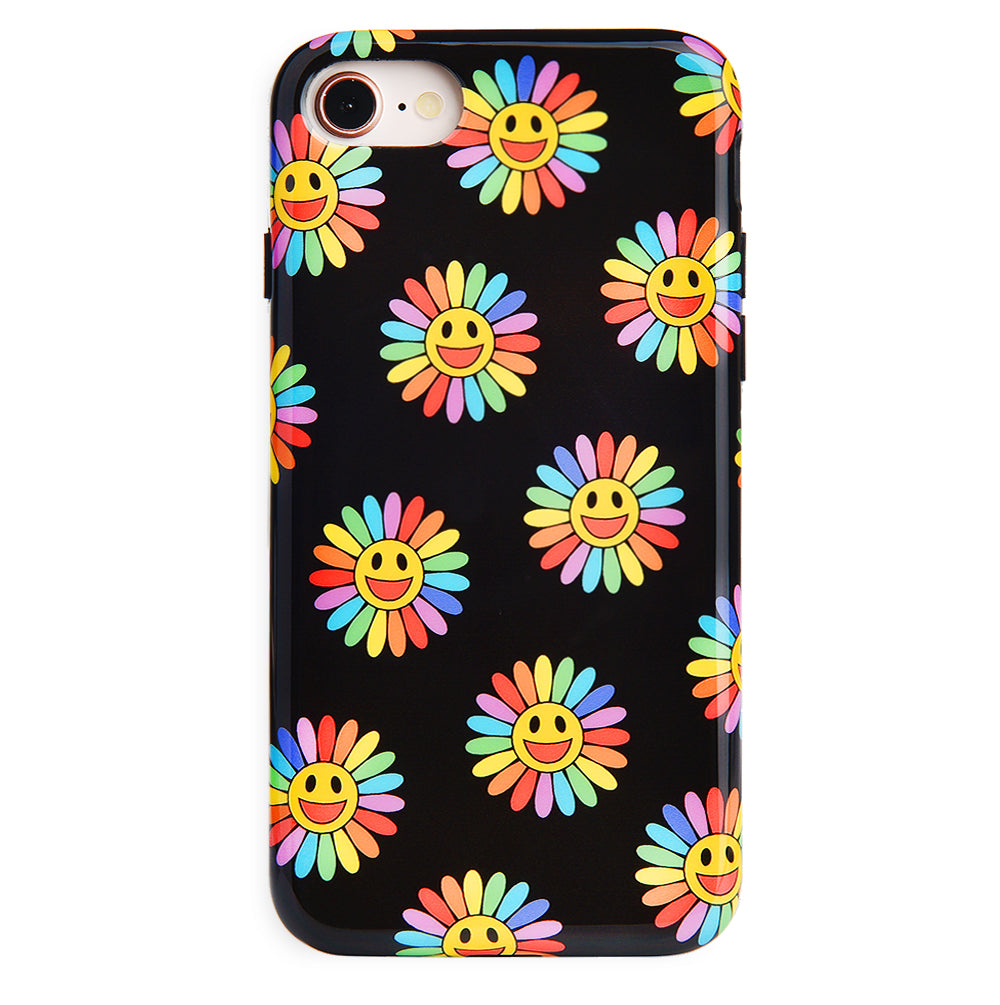 A not so subtle reminder to SMILE! This playful but protective case features a black background with a happy smiley face surrounded by rainbow petals.