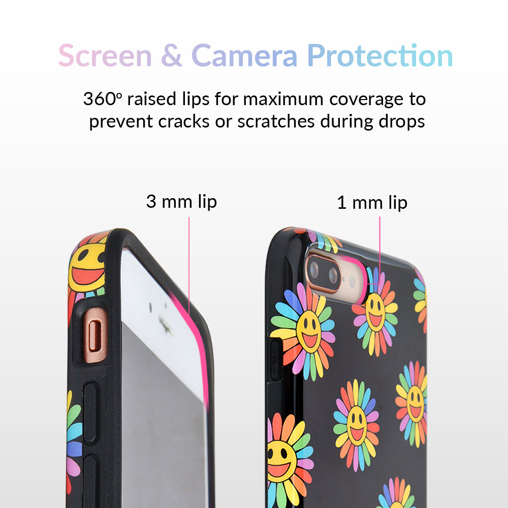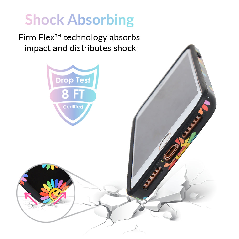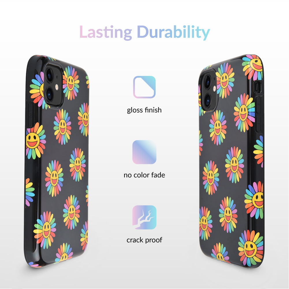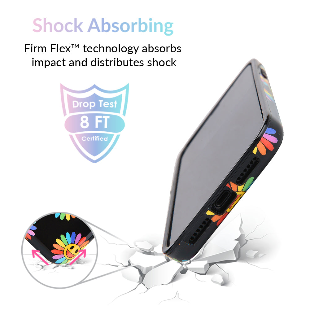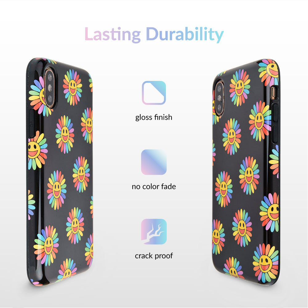 A not so subtle reminder to SMILE! This playful but protective case features a black background with a happy smiley face surrounded by rainbow petals.