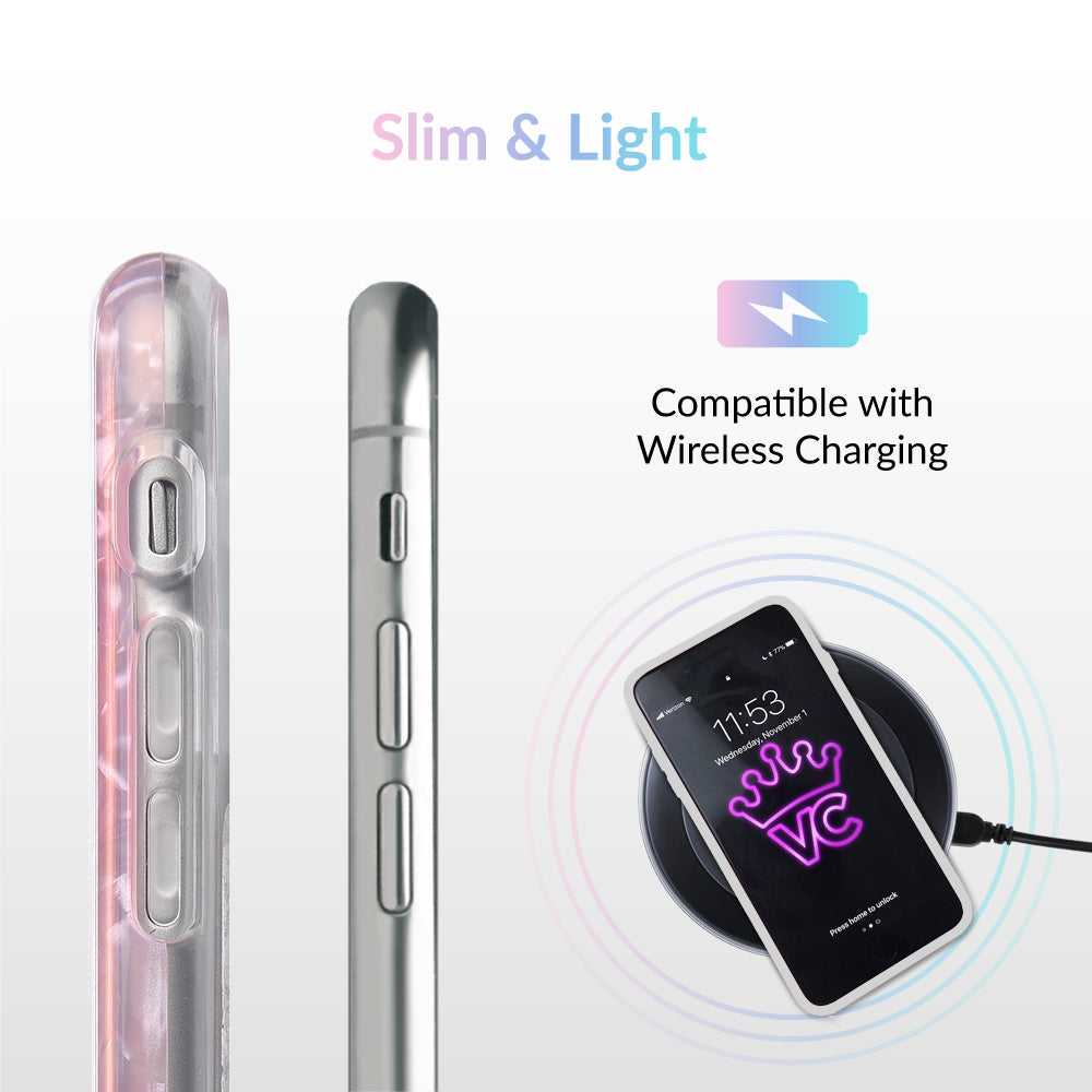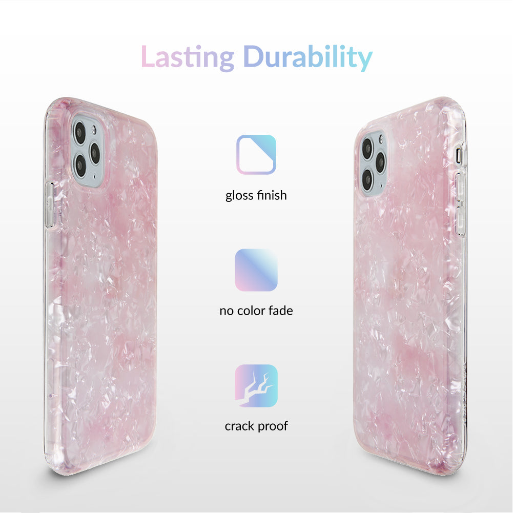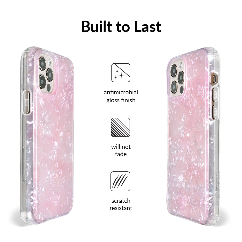 Inspired by the stone of universal love and eternal peace. This protective clear case has an acrylic layer of pale pink coloring inspired by the many facets of rose quartz.