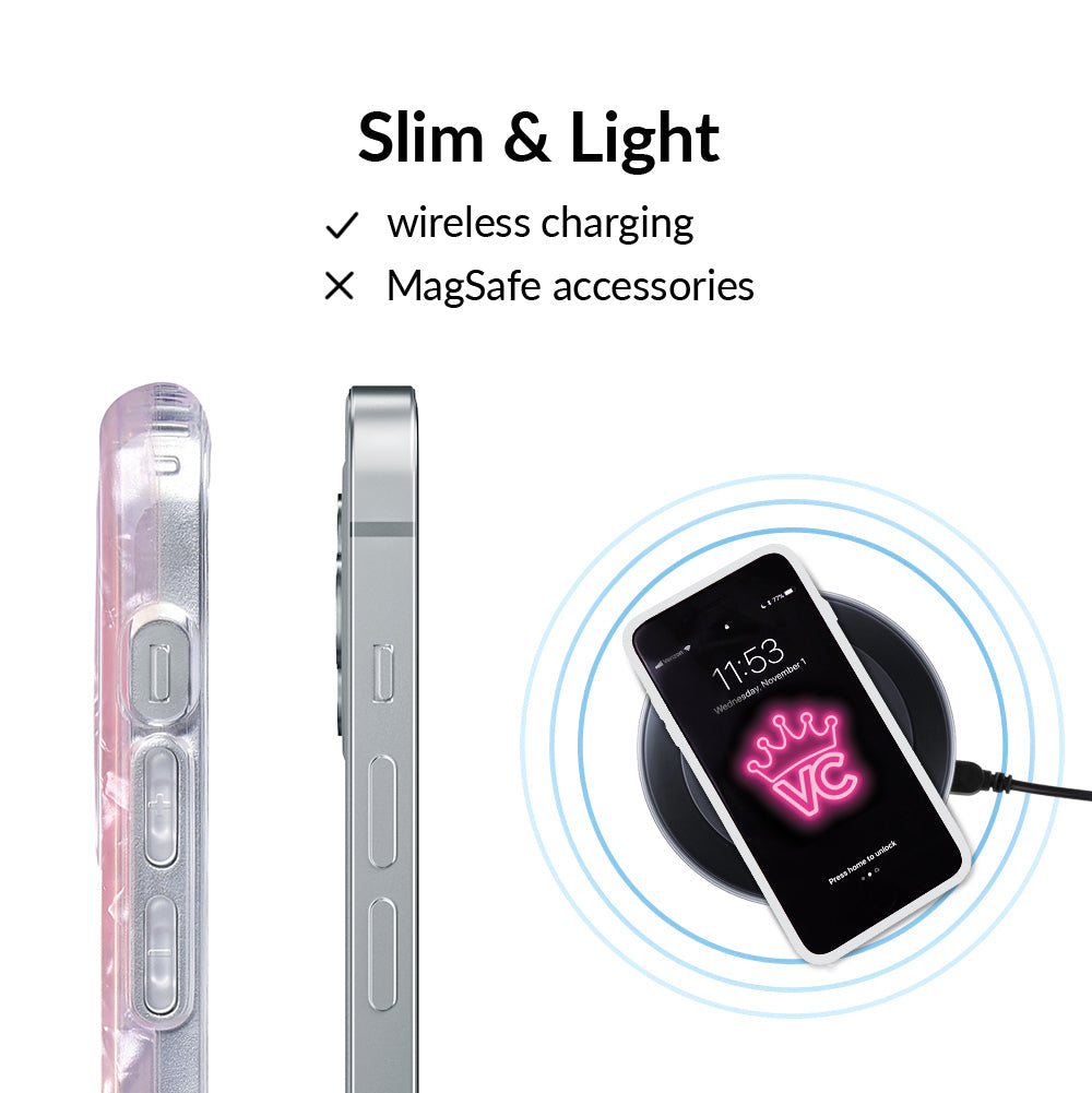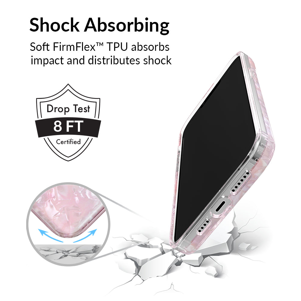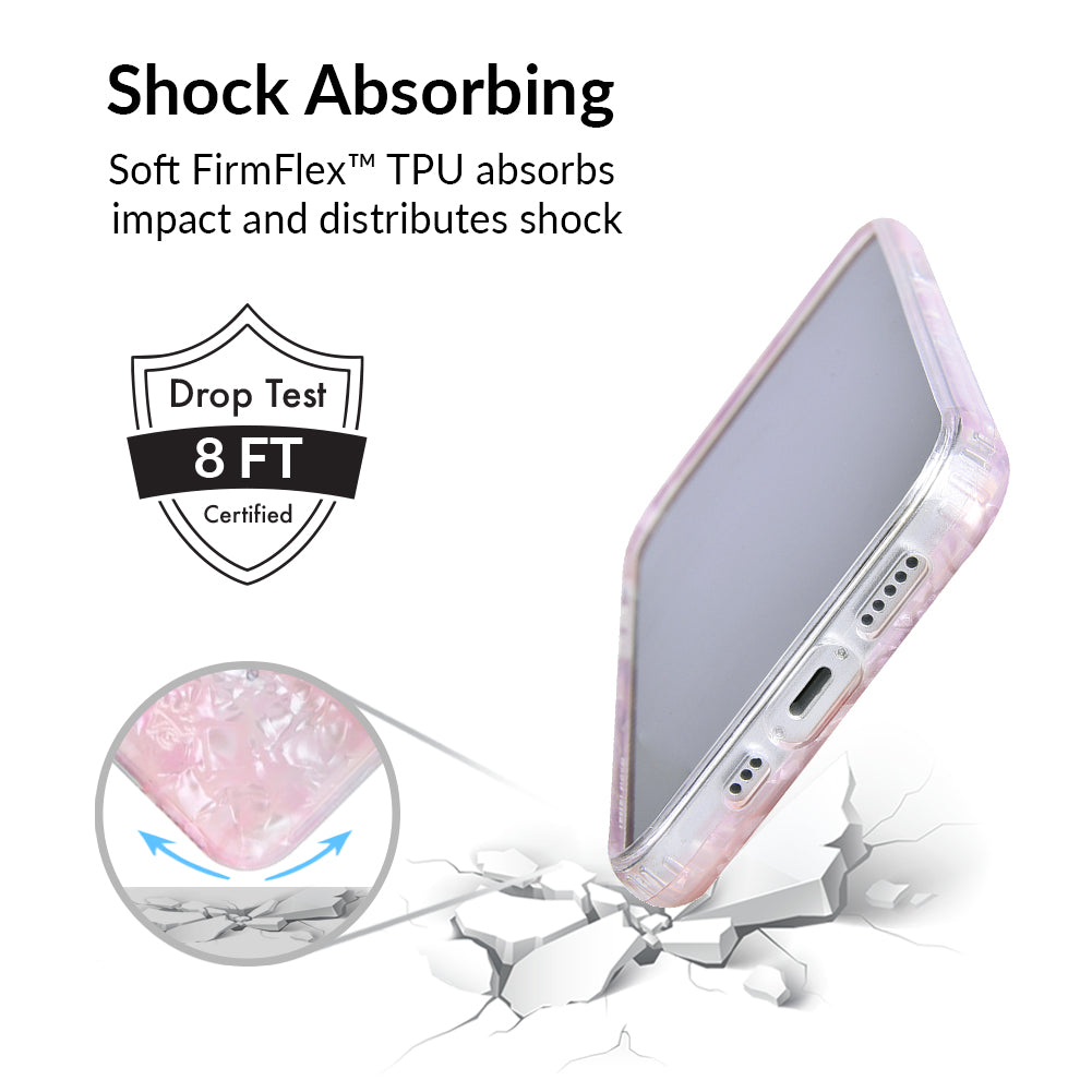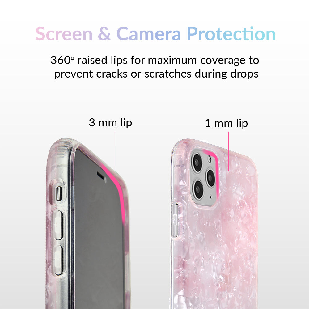 Inspired by the stone of universal love and eternal peace. This protective clear case has an acrylic layer of pale pink coloring inspired by the many facets of rose quartz.