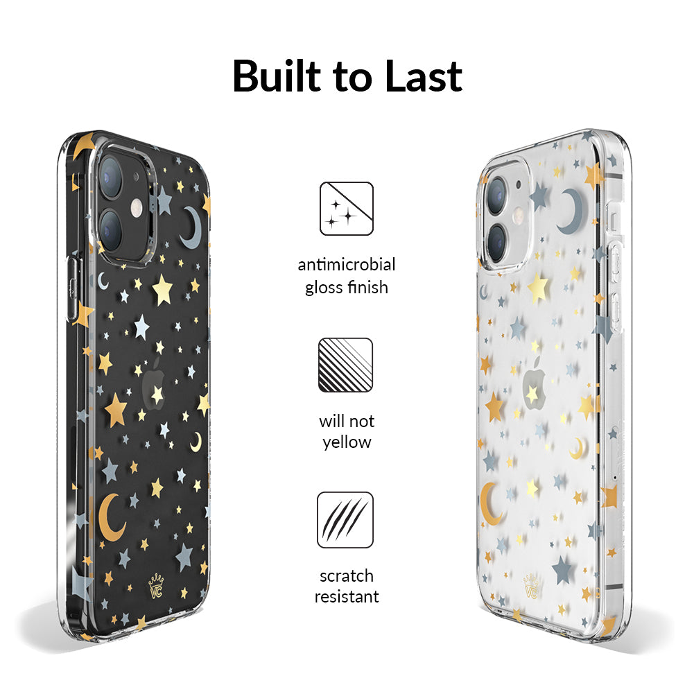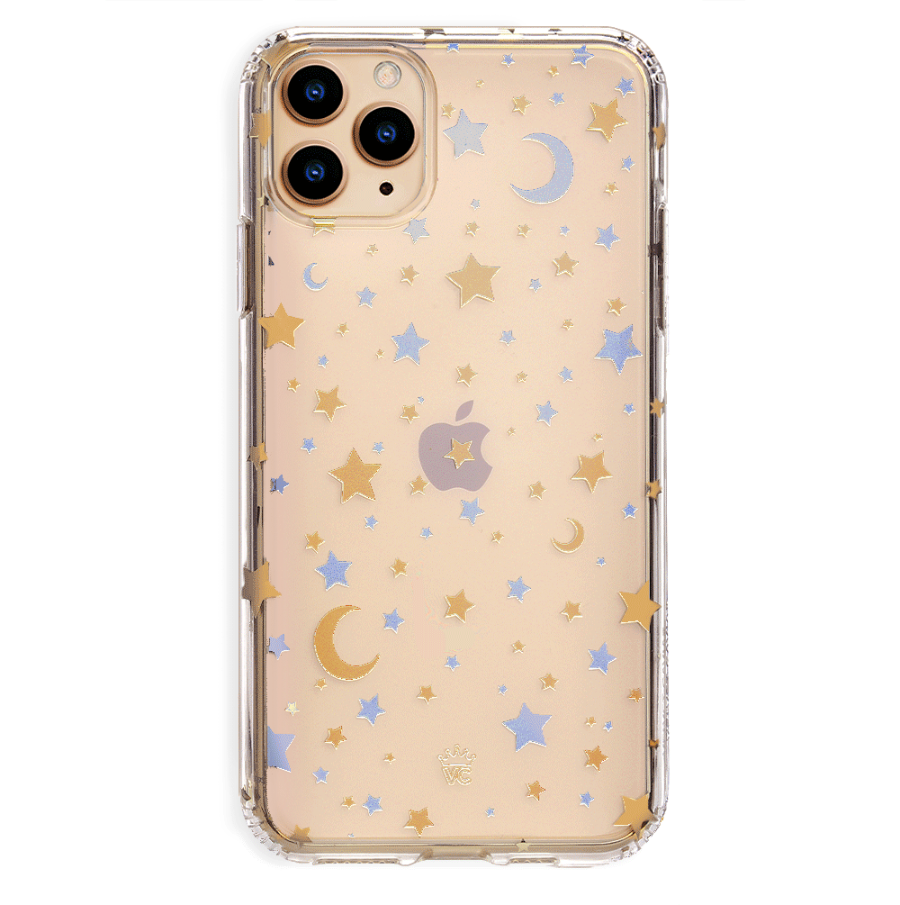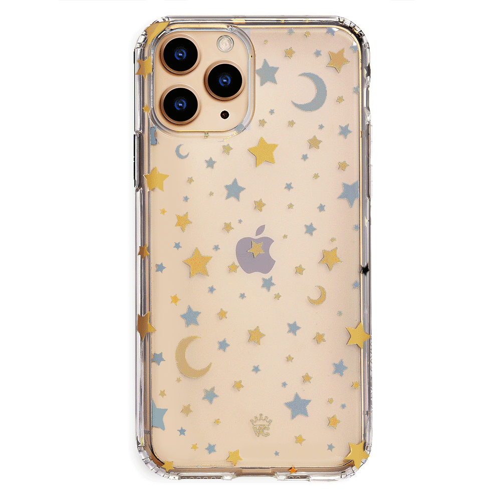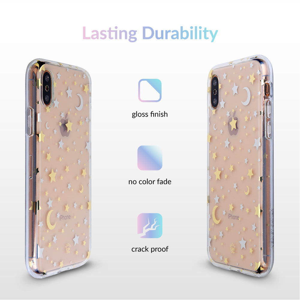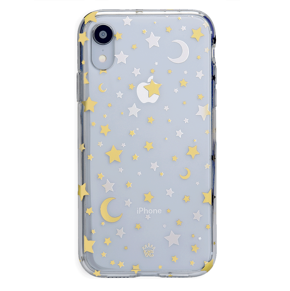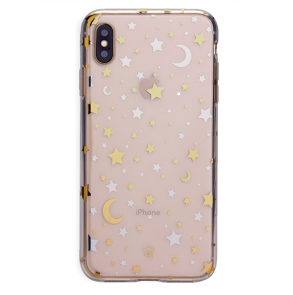 Inspired by our love for the outer galaxy and mysteries of the universe! Featuring a double-layered gold and silver chrome pattern of hand-drawn stars and moons.