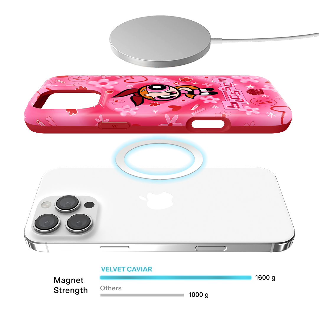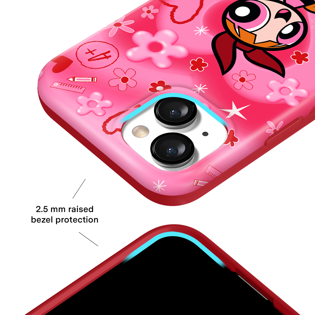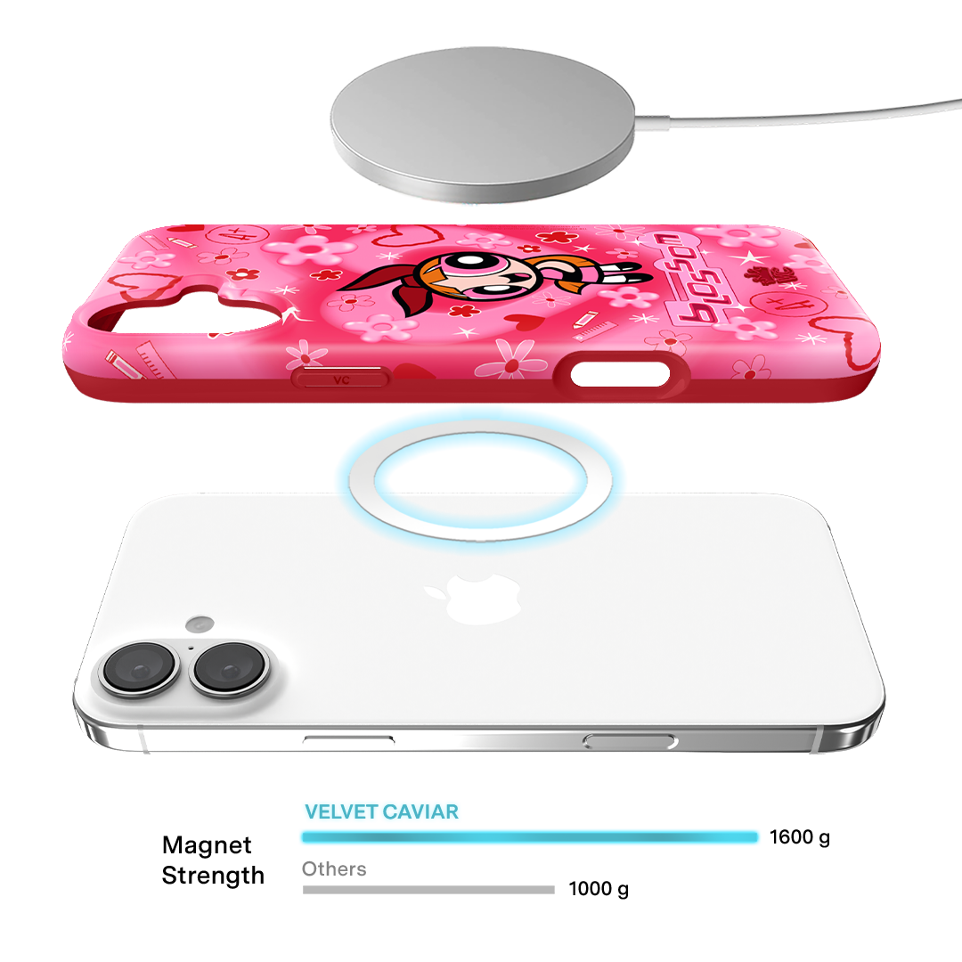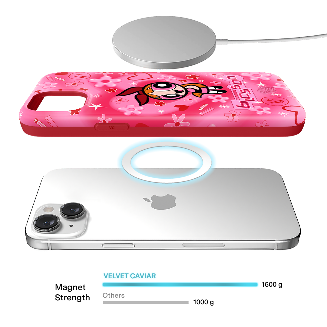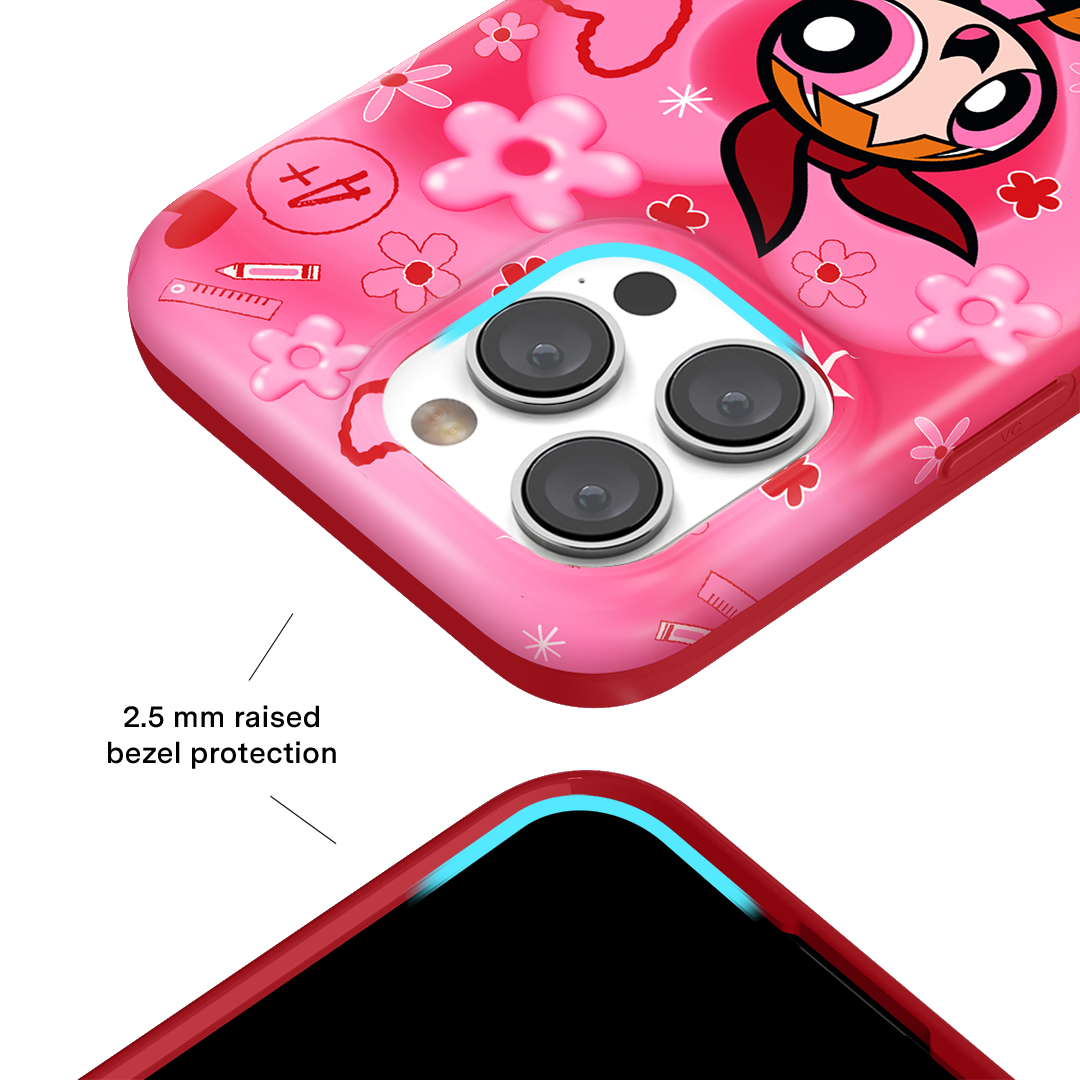 It's Blossom! This glossy MagSafe case features Blossom front and center with flowers and hearts sprinkled throughout all on a radiating pink and red heart background.In collaboration with The Powerpuff Girls™