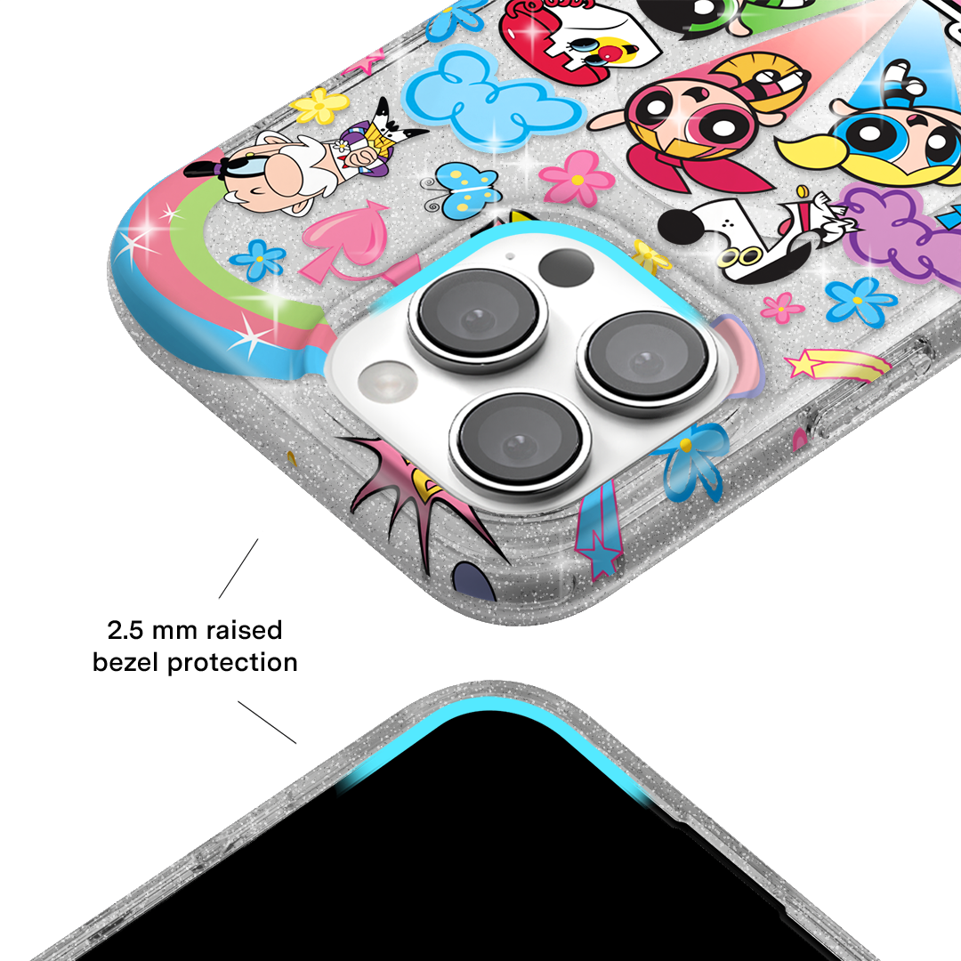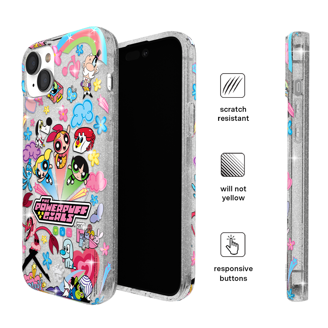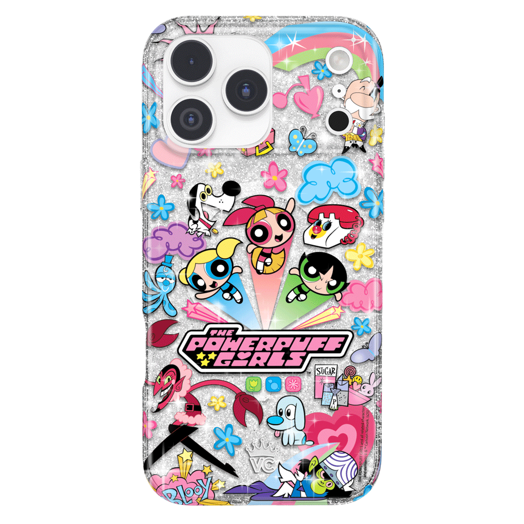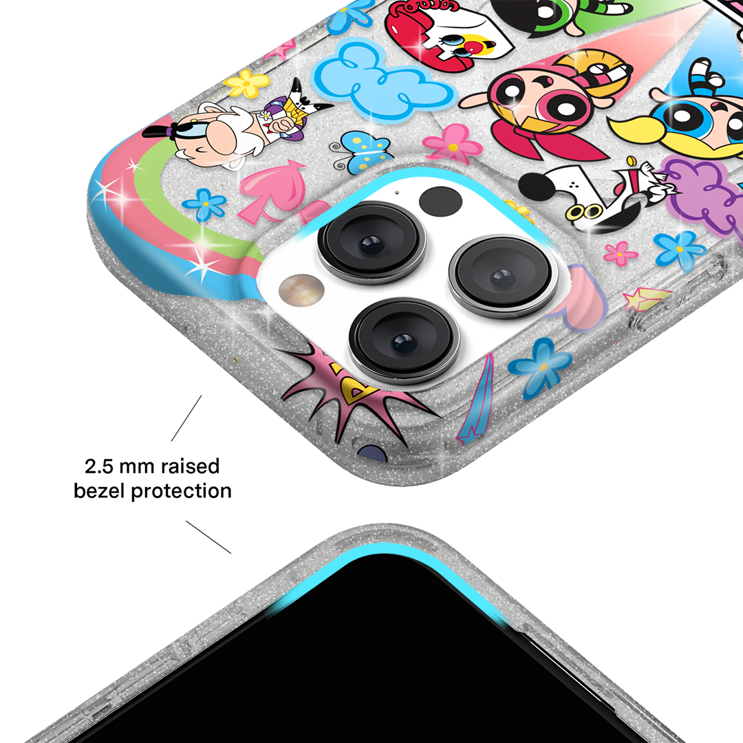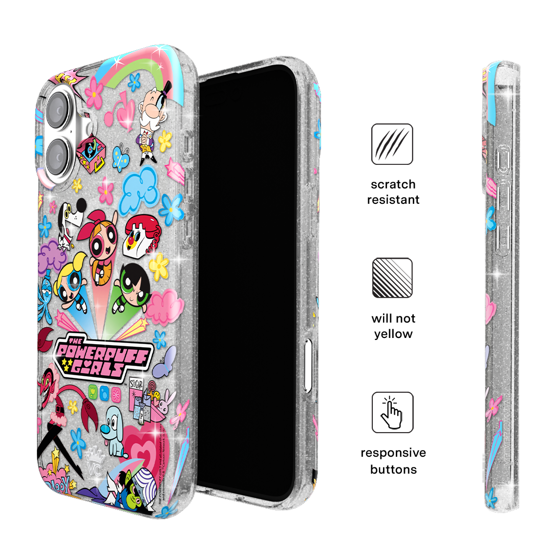 This MagSafe case features Blossom. Bubbles. and Buttercup with an array of nostalgic nods to The Powerpuff Girls all on a clear case with silver glitter sprinkled into the base and bumper.In collaboration with The Powerpuff Girls™