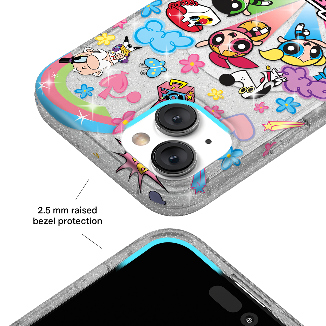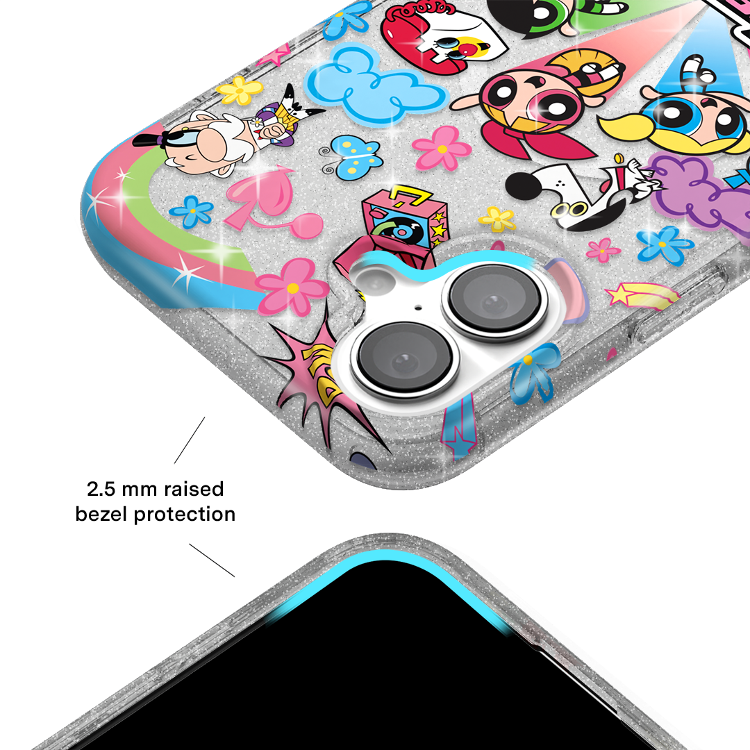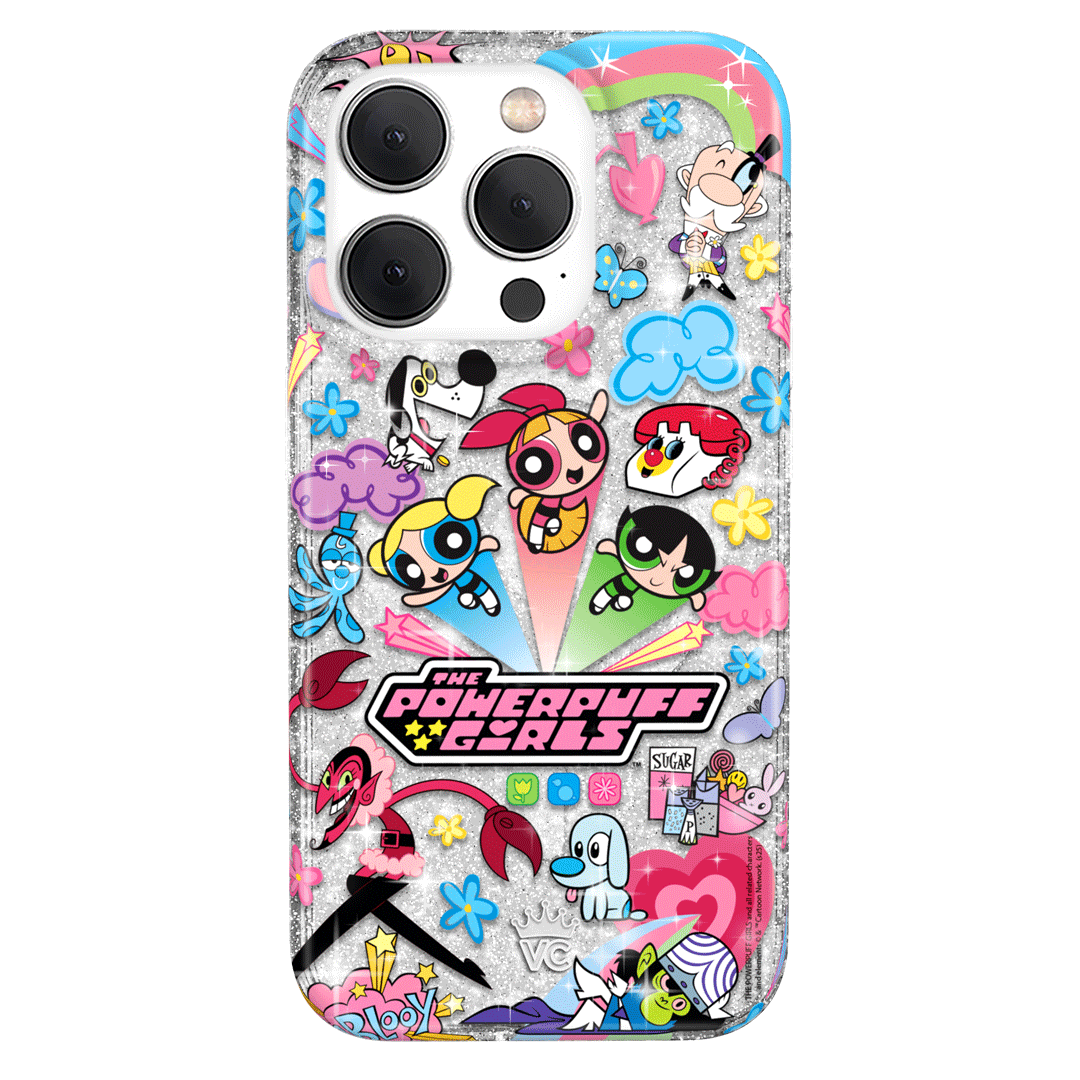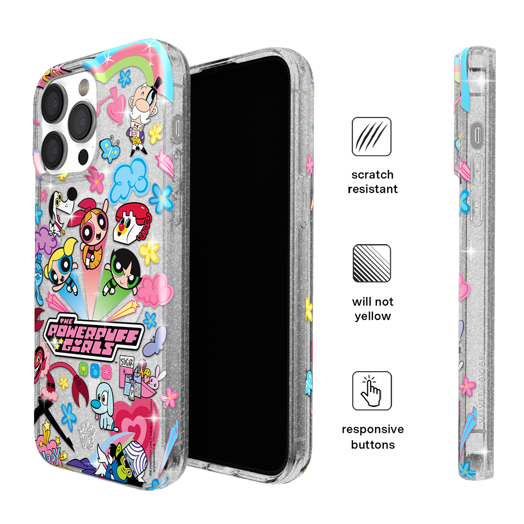 This MagSafe case features Blossom. Bubbles. and Buttercup with an array of nostalgic nods to The Powerpuff Girls all on a clear case with silver glitter sprinkled into the base and bumper.In collaboration with The Powerpuff Girls™