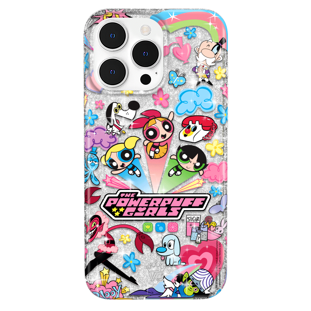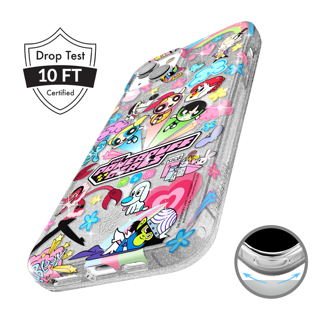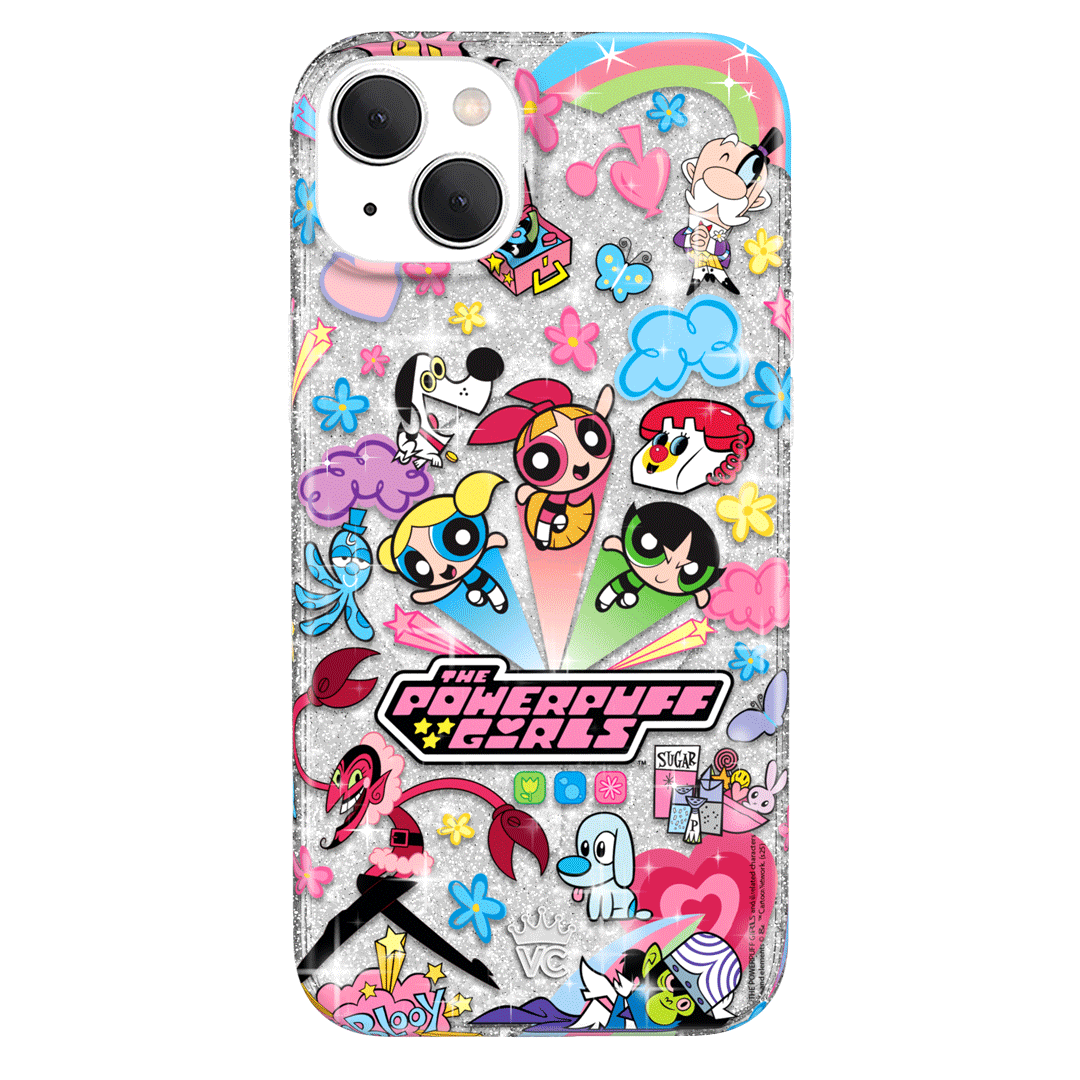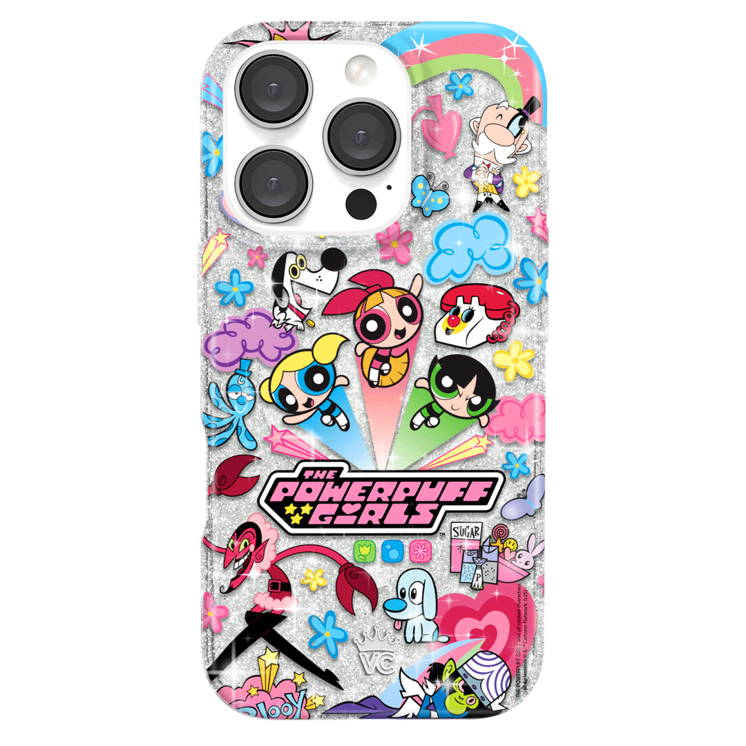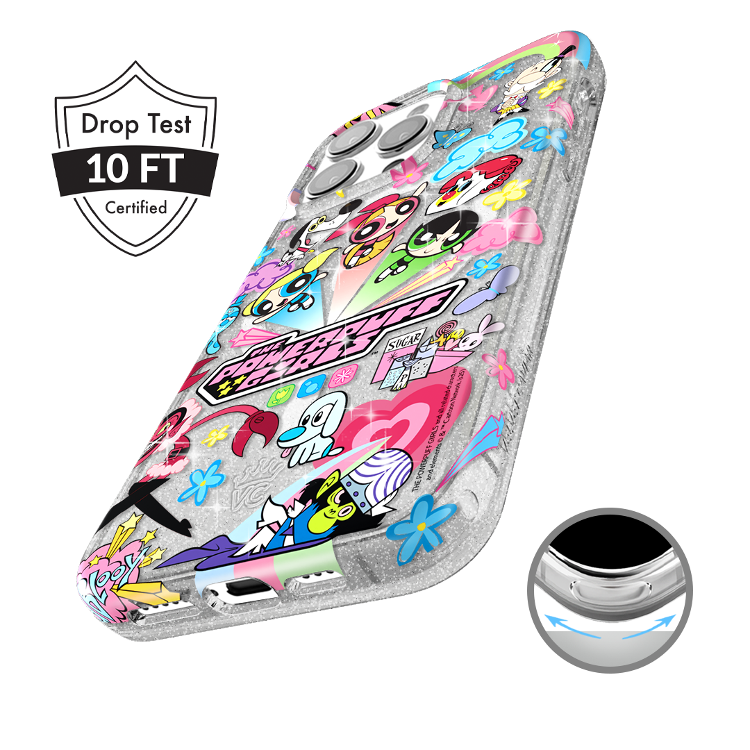 This MagSafe case features Blossom. Bubbles. and Buttercup with an array of nostalgic nods to The Powerpuff Girls all on a clear case with silver glitter sprinkled into the base and bumper.In collaboration with The Powerpuff Girls™