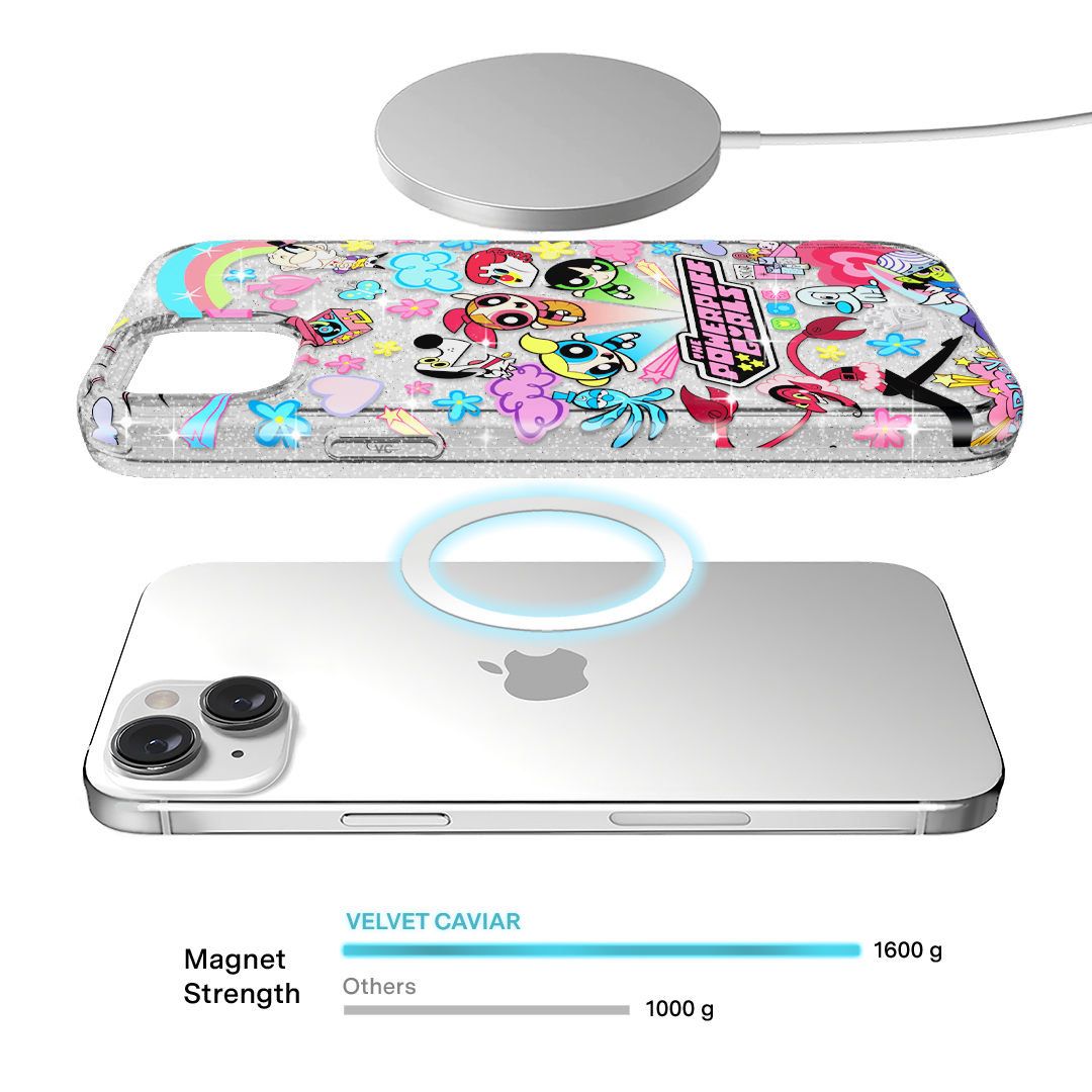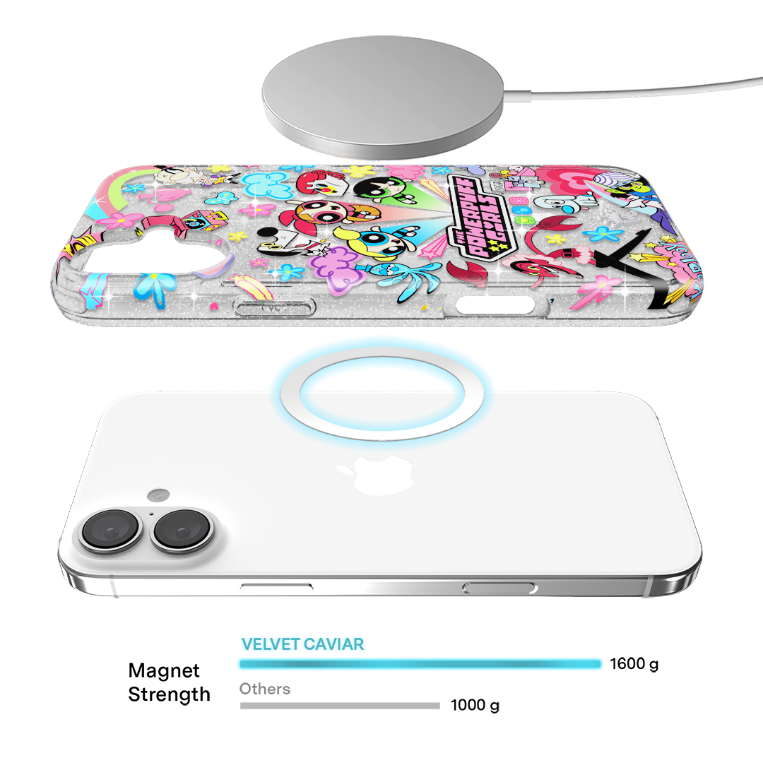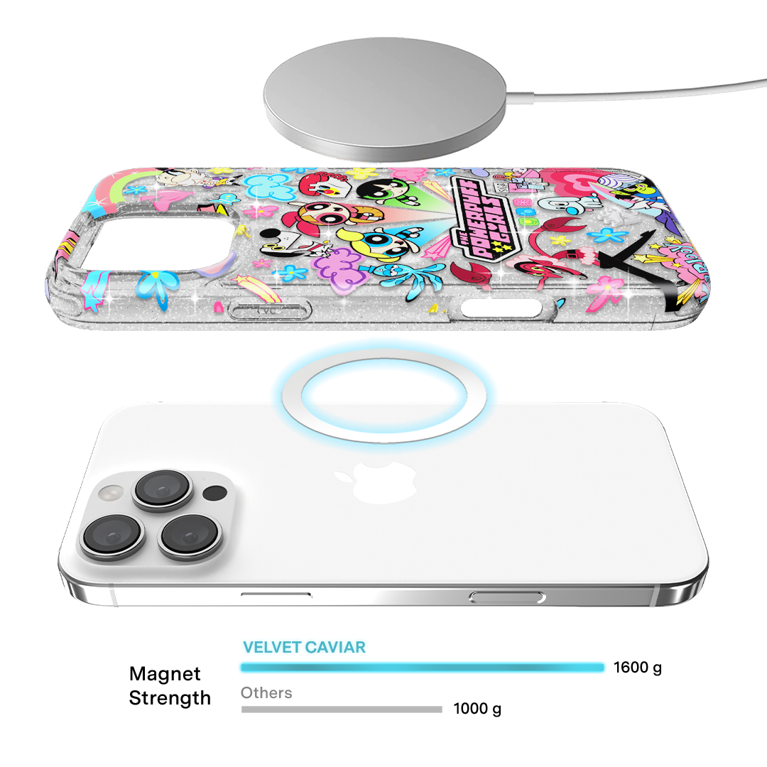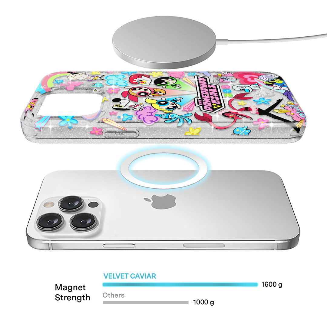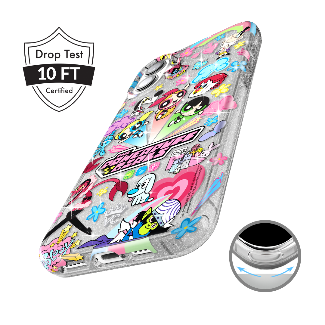 This MagSafe case features Blossom. Bubbles. and Buttercup with an array of nostalgic nods to The Powerpuff Girls all on a clear case with silver glitter sprinkled into the base and bumper.In collaboration with The Powerpuff Girls™