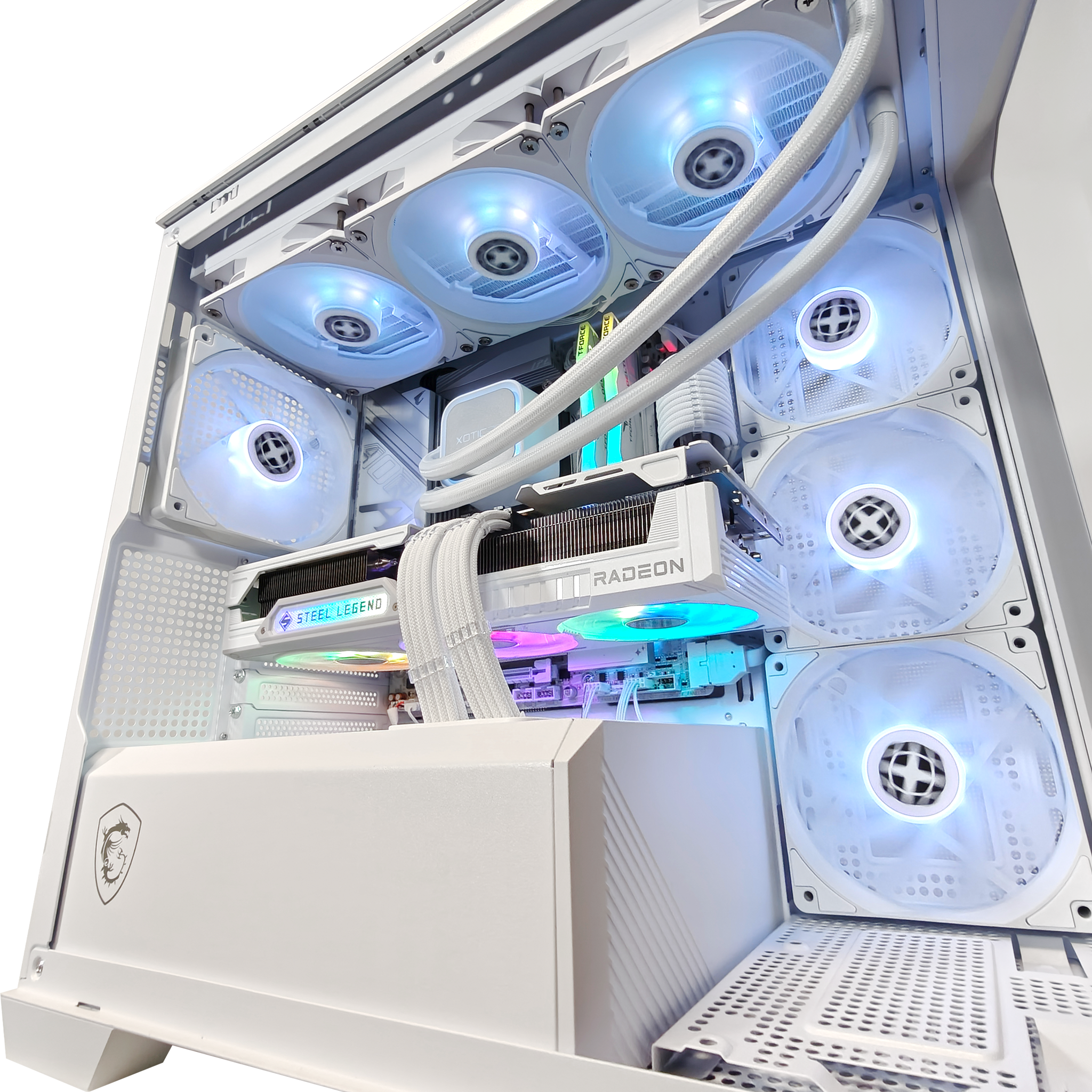 Inside. it's all about performance. Powered by the AMD AMD Ryzen™ 7 7800X3D. this beast delivers 8 cores pushing up to 5.0GHz for lightning-fast speeds. Paired with the AMD Radeon™ RX 9070 XT. your games and creative workloads run smoother than ever. The MSI PRO B850M-A WIFI PZ motherboard keeps everything locked in with next-gen connectivity. while 32GB of DDR5 5200MHz T-Force White Delta RGB memory ensures seamless multitasking. Storage? A lightning-fast 2TB NVMe Gen 4 SSD means near-instant load times.