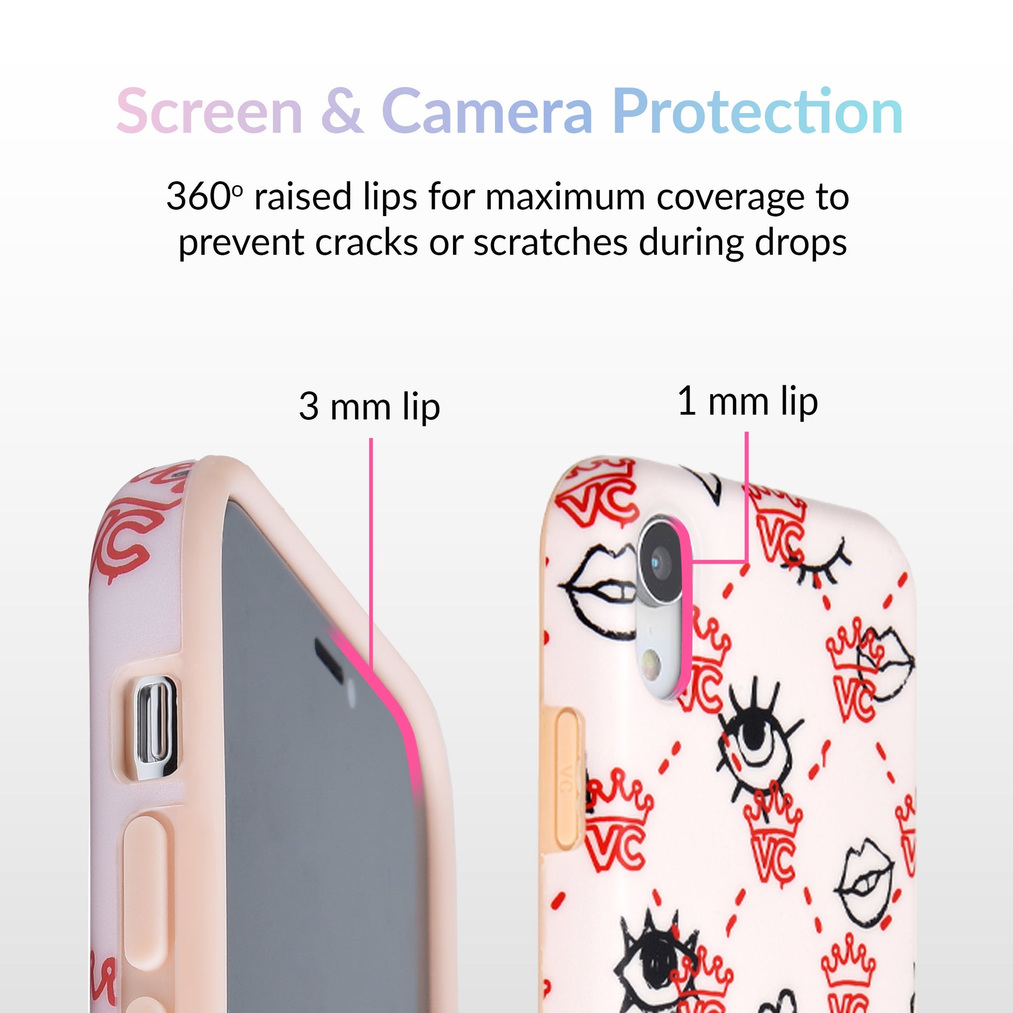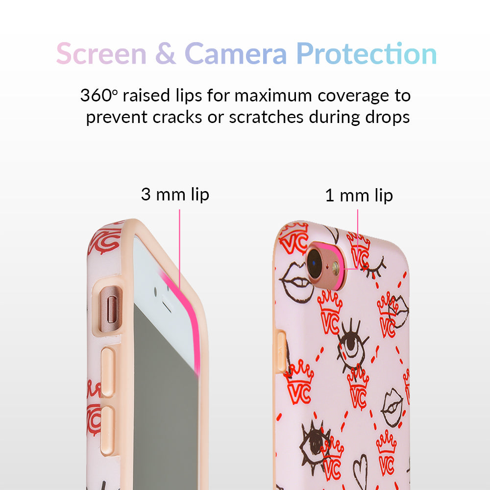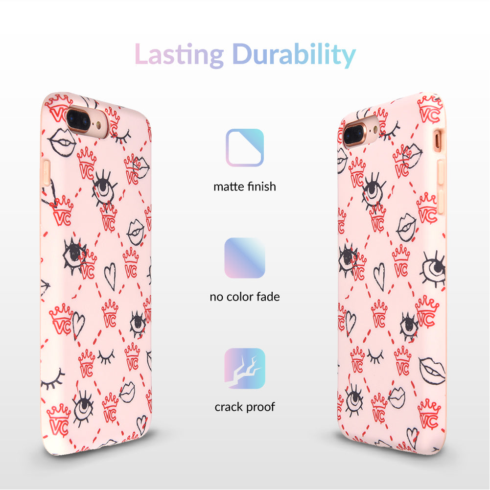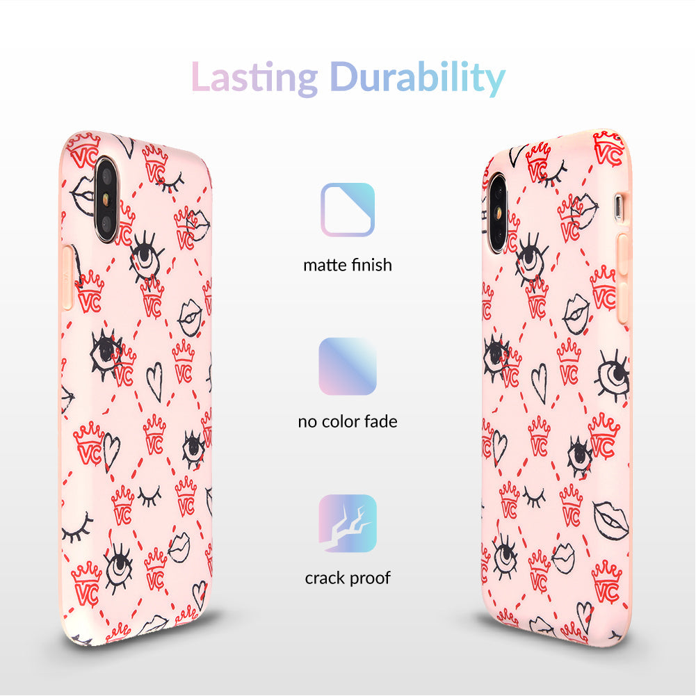 Meet Velvet Caviar's first limited edition phone case. Inspired by today's bold fashion pieces and bright colors. a nude matte case topped with a pattern of hand drawn eyes. lips. hearts. and VC icons.