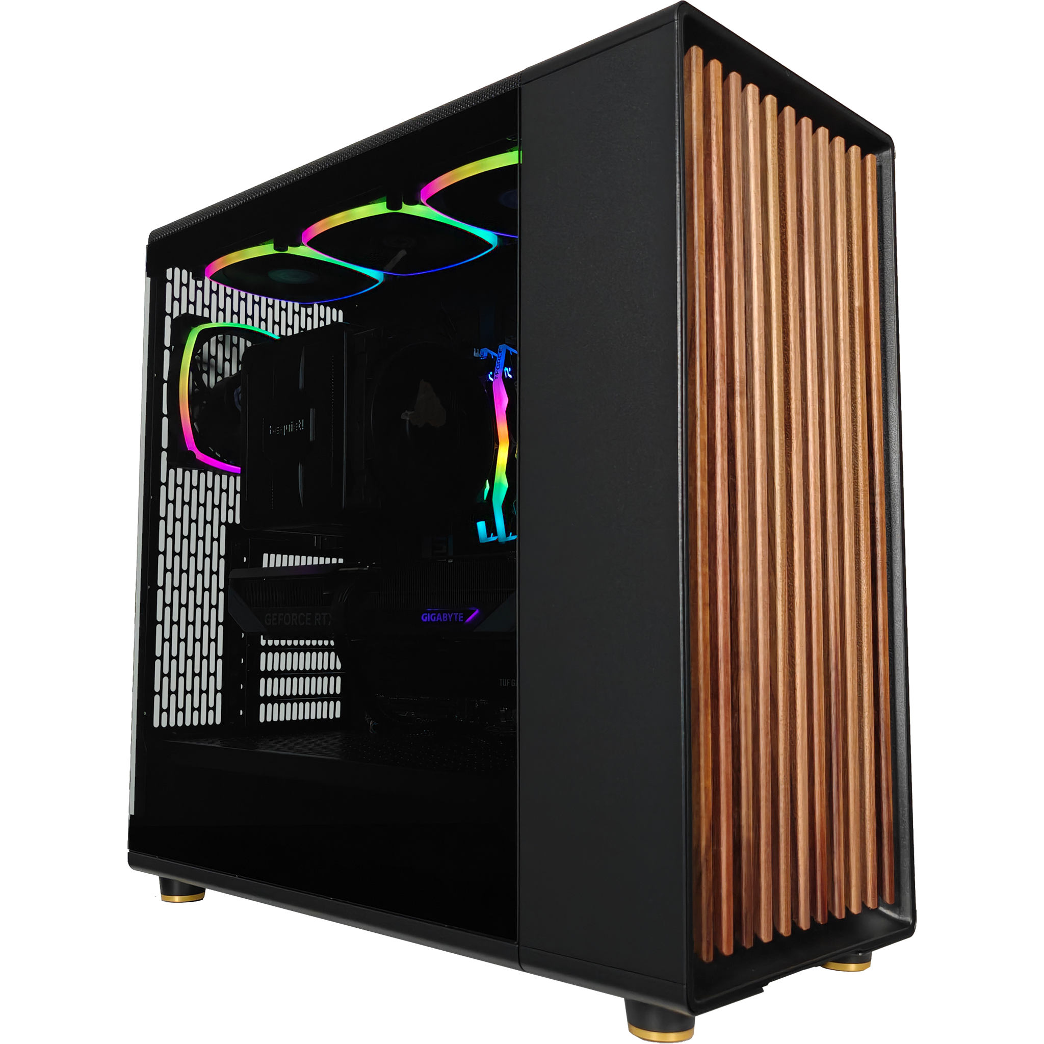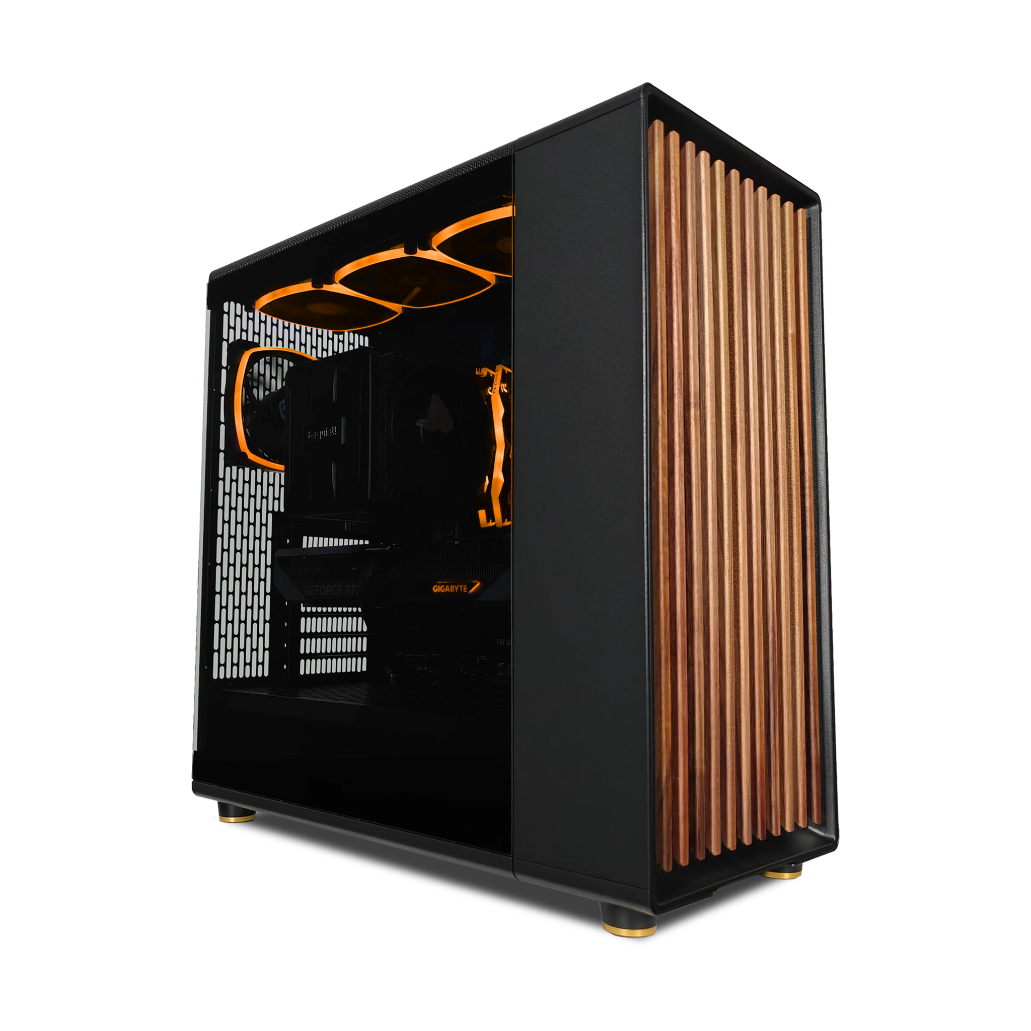 The North Pro redefines what a gaming PC can be. Designed with a natural aesthetic and built with eco-friendly materials. it's not just a powerhouse—it's a statement piece. Crafted with a real oak or walnut front. fine mesh ventilation. and sleek brass or steel accents. it blends seamlessly into any space. This is a gaming rig that doesn't just perform—it belongs in your setup like a piece of modern art.