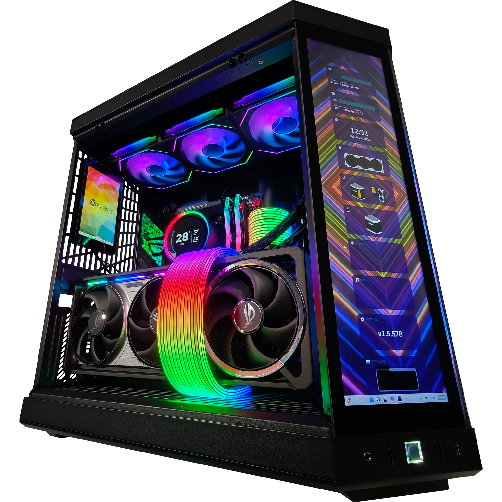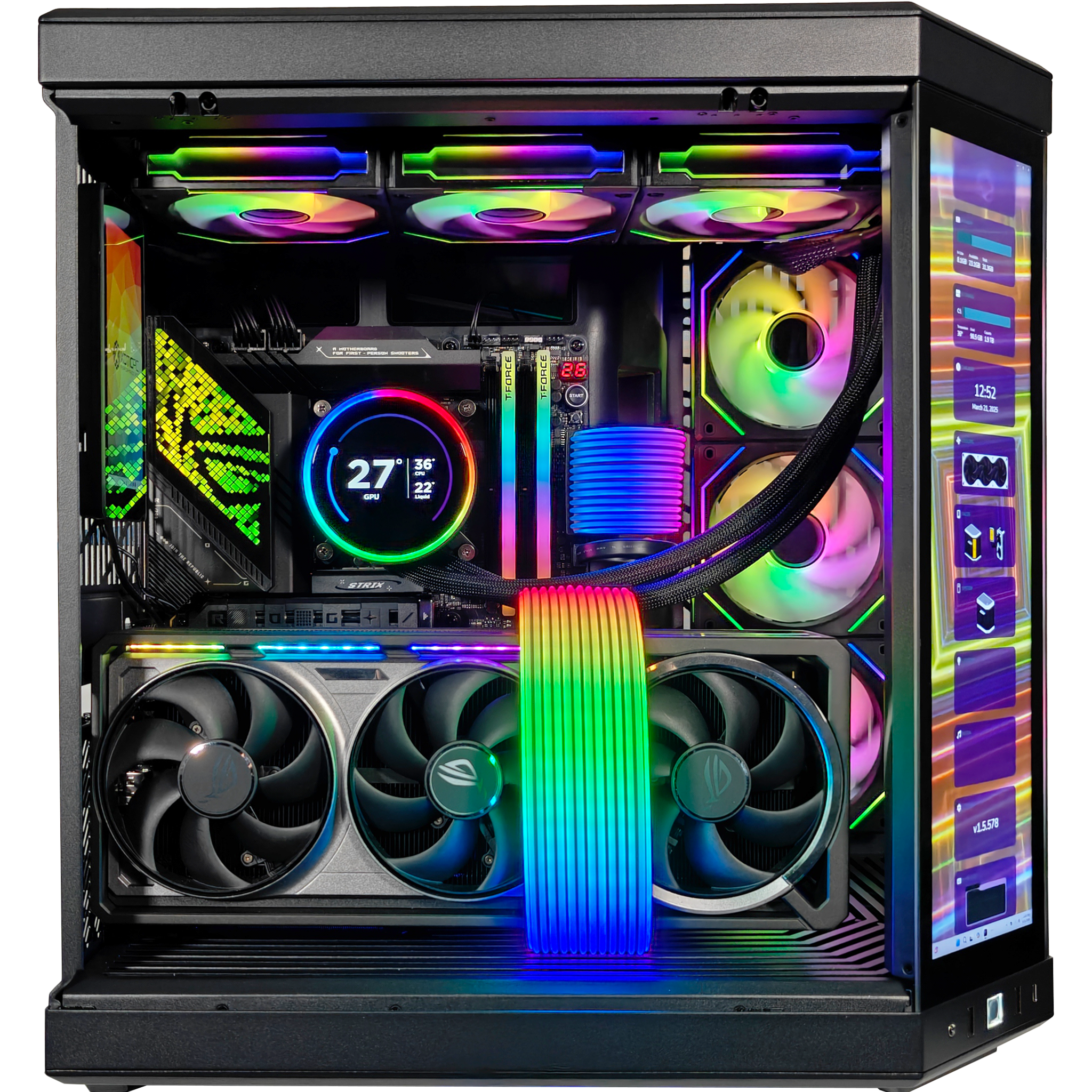 Cooling is king. and the Y70 delivers with its iconic Y-series ventilation system. 360mm AIO water cooling. and Lian Li SL RGB fans. ensuring peak efficiency under even the heaviest workloads. The ASUS ROG STRIX Z890-E GAMING WIFI motherboard provides next-level connectivity and overclocking potential. while 32GB of DDR5 6000MHz memory and a 2TB NVMe Gen 4 SSD keep load times virtually nonexistent.