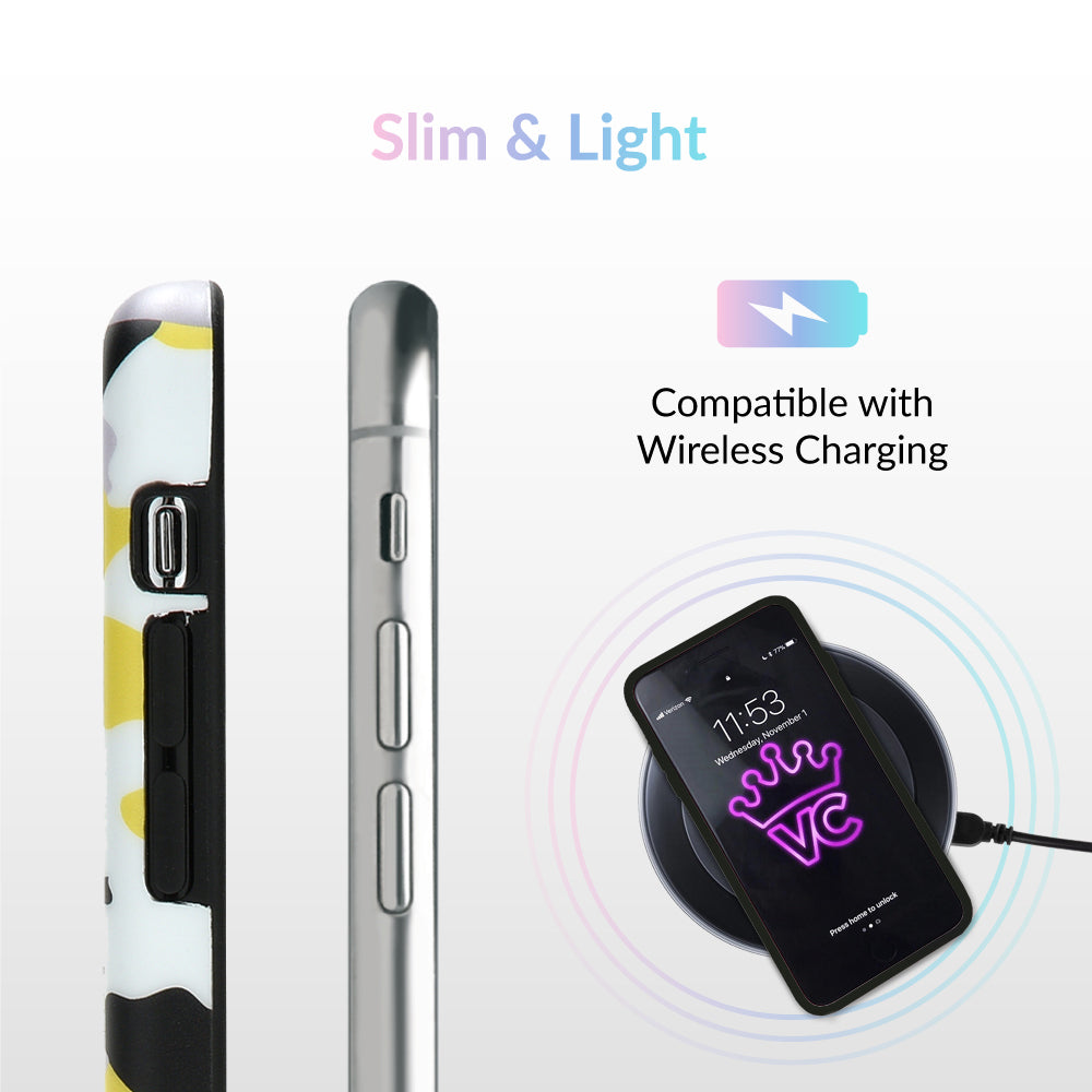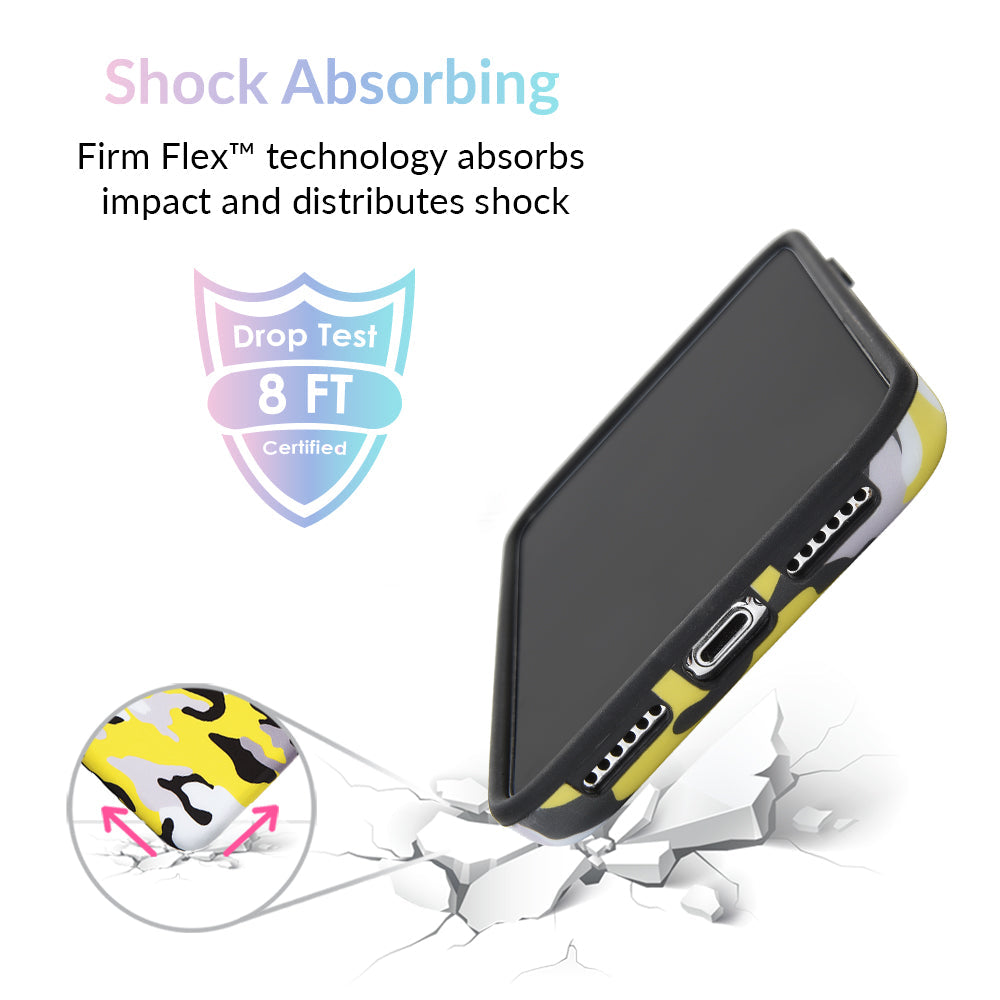 This protective case features a bright yellow camo print in a matte finish with a matching black bumper for added protection against drops.